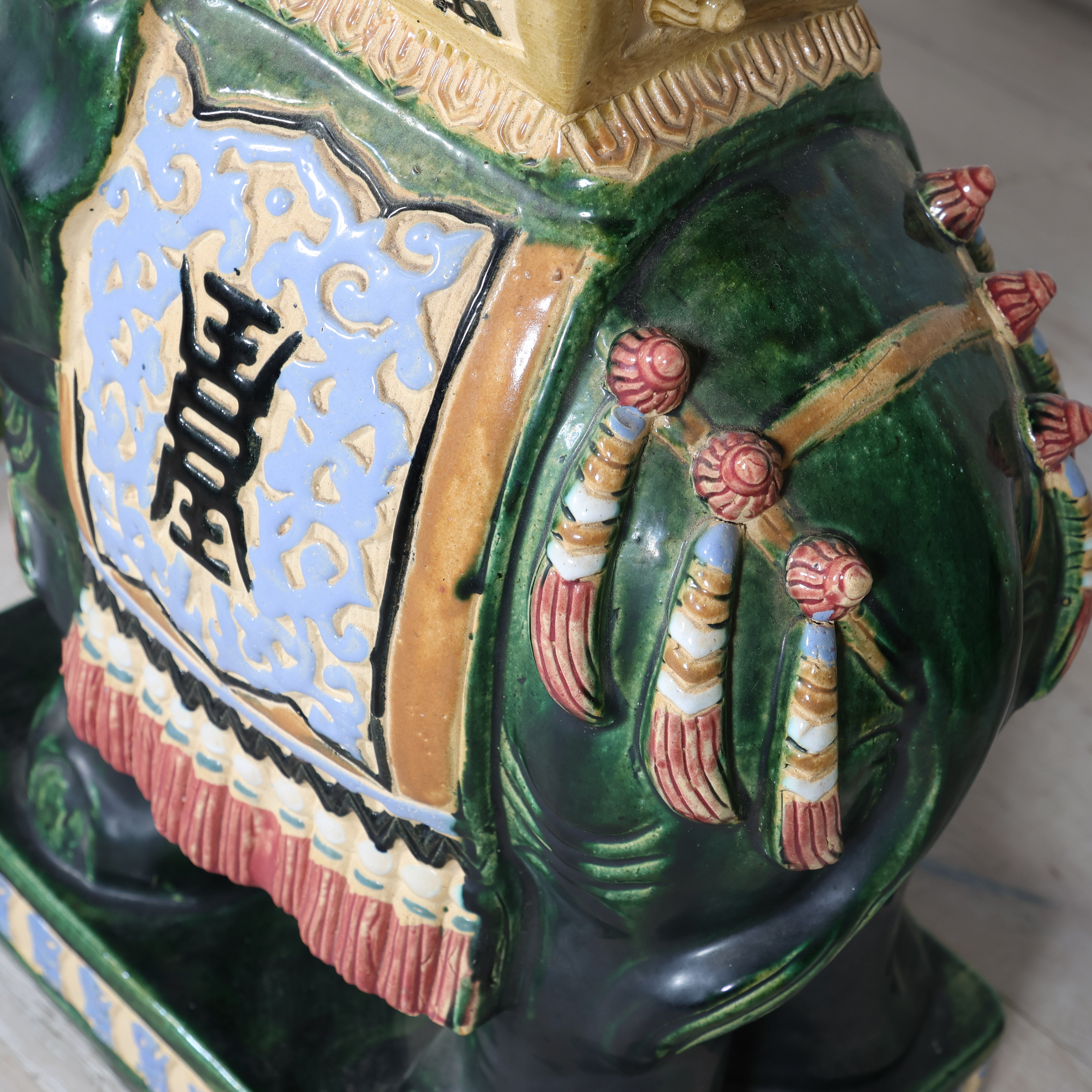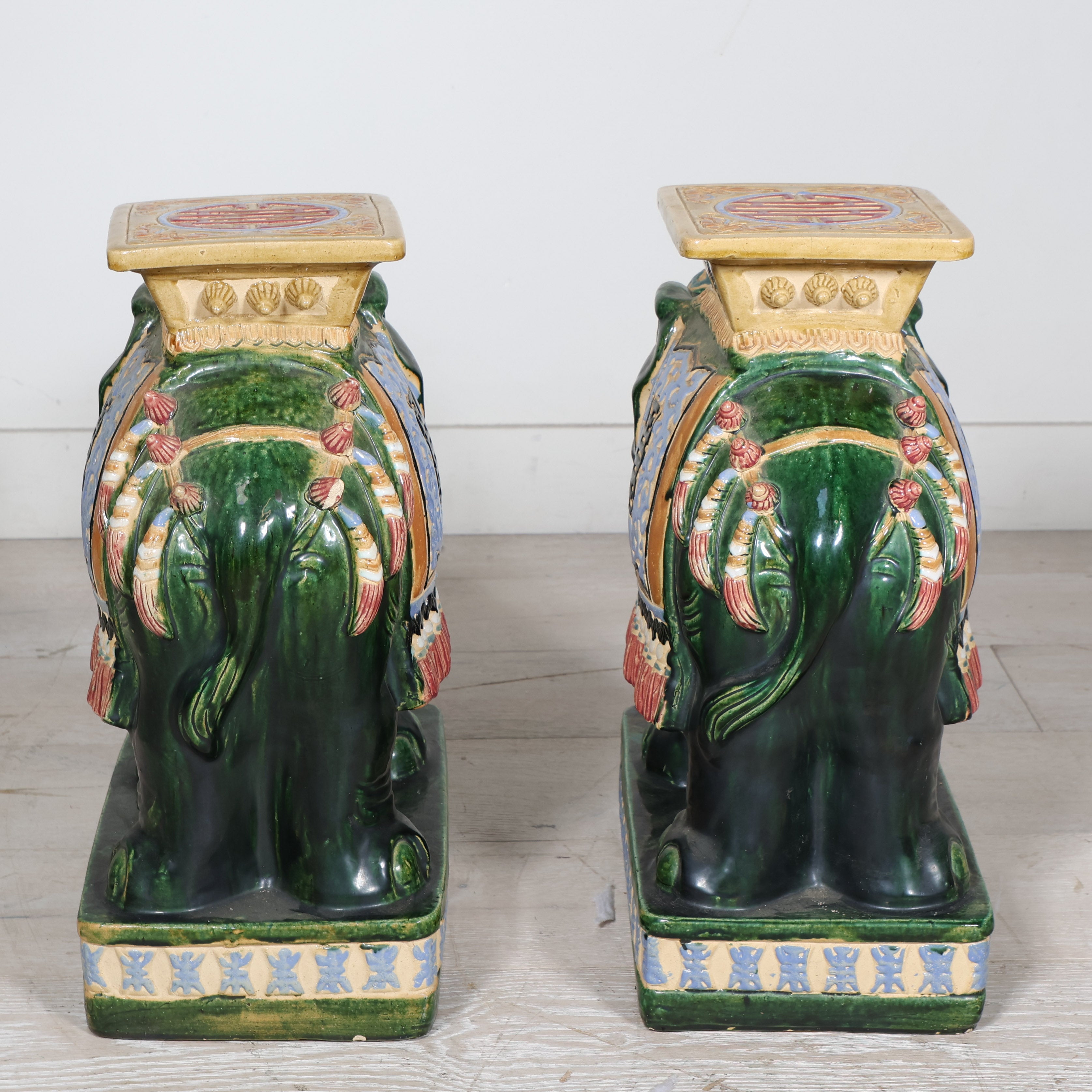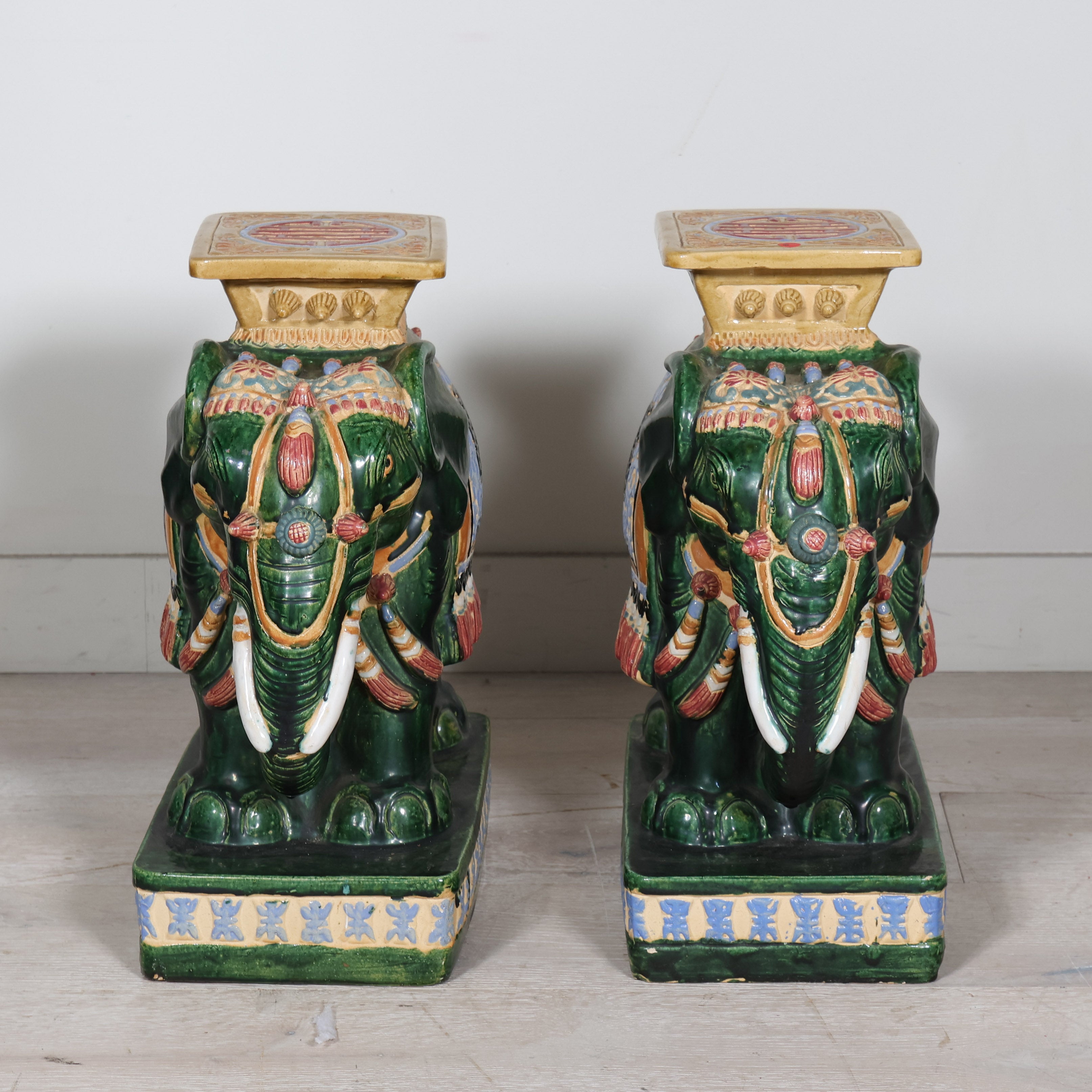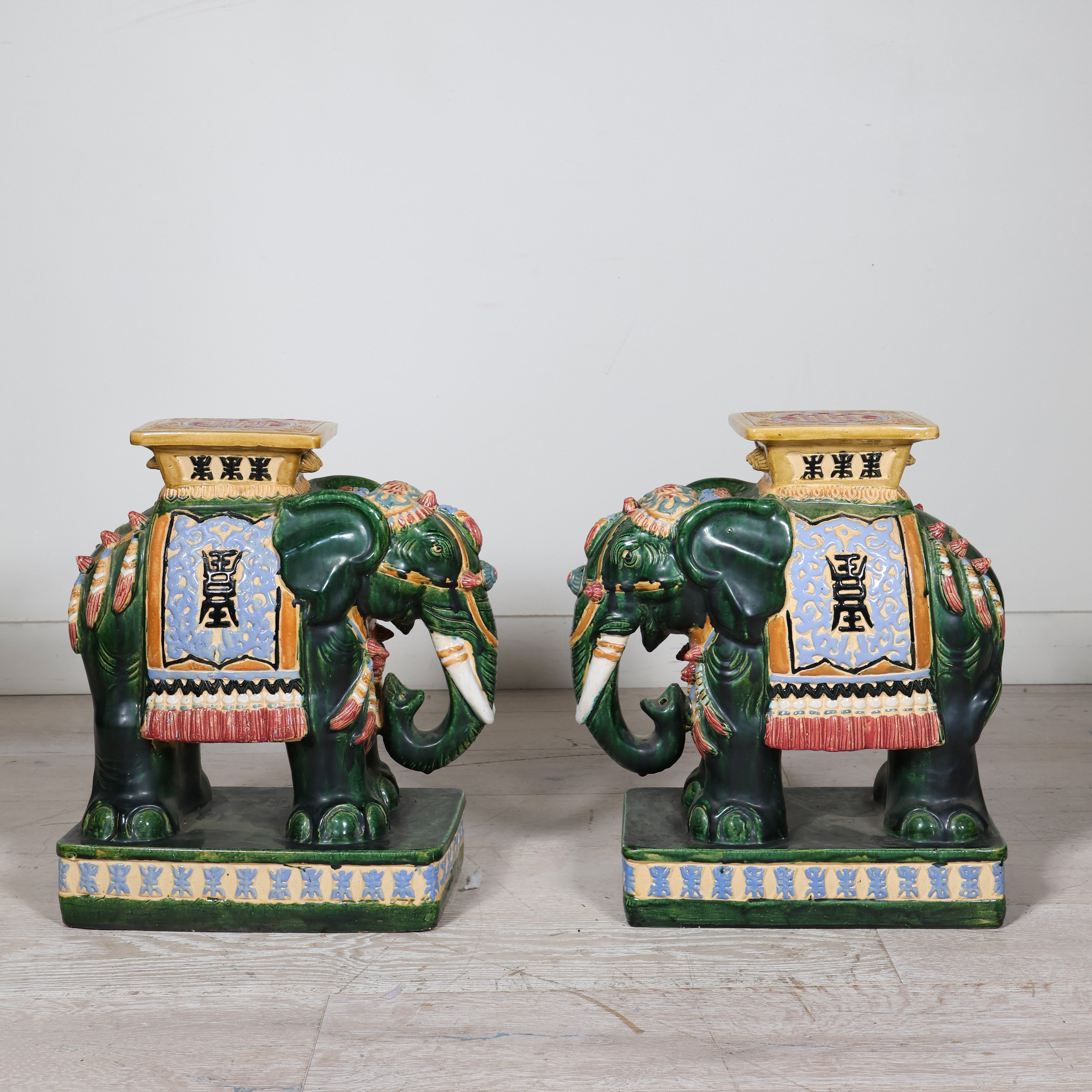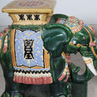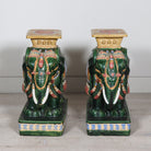 Rich emerald green bodies are accented with sky blue, saffron, and ivory detailing, highlighting the ornate saddle blankets and plinth tops. Each elephant stands firmly on a square base with a flat platform above, perfectly sized to function as a side table, drinks stand, or statement stool. The high-shine glaze enhances every carved detail, from the curved trunks and tusks to the decorative trim along the base.