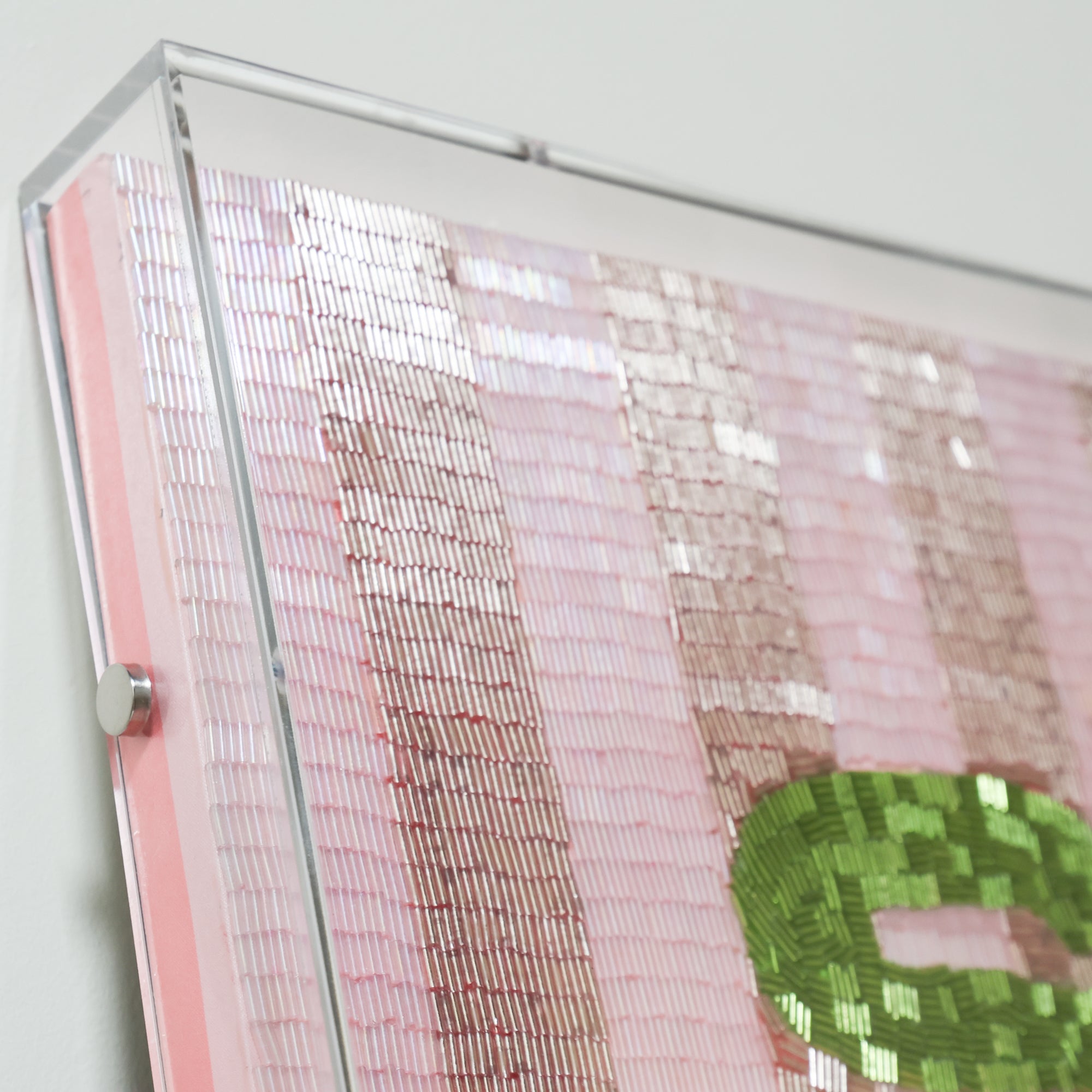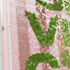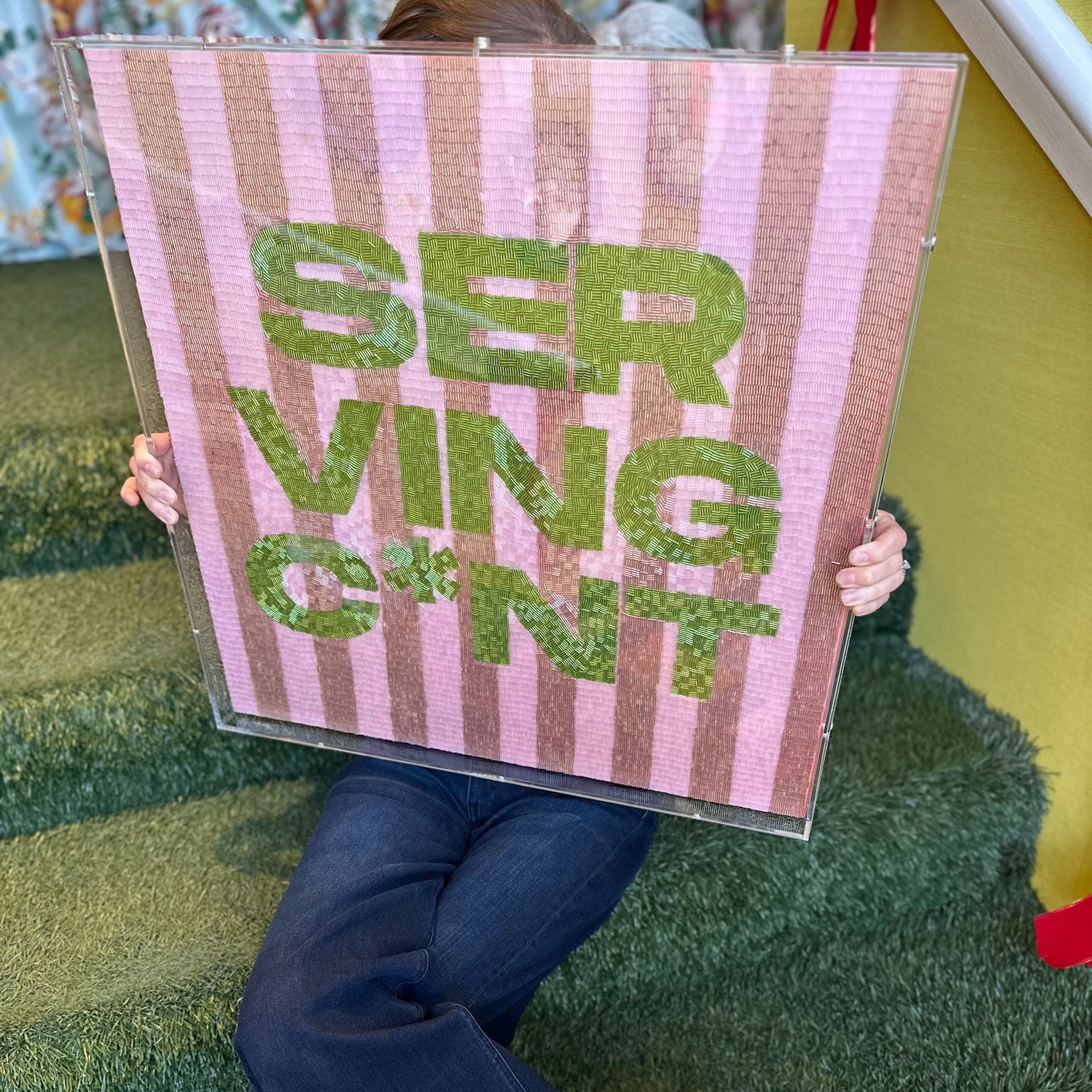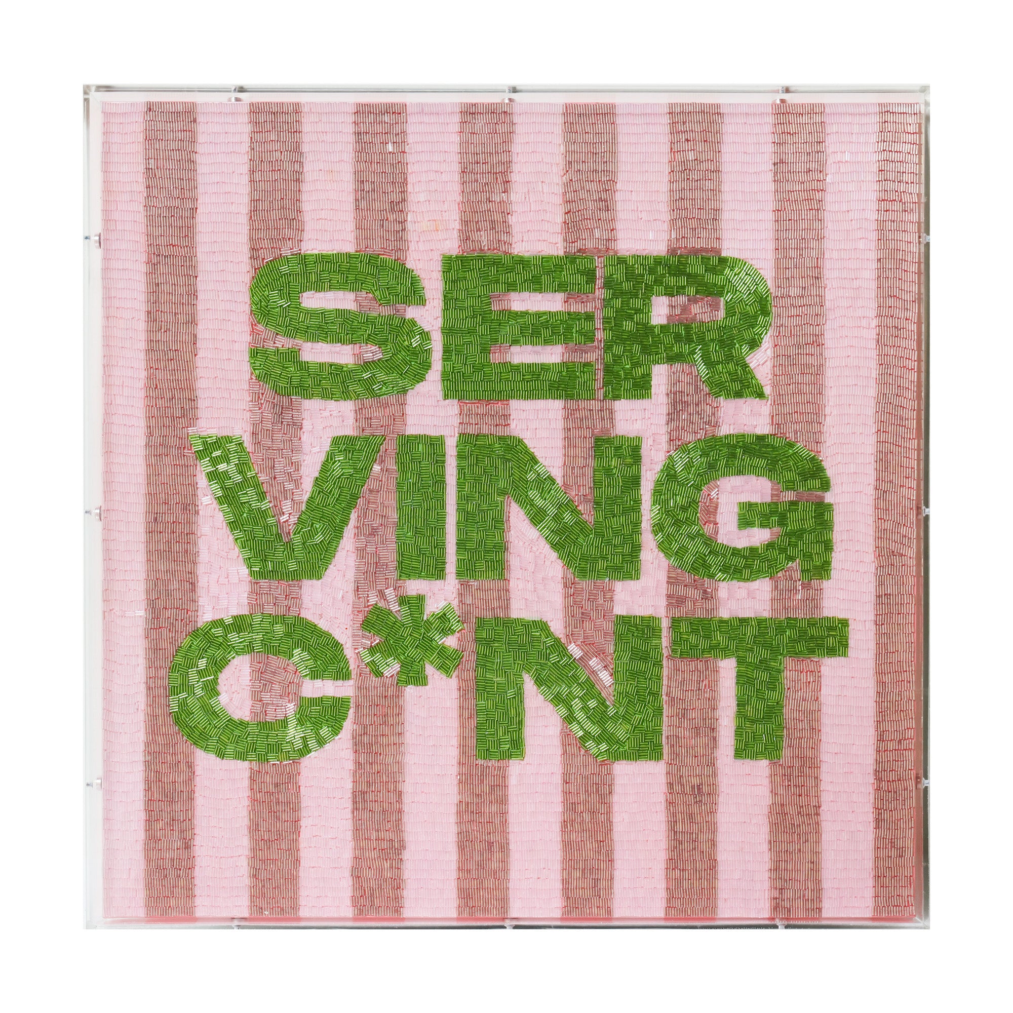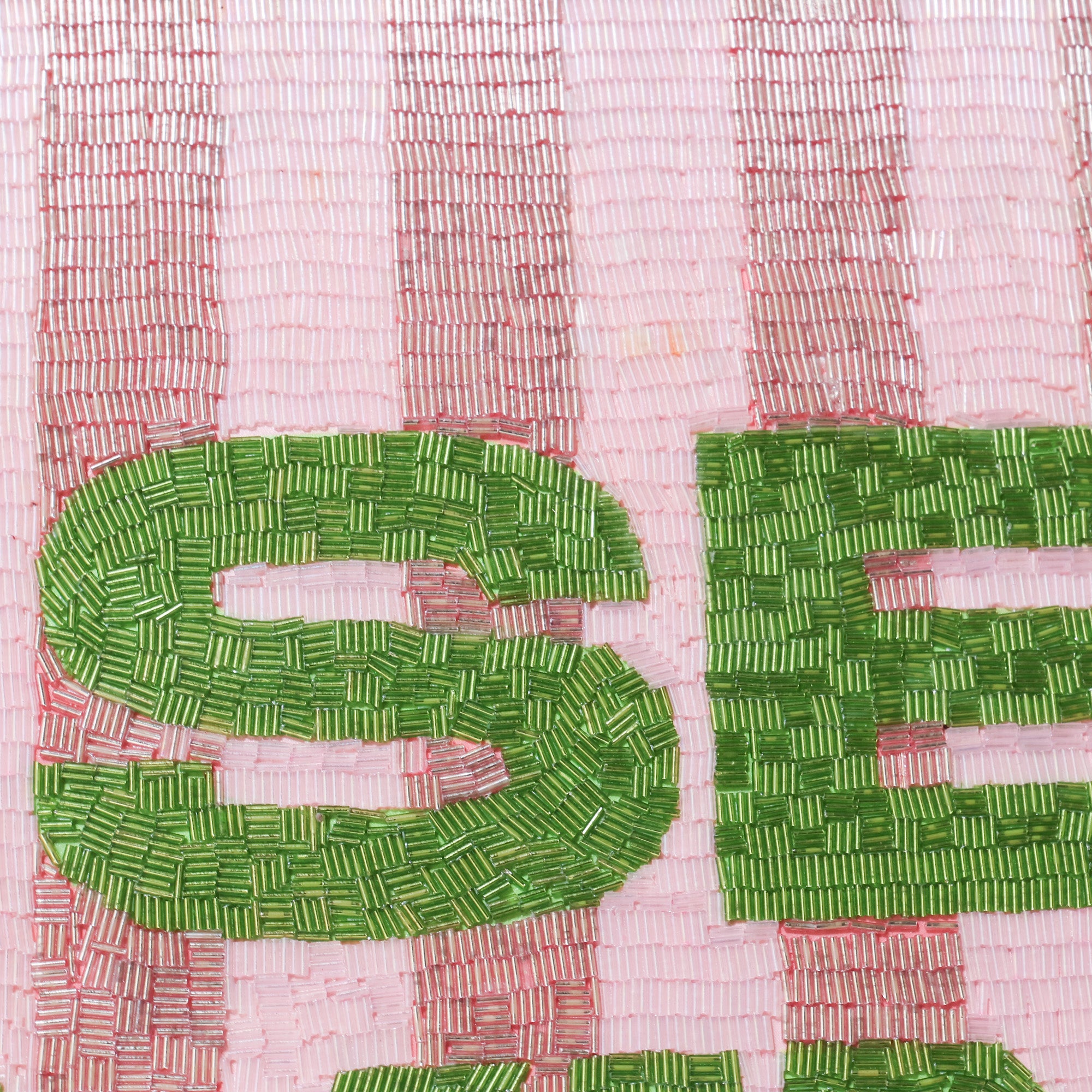 Meticulously hand-beaded with vibrant green lettering over a soft pink striped ground, this piece turns a loaded phrase into a confident declaration. It's not for everyone, and that's how we like it.