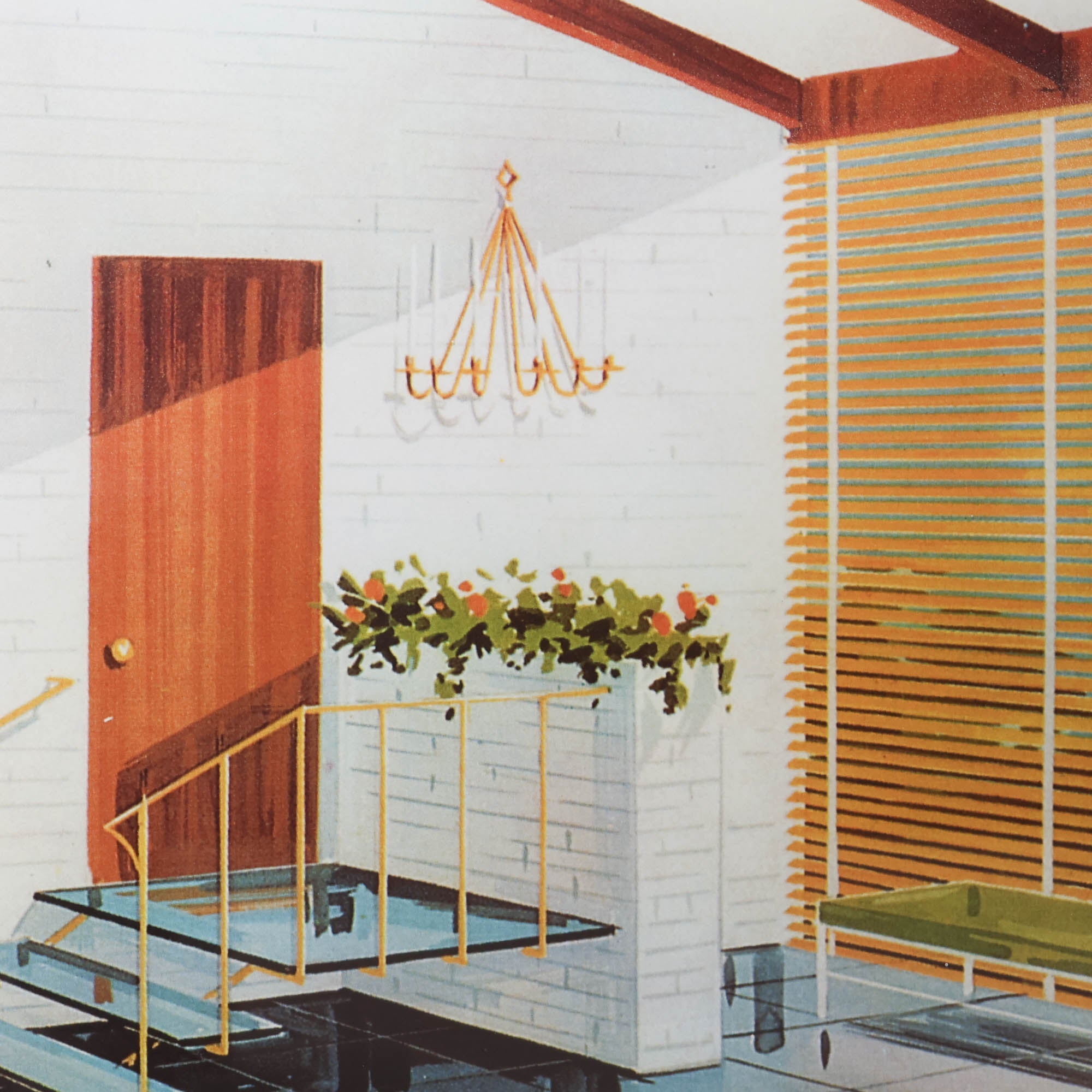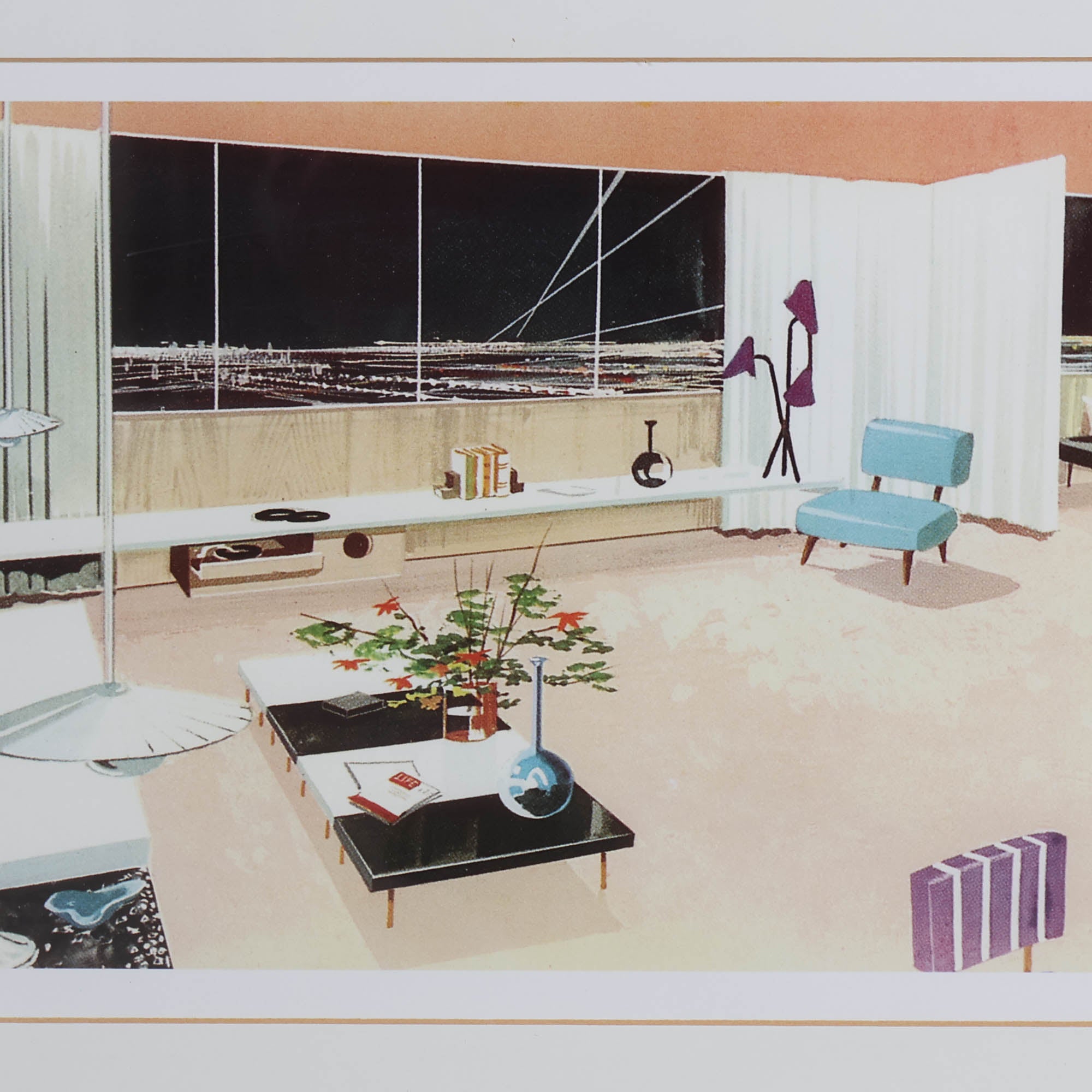 A striking set of four mid-century modern architectural renderings - each depicting a beautifully composed interior scene—complete with sleek furnishings, bold lines, retro colors to capture the spirit of mid-century design.