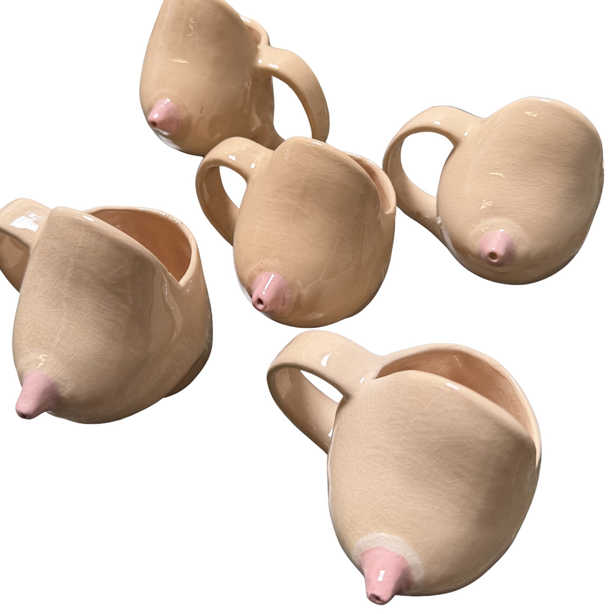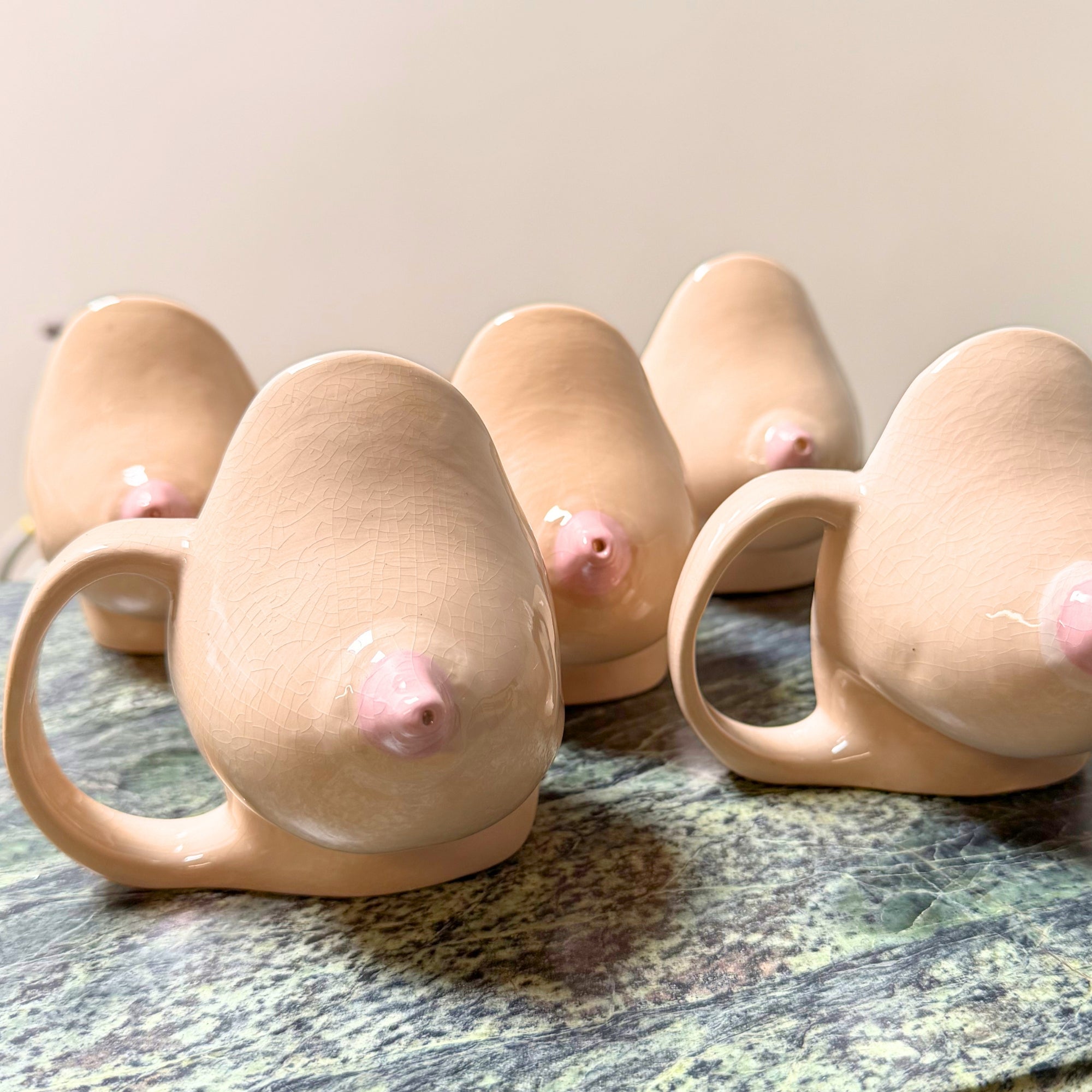 Playful, cheeky, and just the right amount of irreverent—this set of five vintage ceramic mugs turns everyday sipping into a conversation piece. Each mug is sculpted in a soft, rounded silhouette with a glazed nude finish and hand-formed detailing, complete with a blush-toned accent that gives them their signature wink.