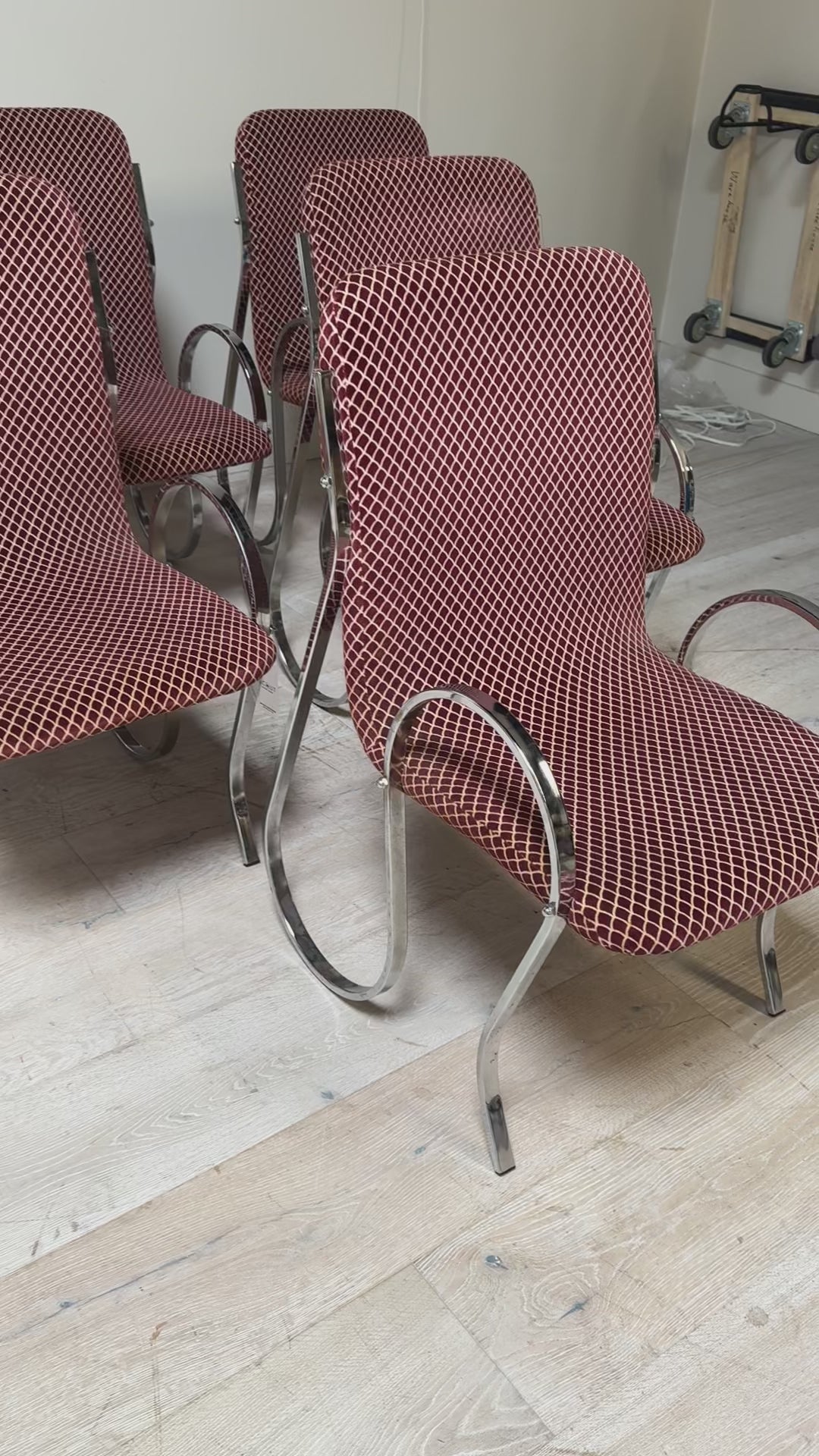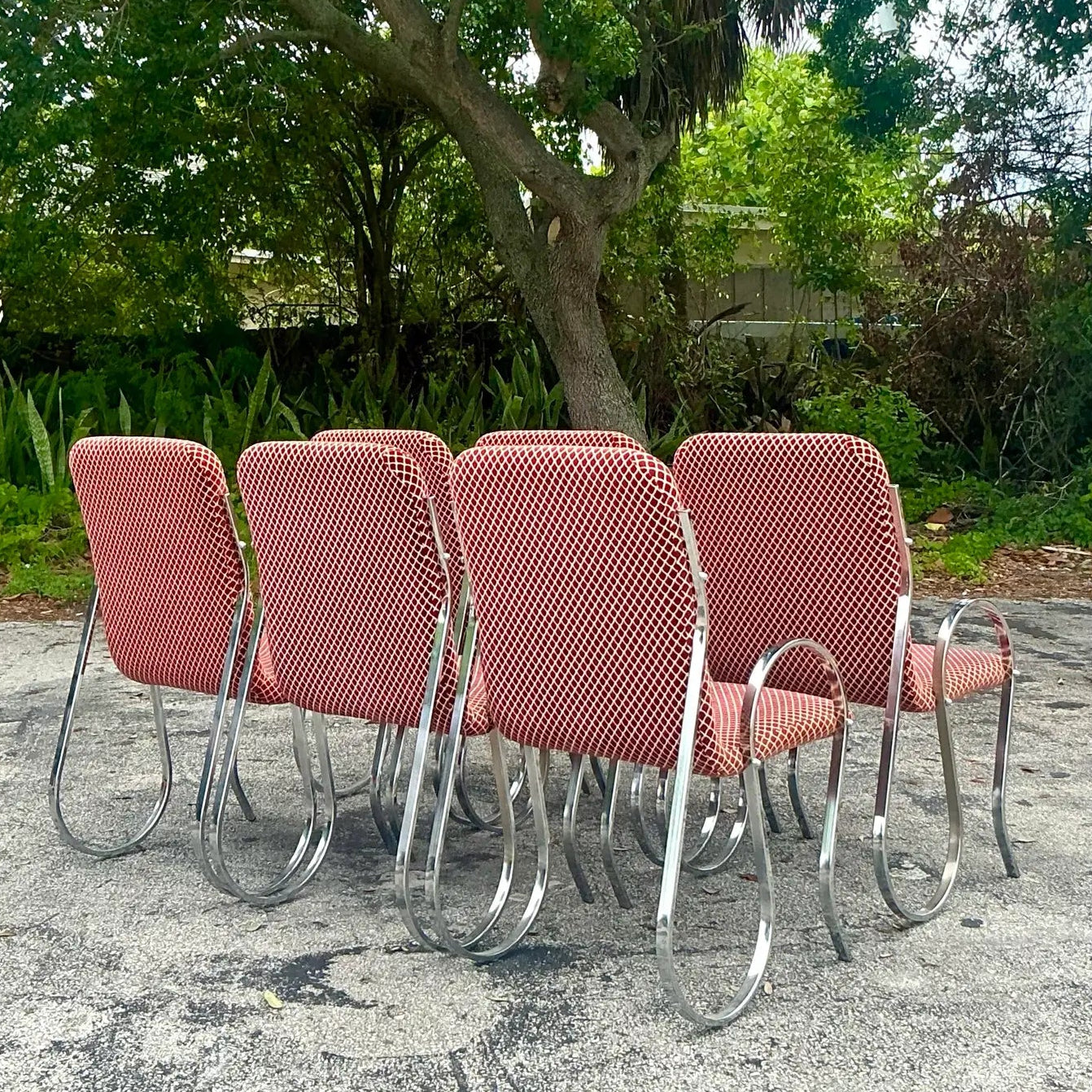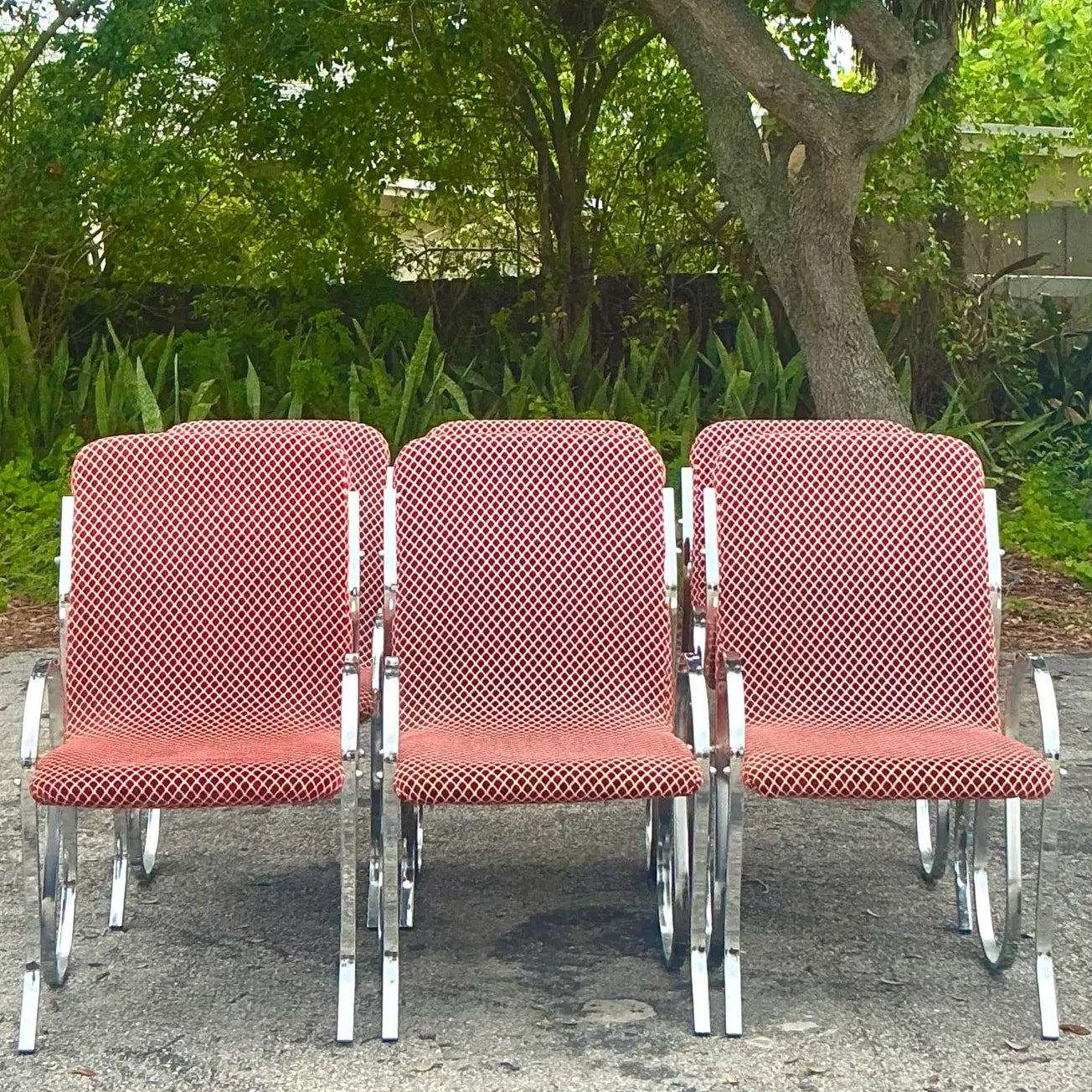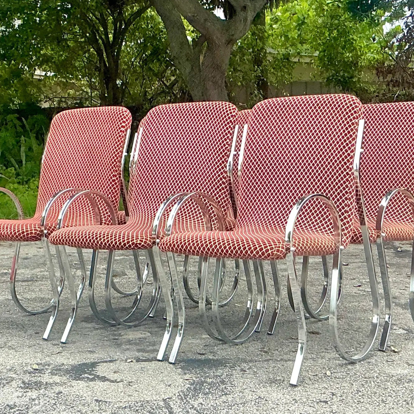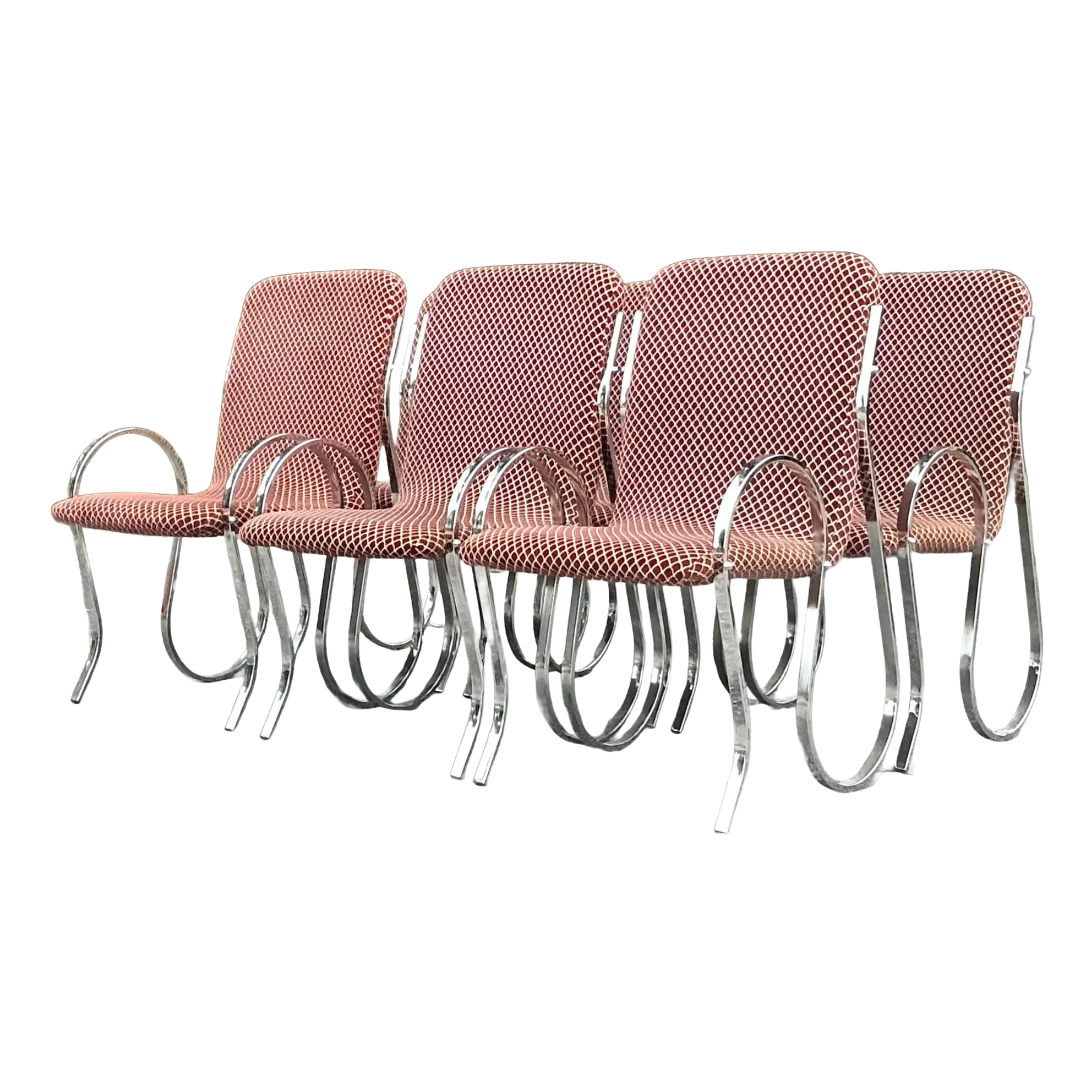 The sculptural chrome “squiggle” frames are both striking and supportive, while the terracotta-and-cream geometric upholstery adds rich visual texture. Each chair is a statement piece—perfect for elevating a dining room, creative workspace, or eclectic living area with vintage character and undeniable style. In great condition.