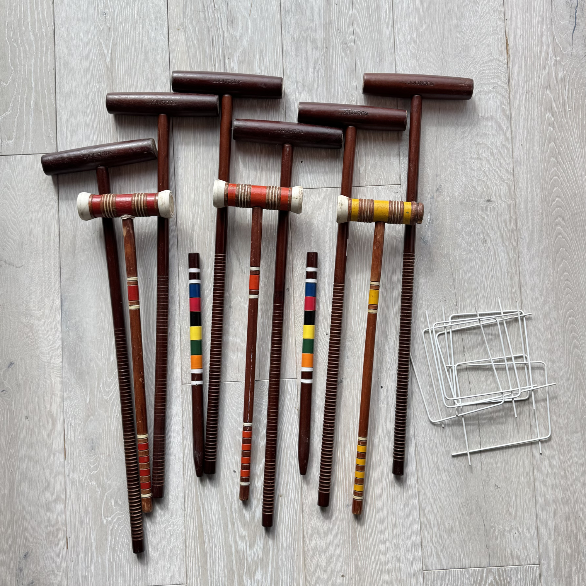 Vintage set of assorted croquet mallets that's been well-loved and used over the years. We adore the eye-catching colors and imagining the unique history of this set.