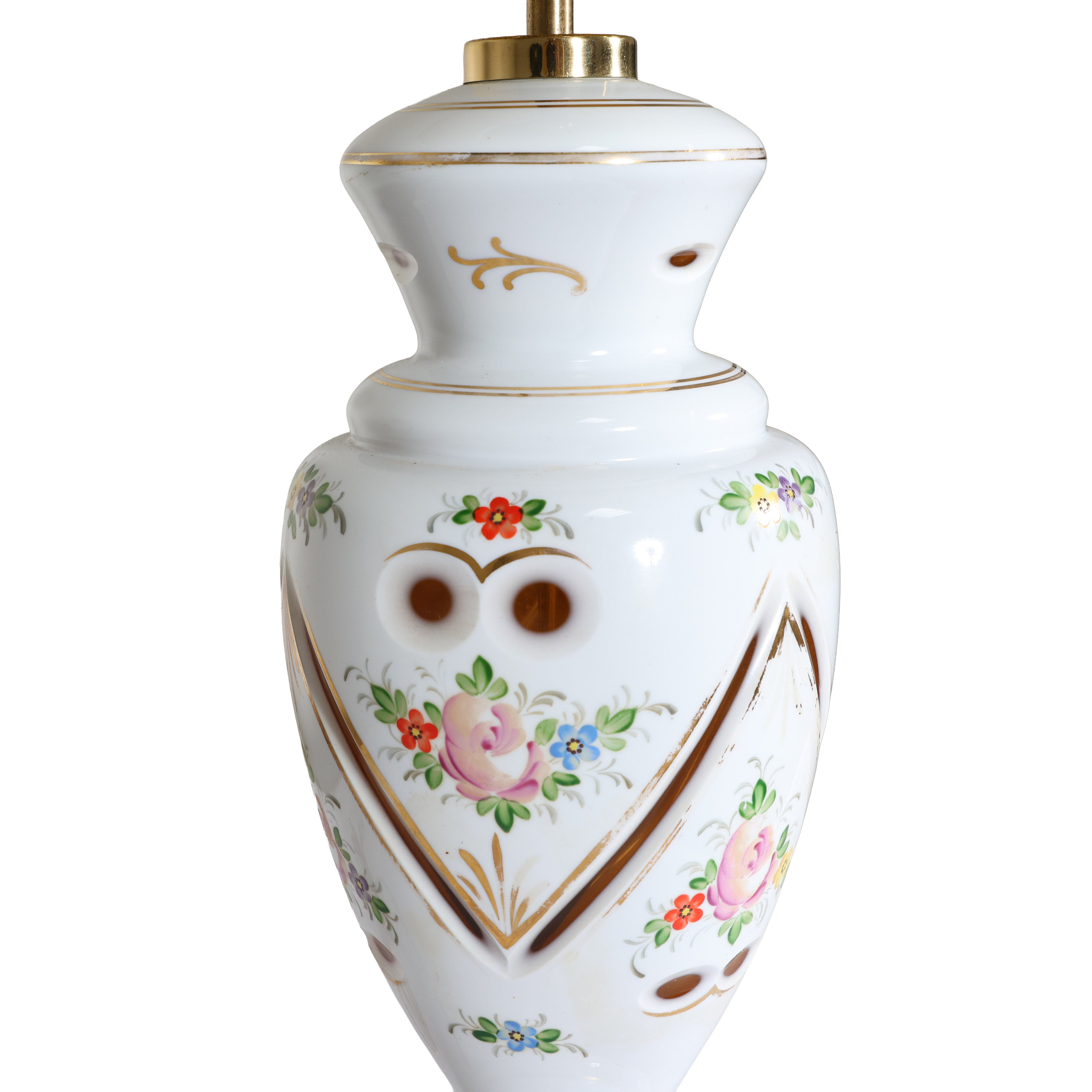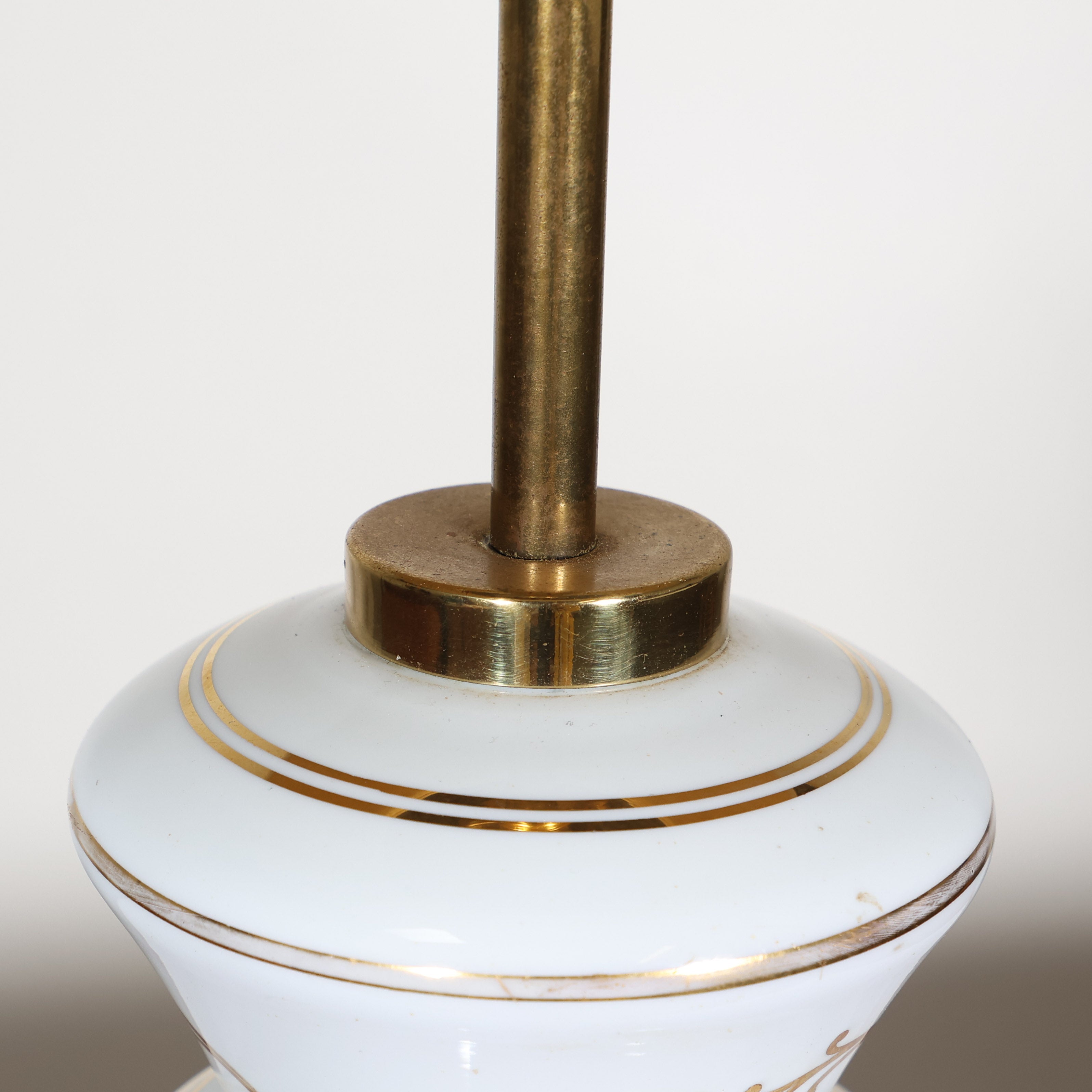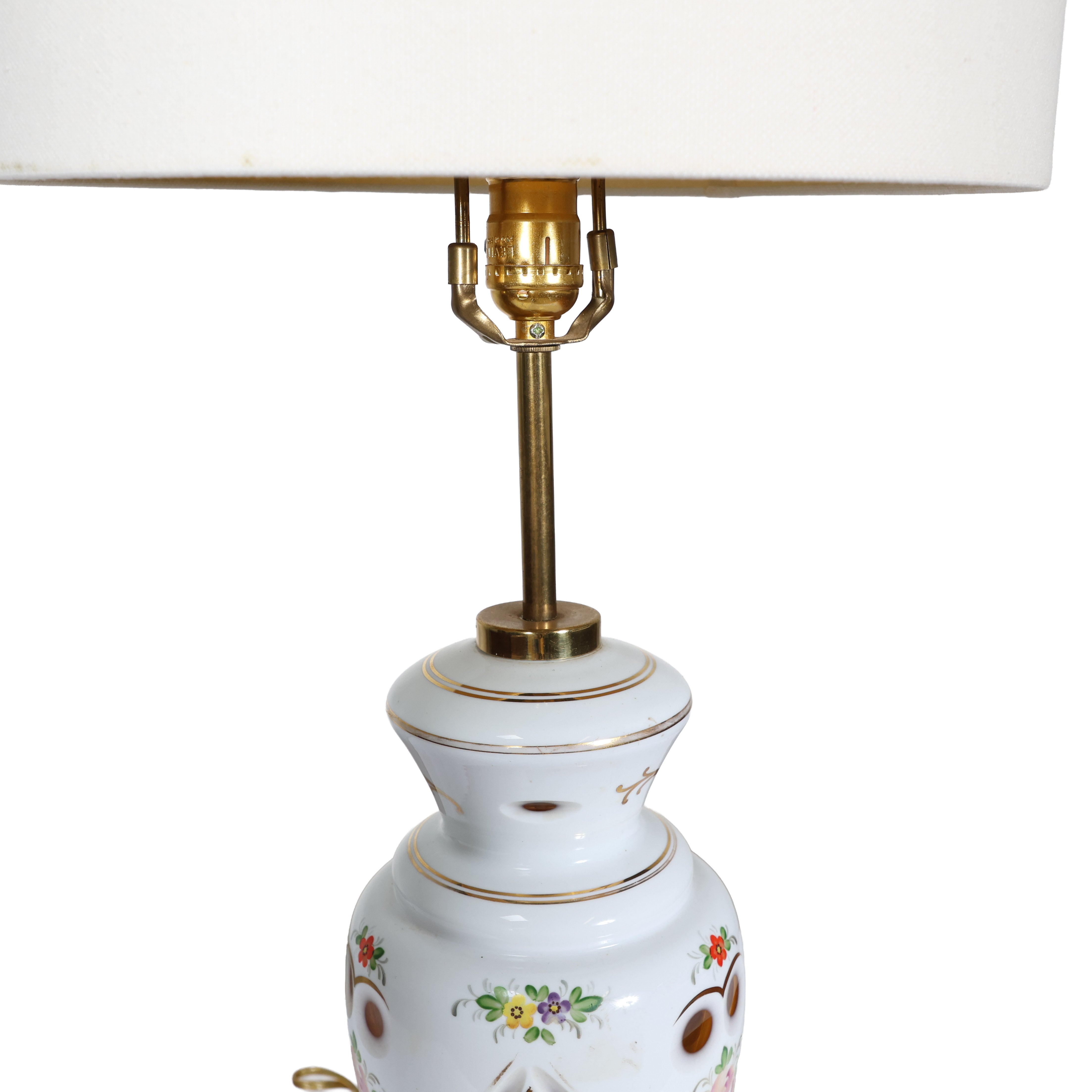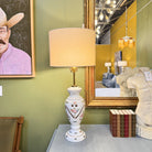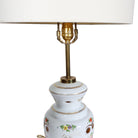 This vintage ceramic lamp features delicate hand-painted florals, warm brass details, and an ivory linen shade that keeps the look crisp and current.