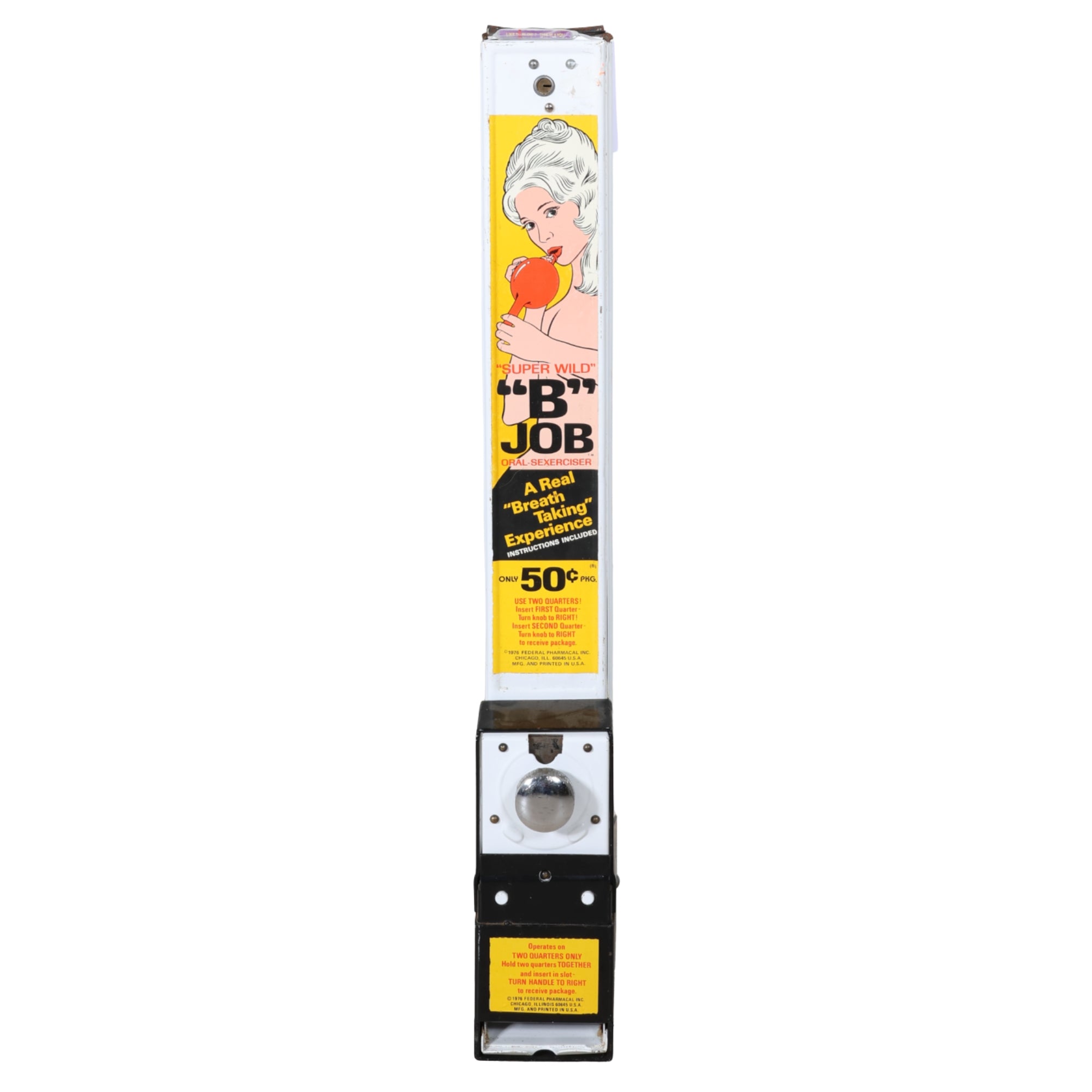 A wonderfully cheeky piece of vintage novelty history. This coin-operated “Super Wild B Job” machine was originally designed as a tongue-in-cheek adult gag dispenser, featuring bright pop graphics and bold retro typography that perfectly capture the humor and kitsch of the era.