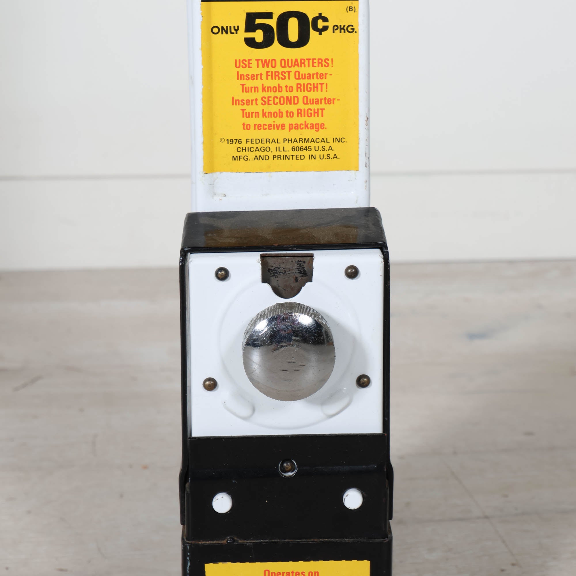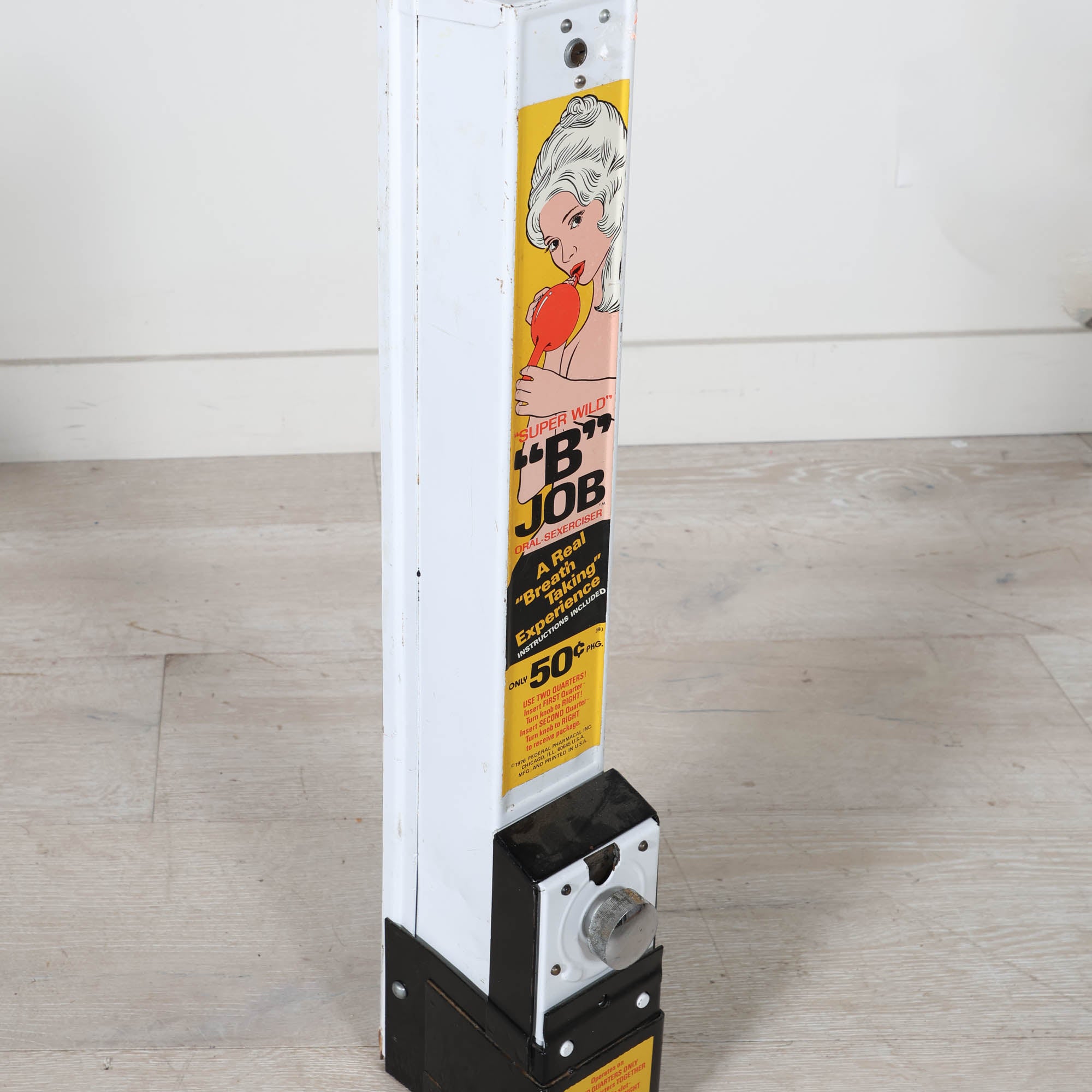 The tall, narrow metal cabinet showcases its original illustrated panel and classic coin-op mechanism, making it as much a piece of graphic pop art as it is a collectible vending machine. Equal parts playful and provocative, it’s the kind of object that instantly becomes a conversation starter.