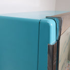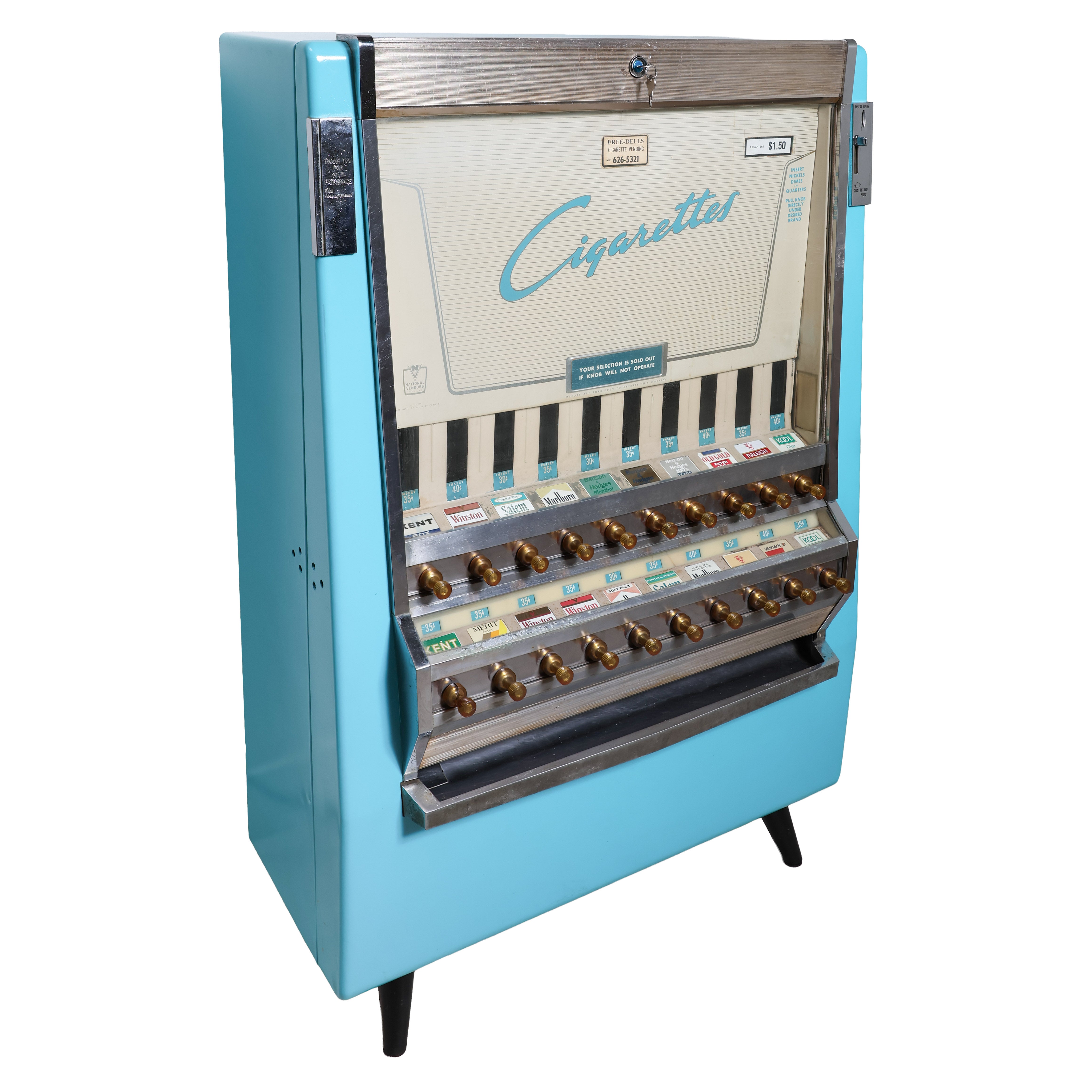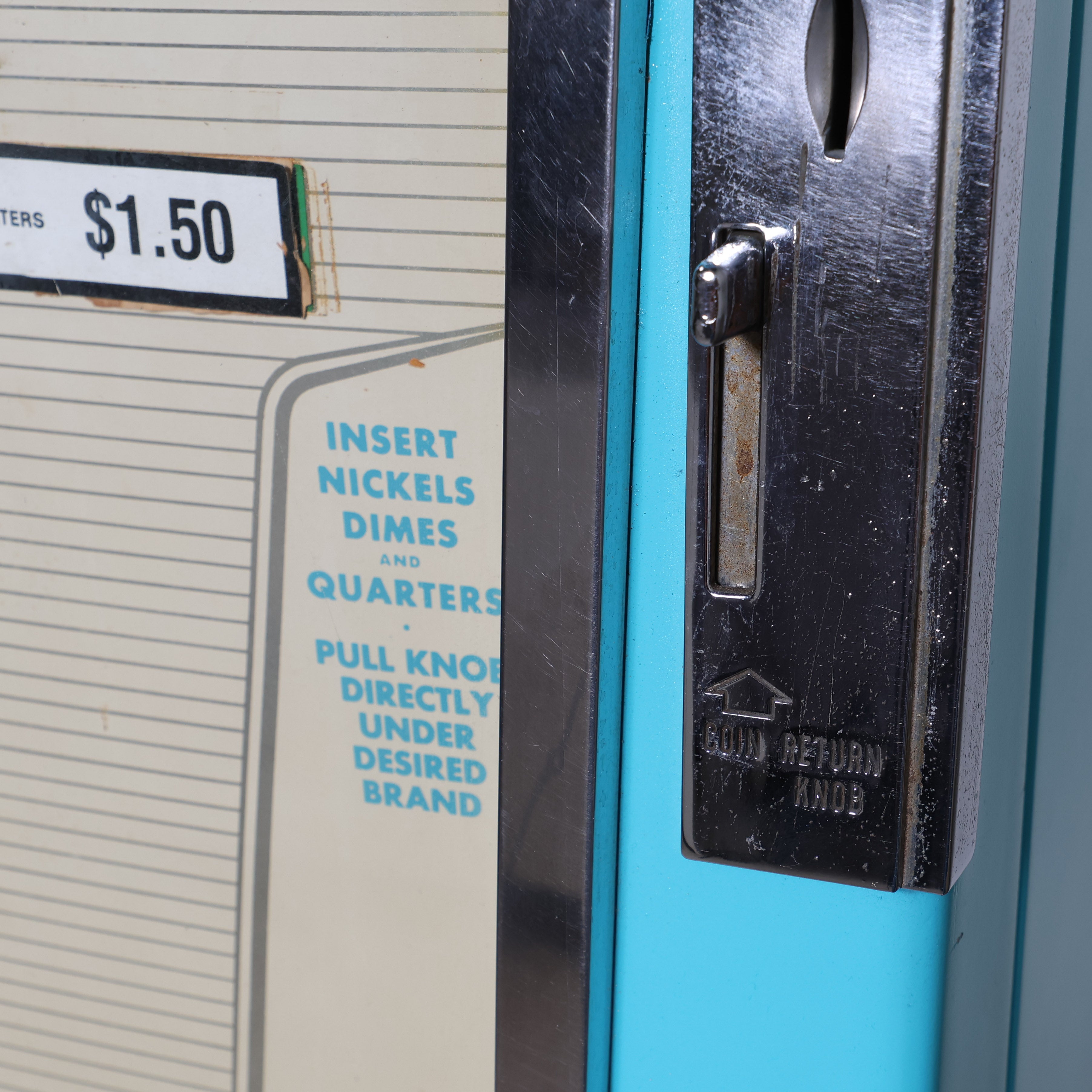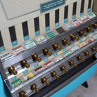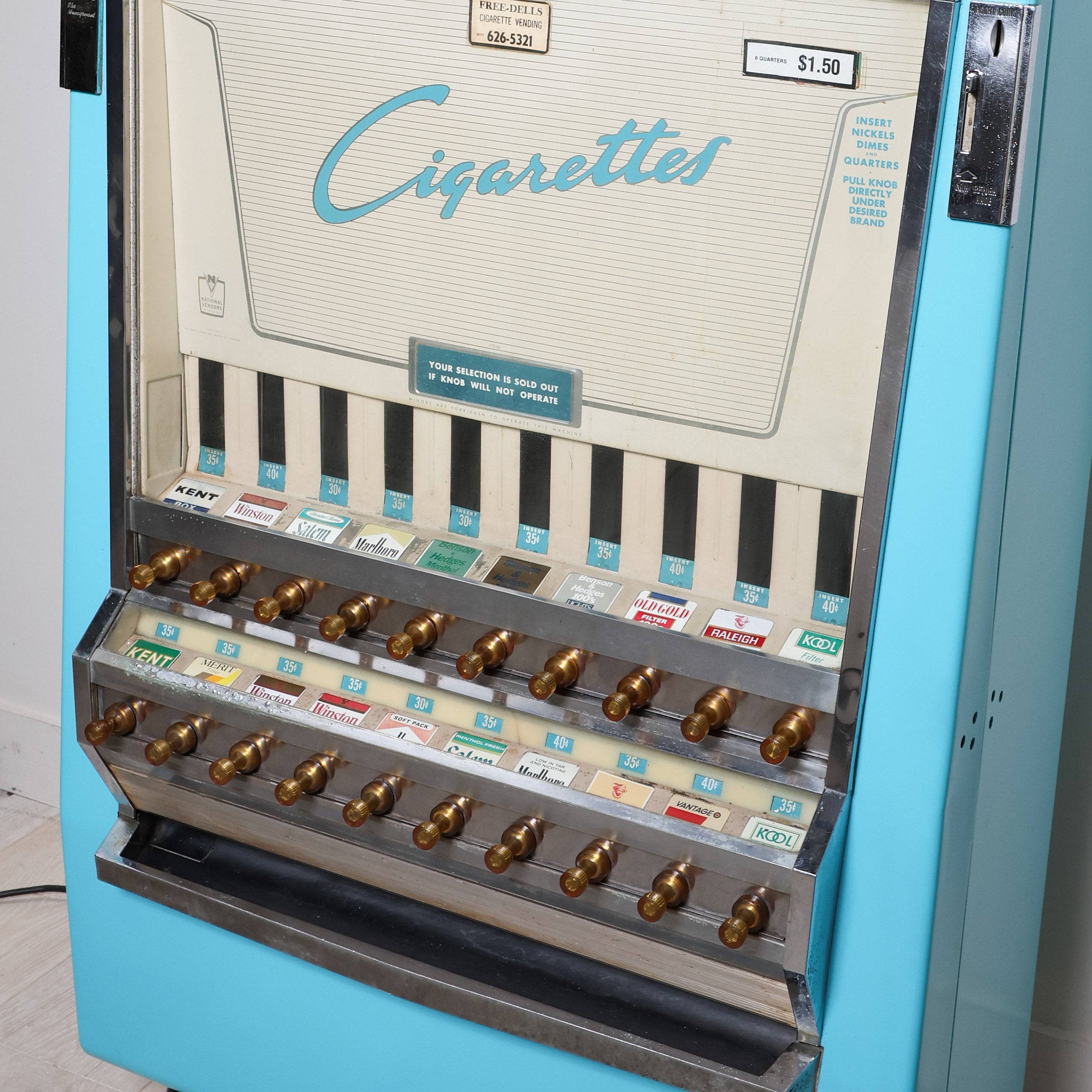 Vintage cigarette dispenser that doubles as a unique statement piece - you definitely won't see this one next door! Features a glossy turquoise body, chrome detailing, and rows of brass pull knobs with original brand labels intact.