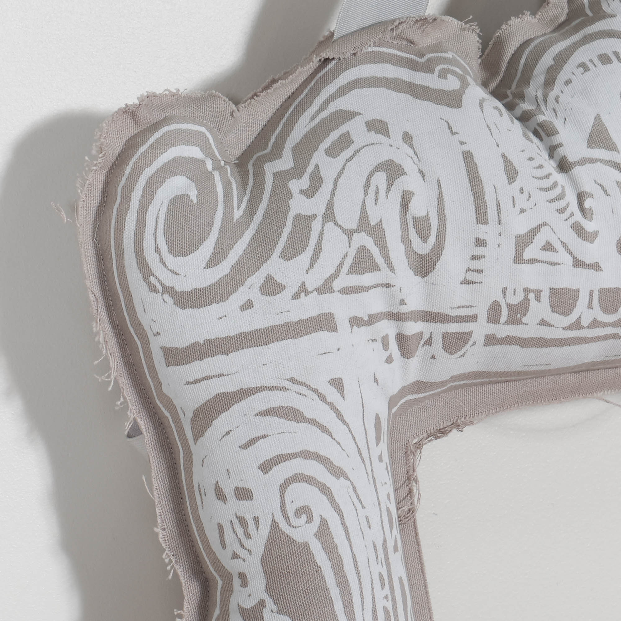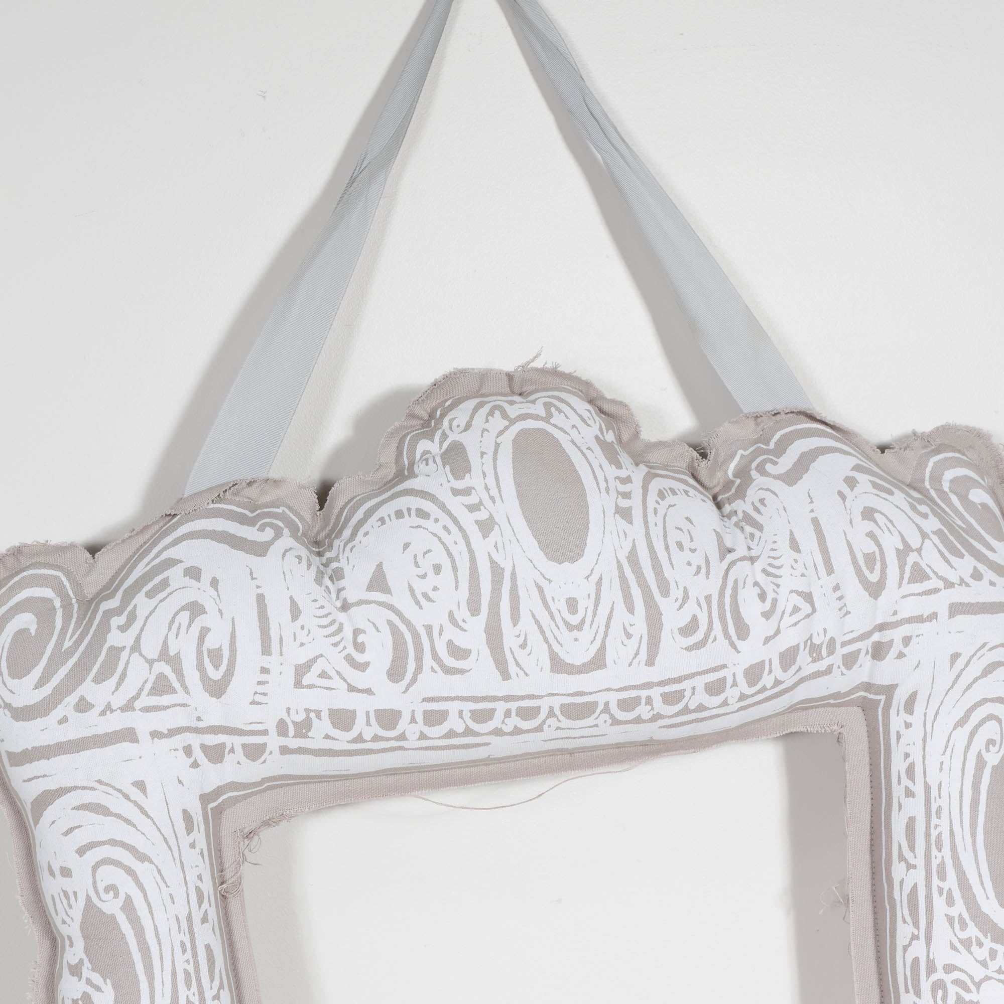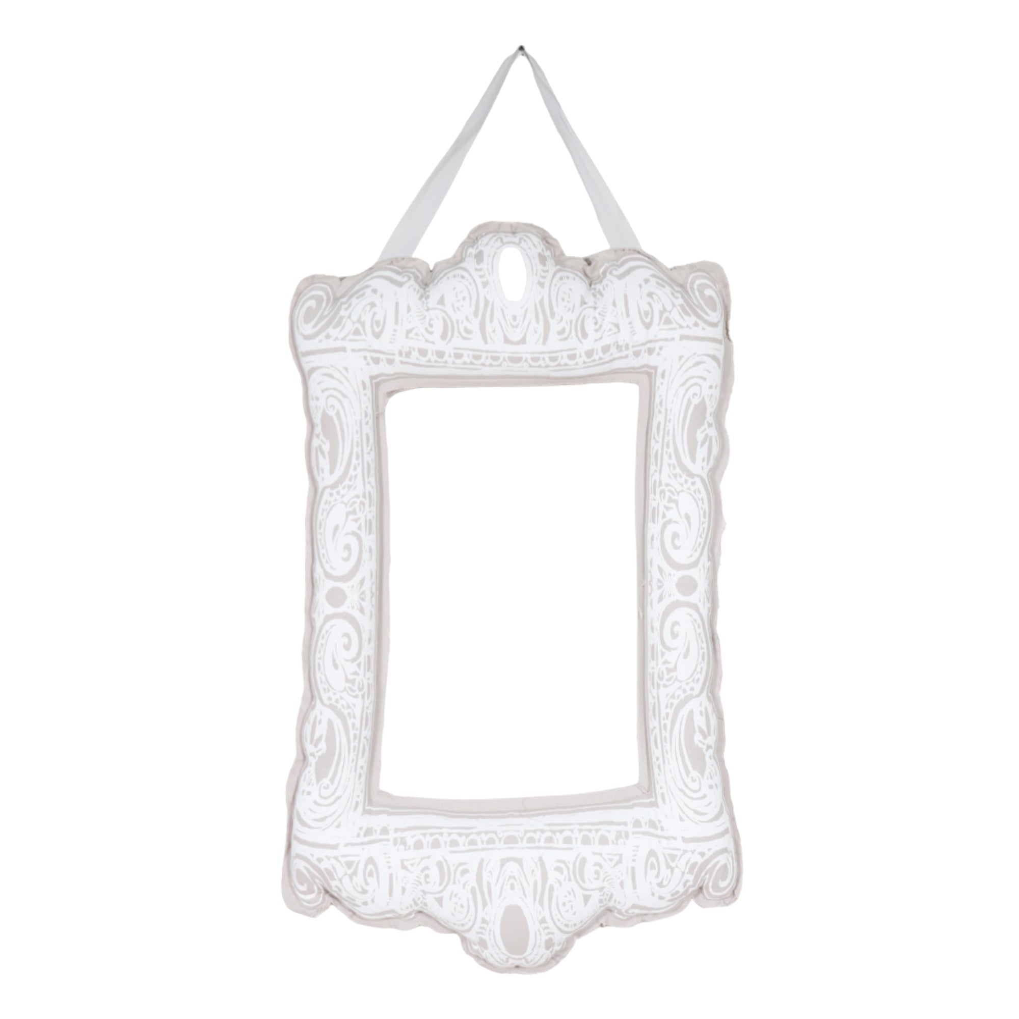 Designed to hang from its fabric ribbon, the piece functions as both wall art and a frame—perfect for displaying photos, notes, or small artwork in an unexpected way.