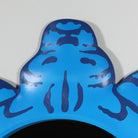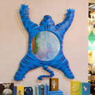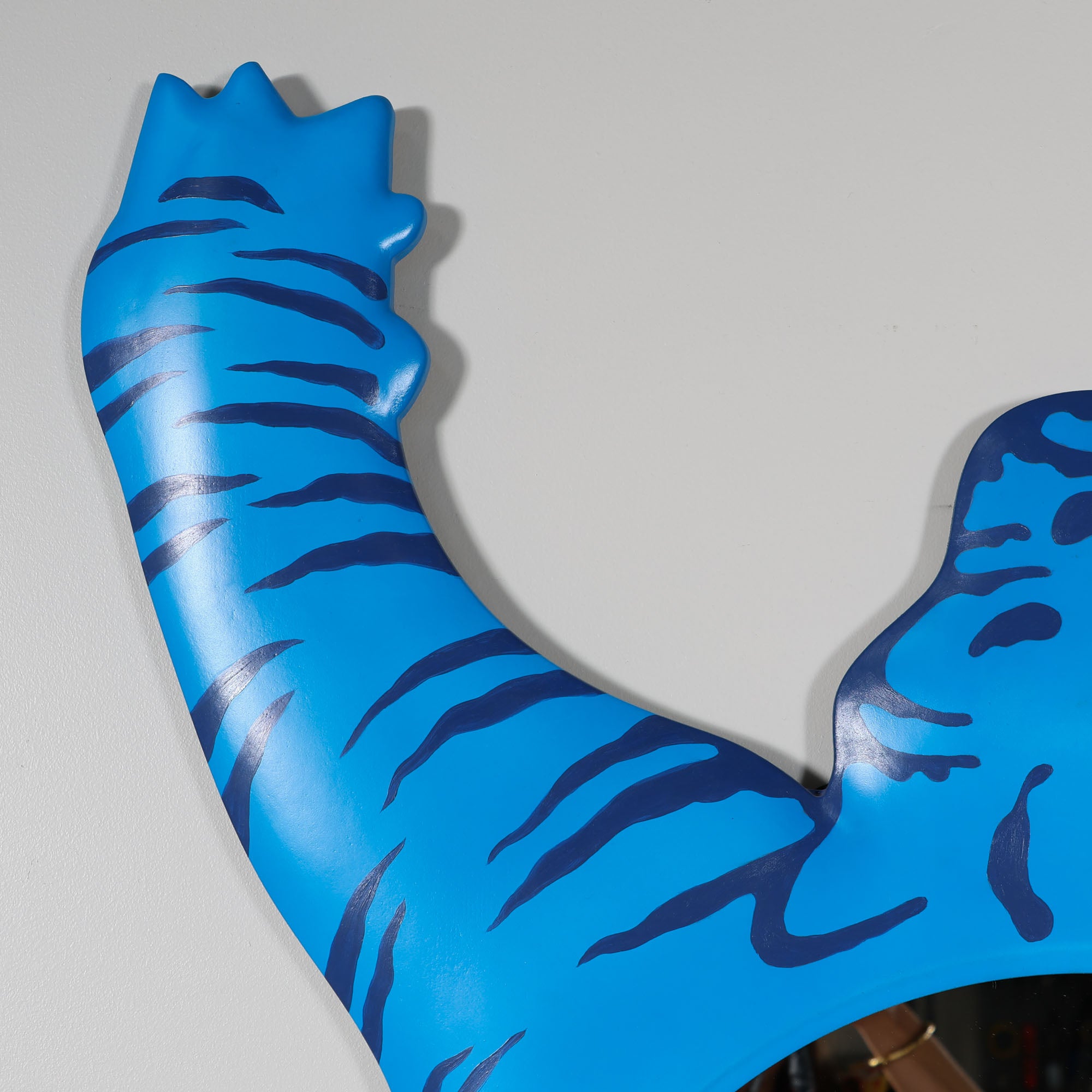 This large wall mirror is shaped like a tiger, featuring a bright cobalt blue finish with darker hand-painted stripe detailing. The circular mirror is centered within the body, creating a unique silhouette that functions as both wall art and a mirror.