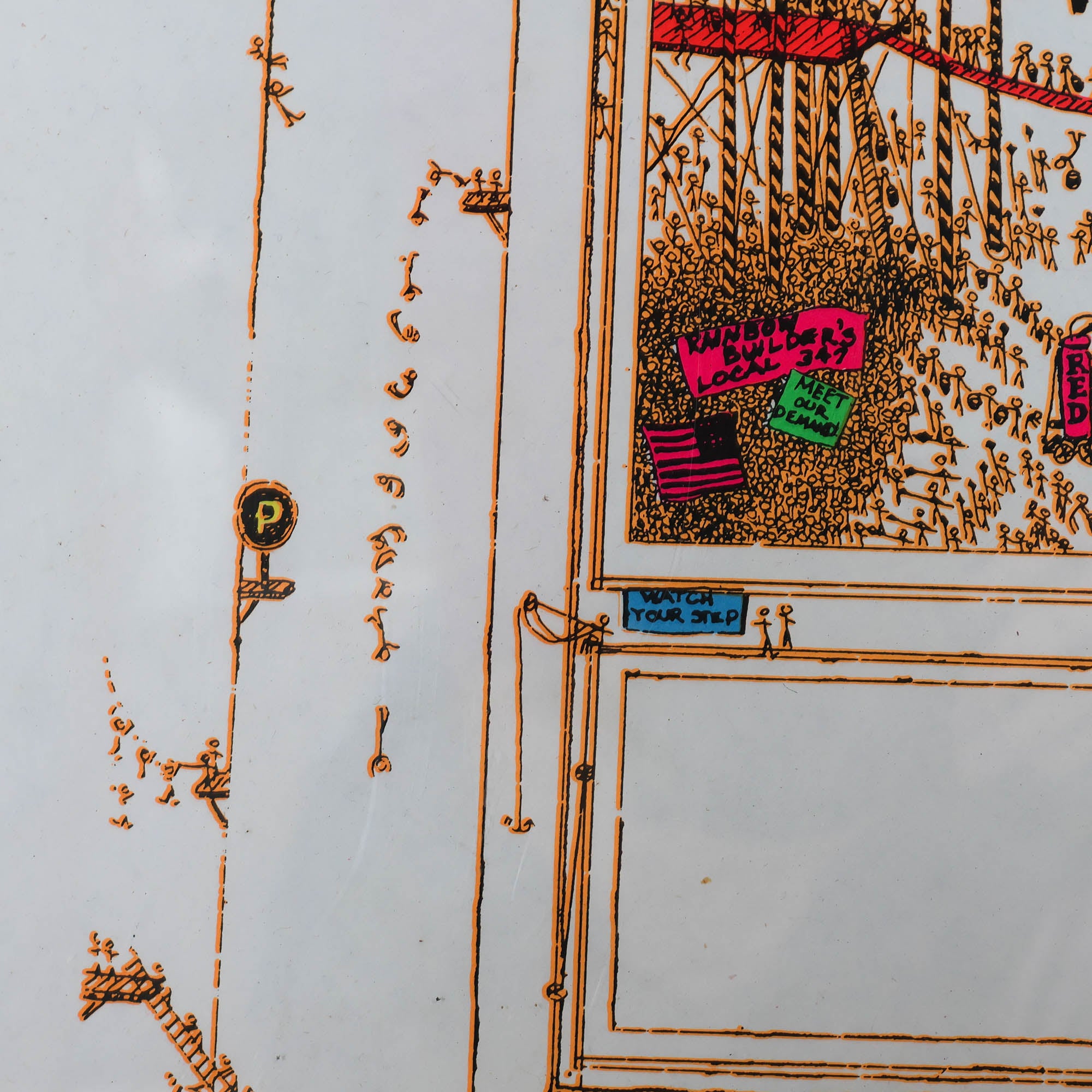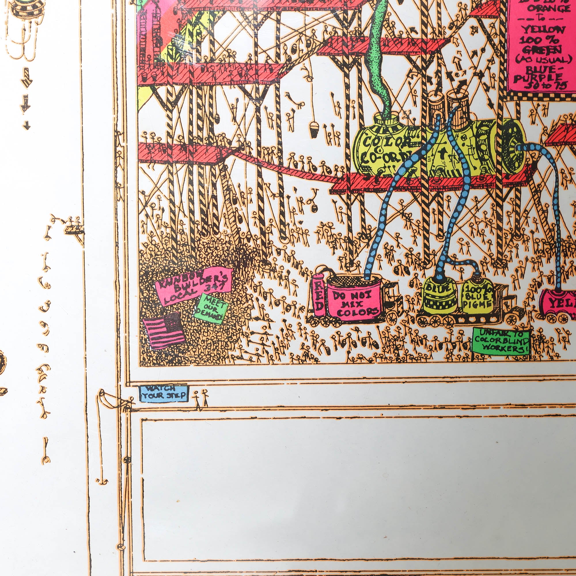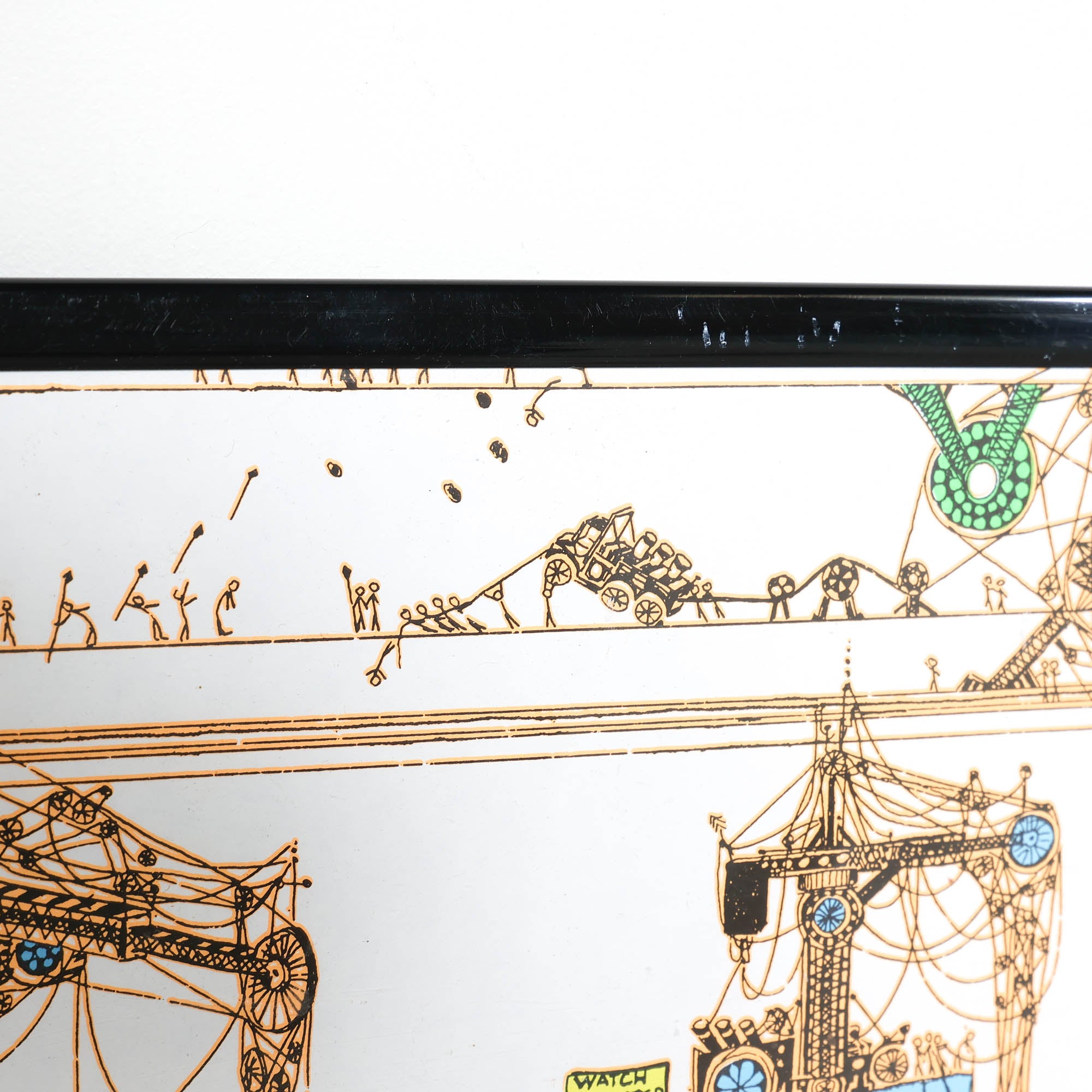 Whimsical, intricate, and delightfully imaginative, “Building a Rainbow” is a vintage illustrated print that turns the impossible into a beautifully engineered fantasy. The artwork depicts an elaborate world of tiny figures, cranes, pulleys, and scaffolding—all hard at work constructing a vibrant rainbow arching across the sky. Illustrated by Werbeagentur Robert Putz.