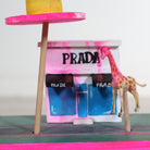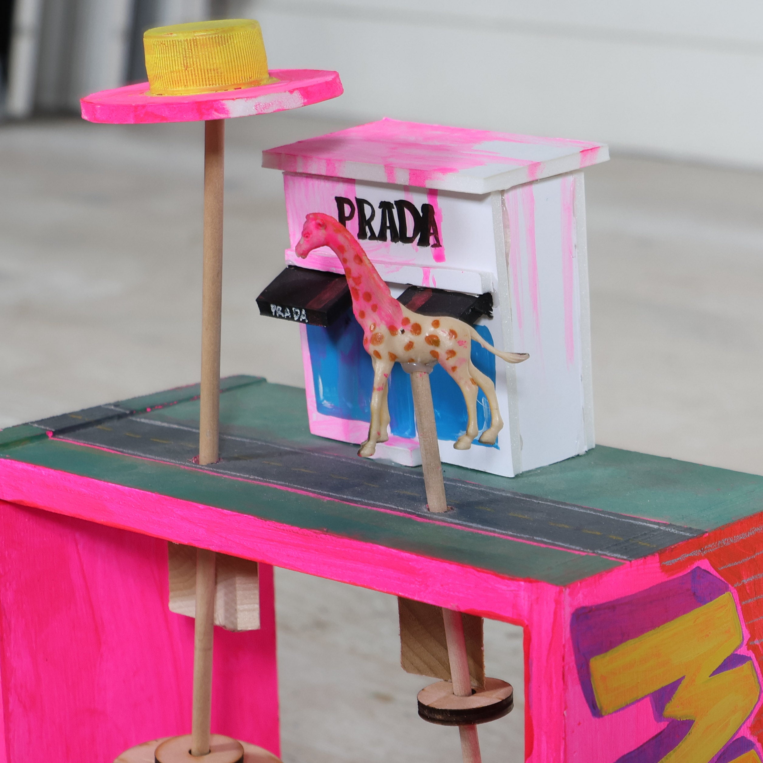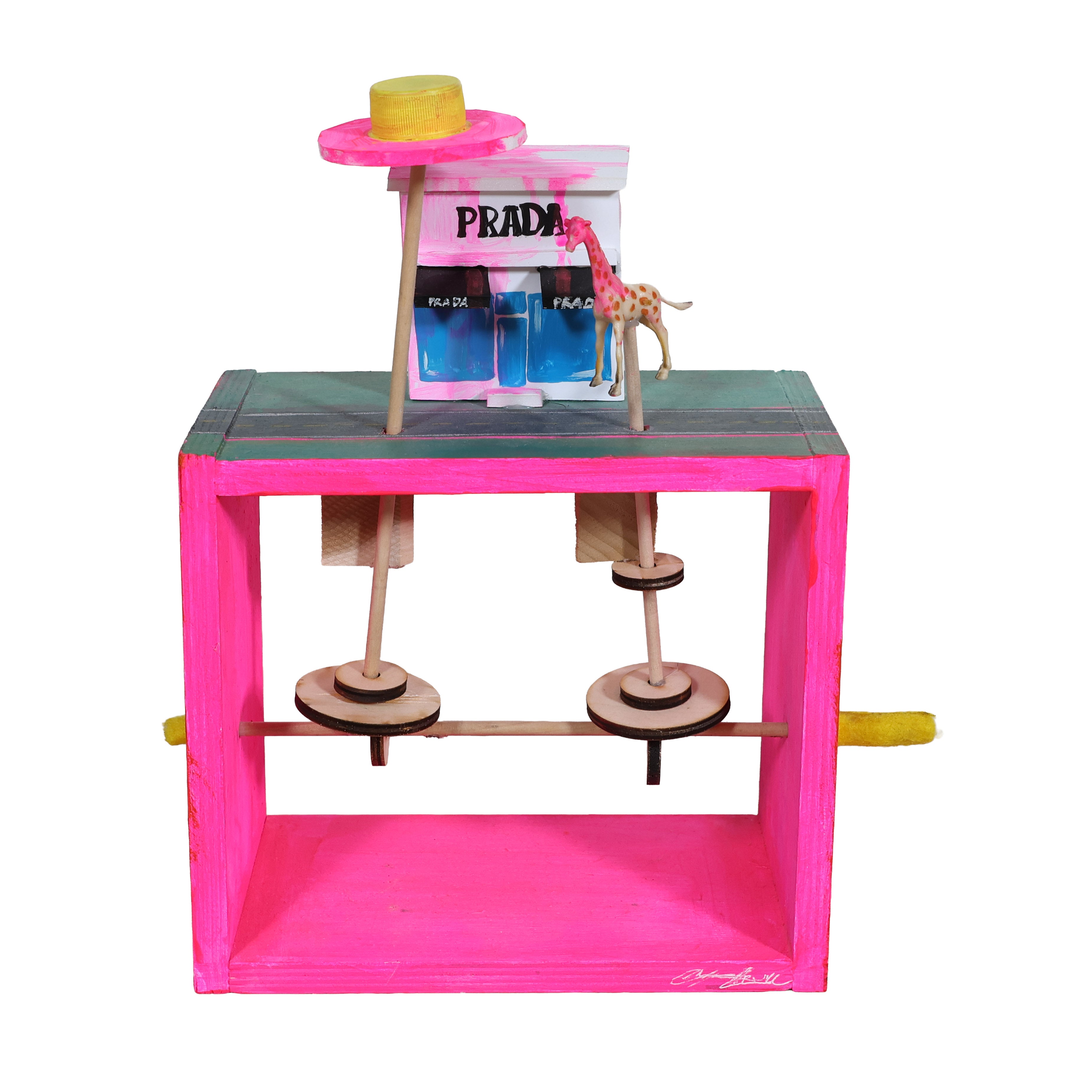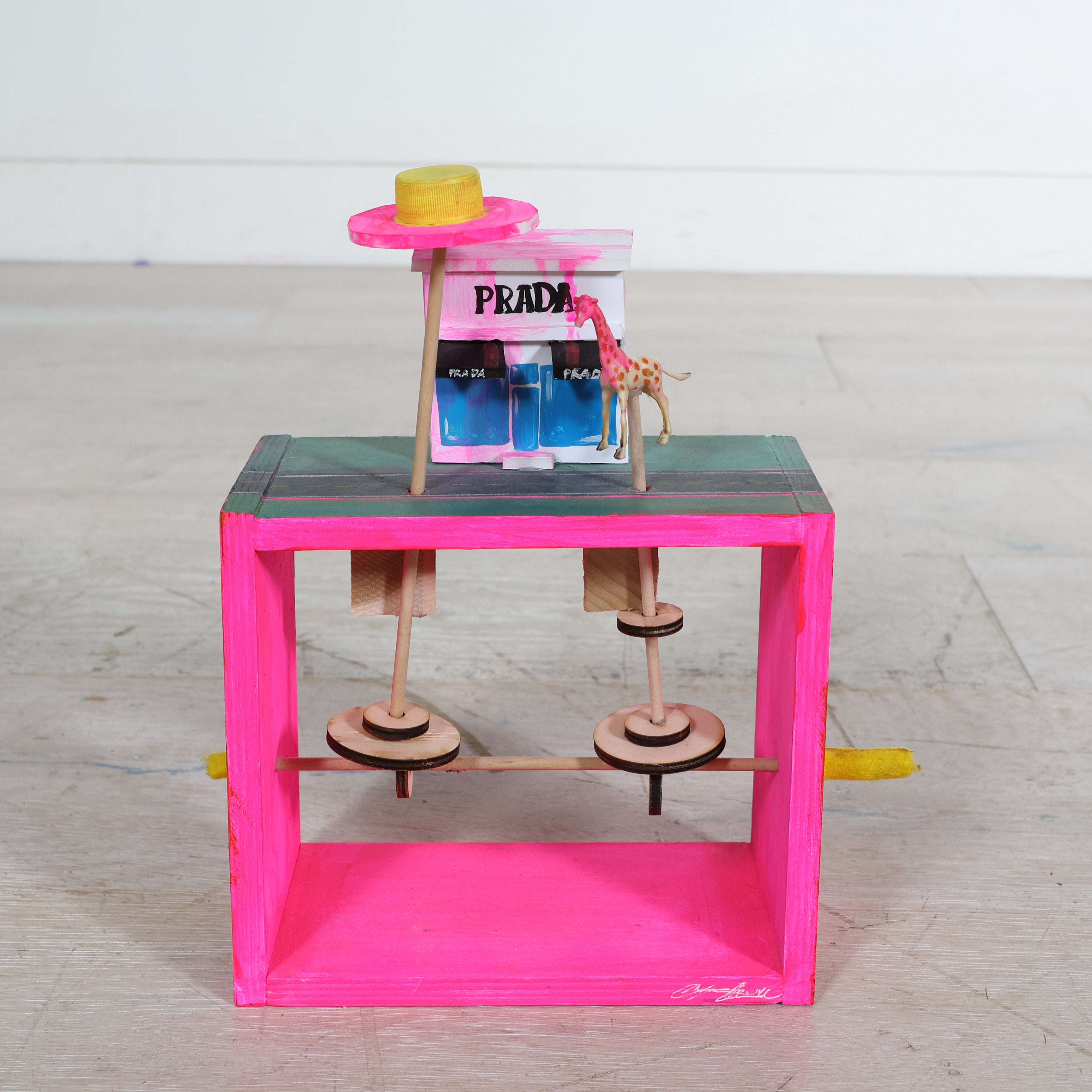 This hand-cranked wooden automaton turns a desert roadside scene into something mesmerizing and surreal. Just give the knob a spin and watch the giraffe and spaceship start their strange little dance above the Prada storefront.