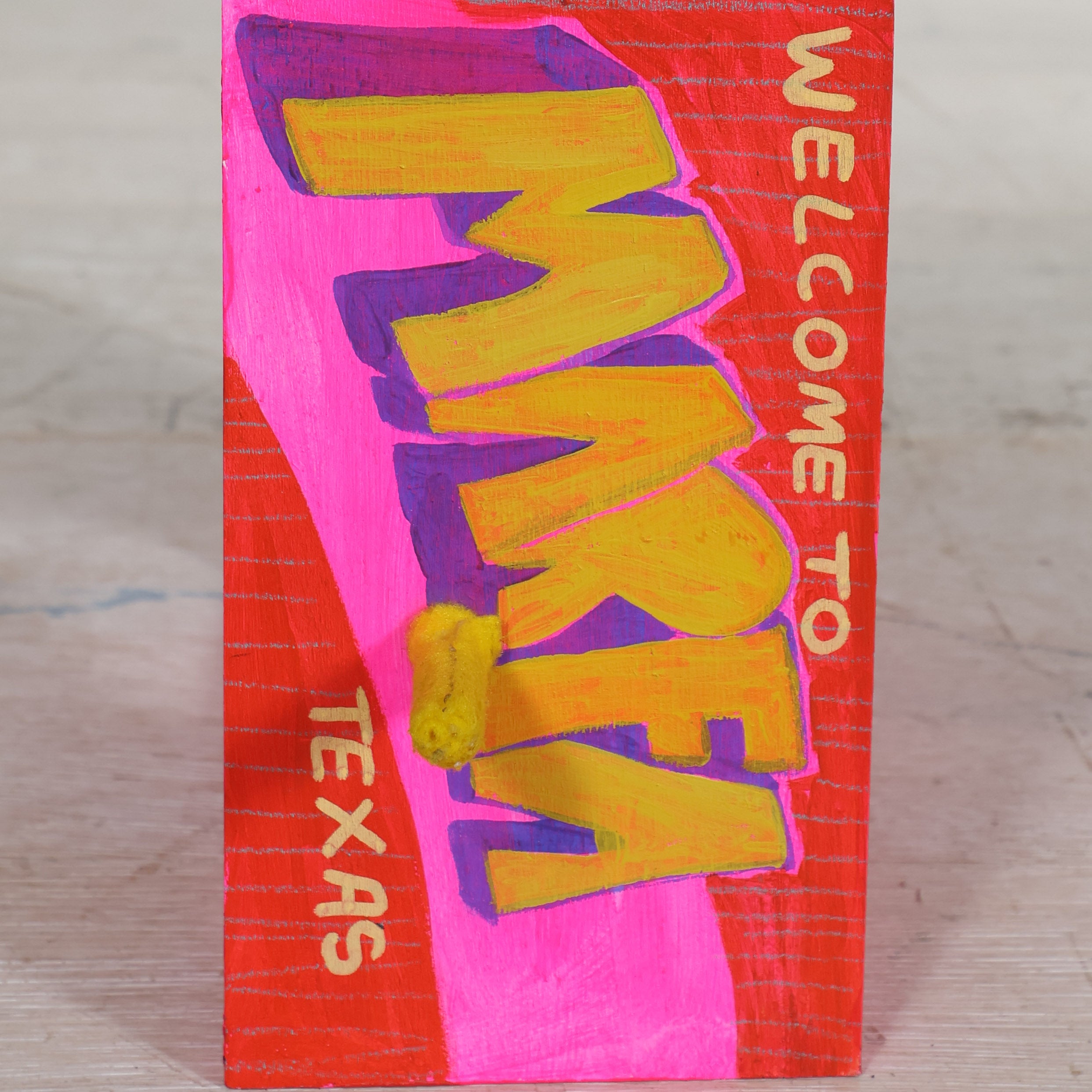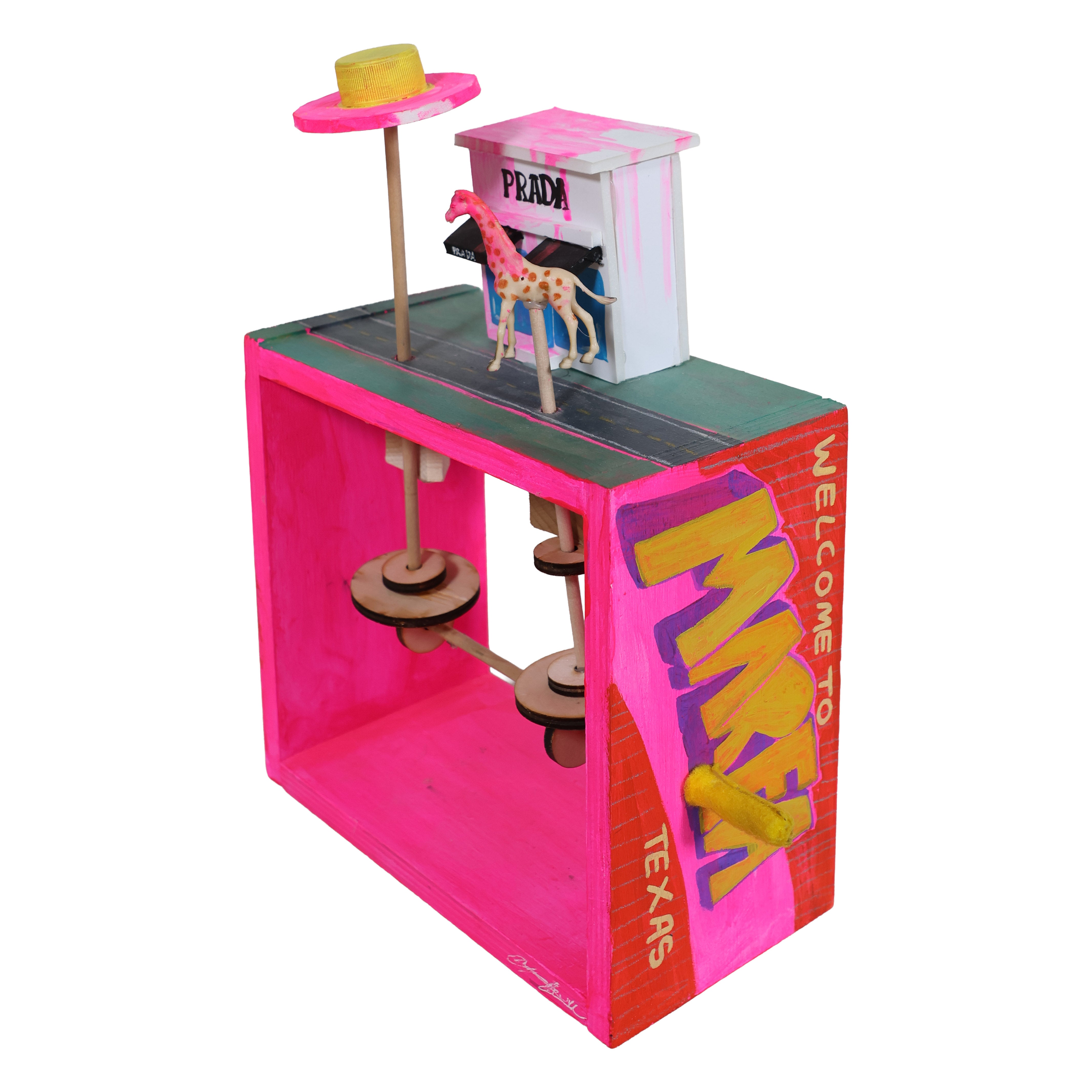 Painted in electric pink with a bold “Welcome to Marfa, Texas” graphic, the piece captures the unique charm the desert town is known for. The exposed mechanical components underneath add to its allure, revealing the clever handmade construction that powers the movement. Signed by the artist.