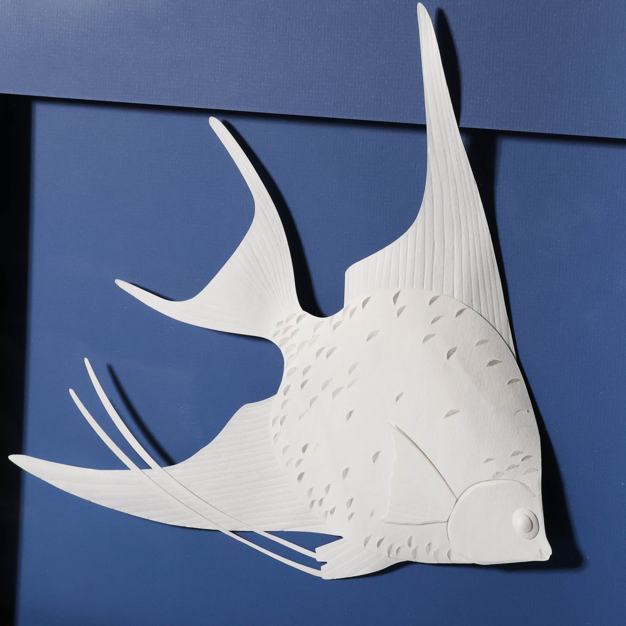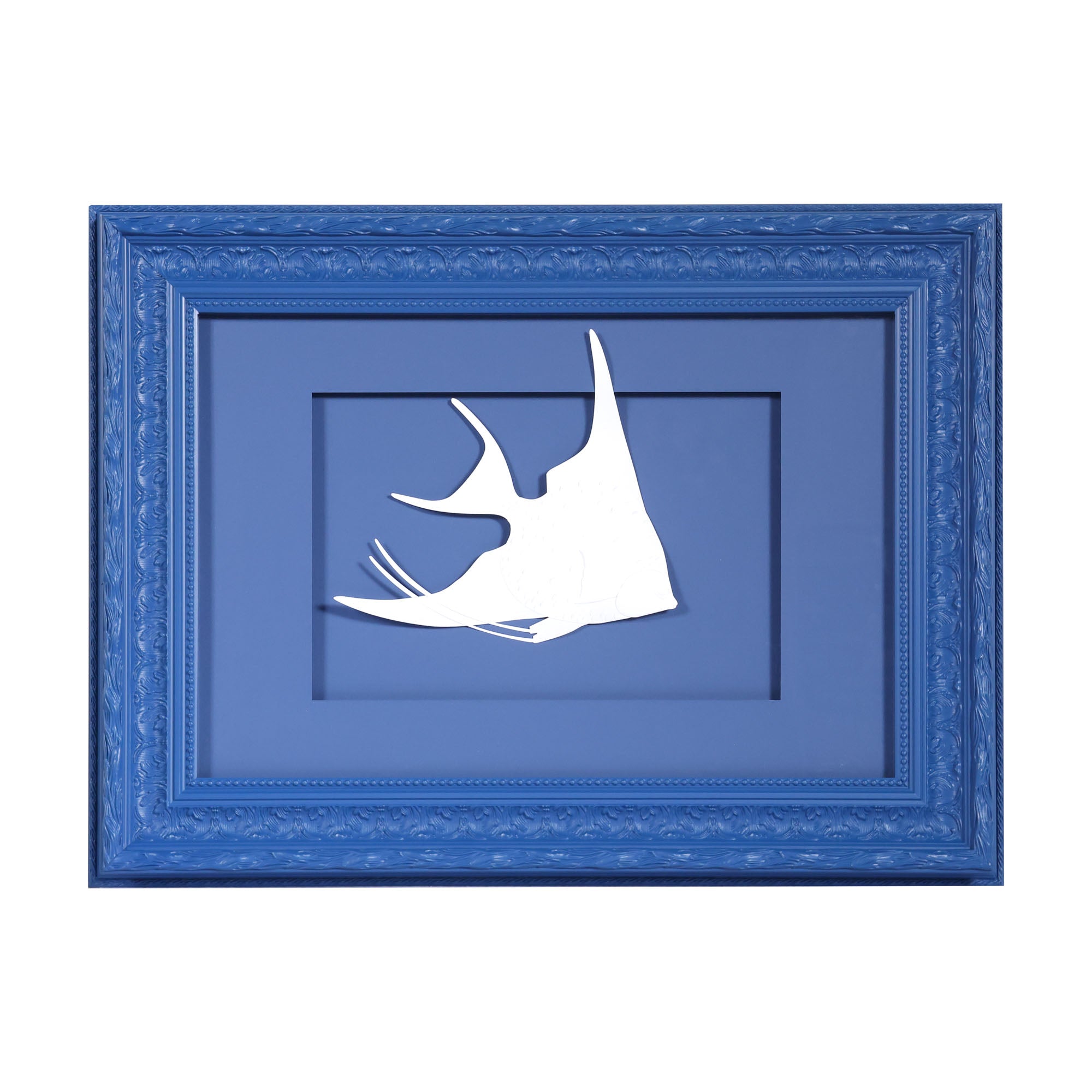Hand crafted from paper, this fish is magnificent against a dramatic royal blue backdrop. The fish is fixed to blue matte paper with float mounting, enclosed behind plexiglass with an elaborate painted blue frame.