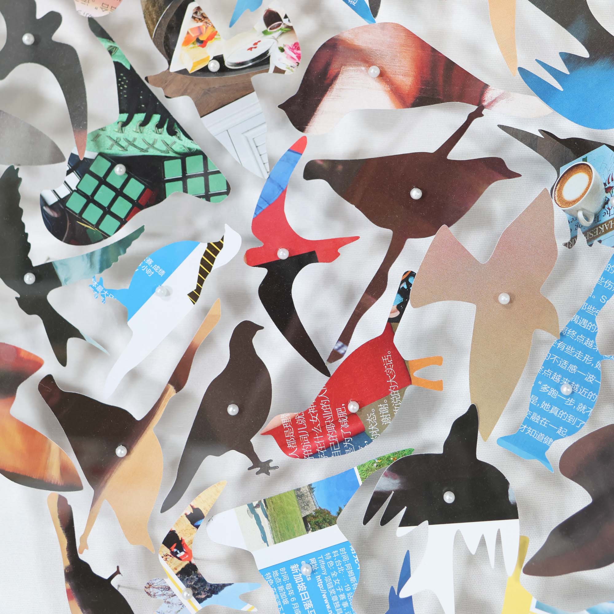Framed multicolor 3D paper bird art of the Jen Lin Series. Each bird is hand cut and individually pinned to white linen.