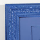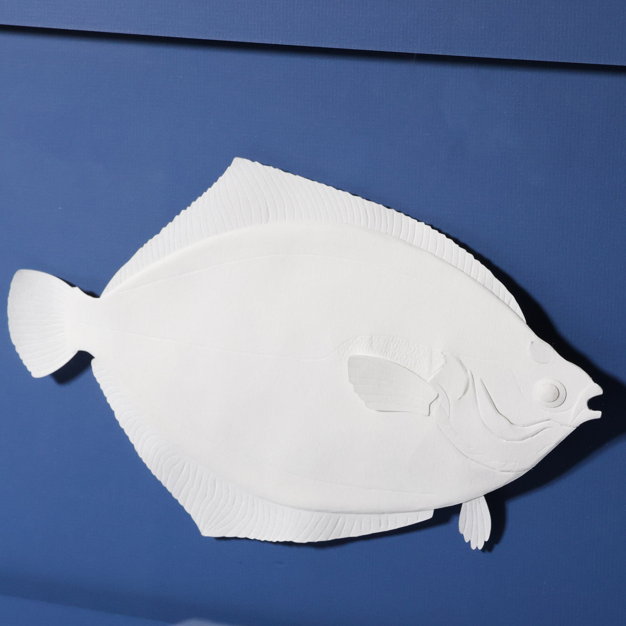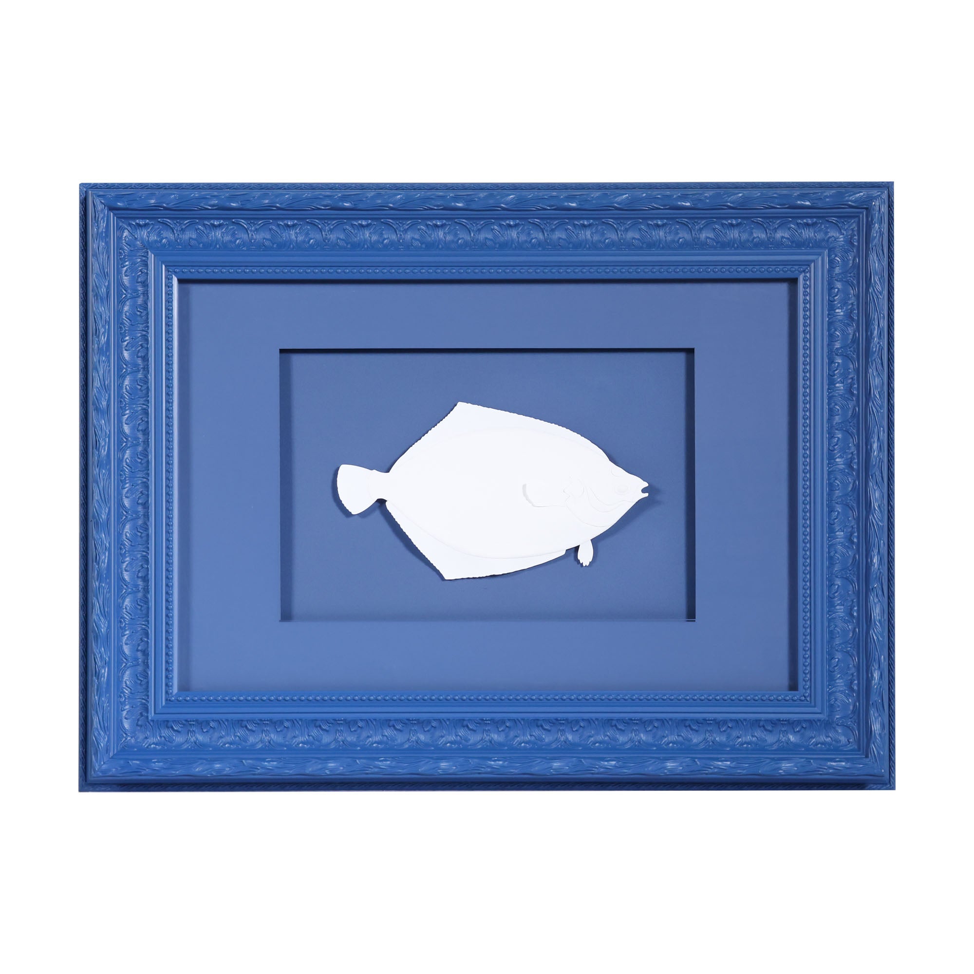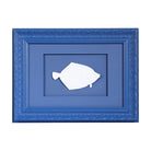Hand crafted from paper, this fish is magnificent against a dramatic royal blue backdrop. The fish is fixed to blue matte paper with float mounting, enclosed behind plexiglass with an elaborate painted blue frame.
