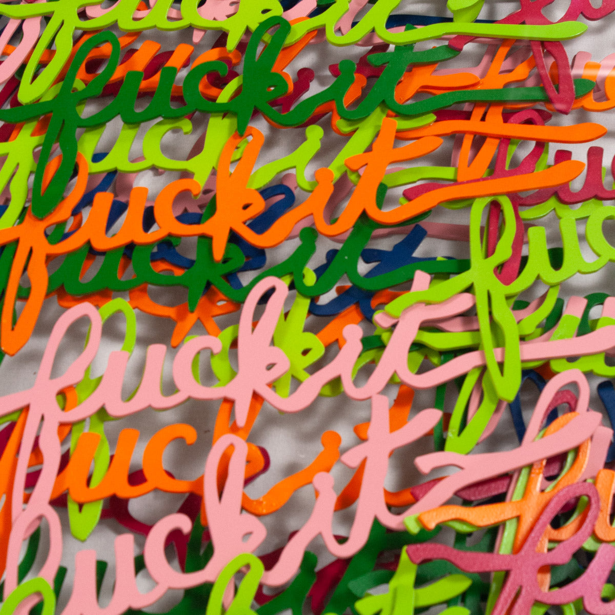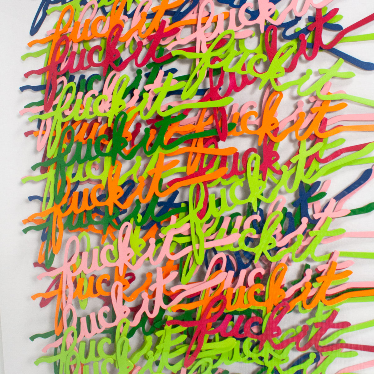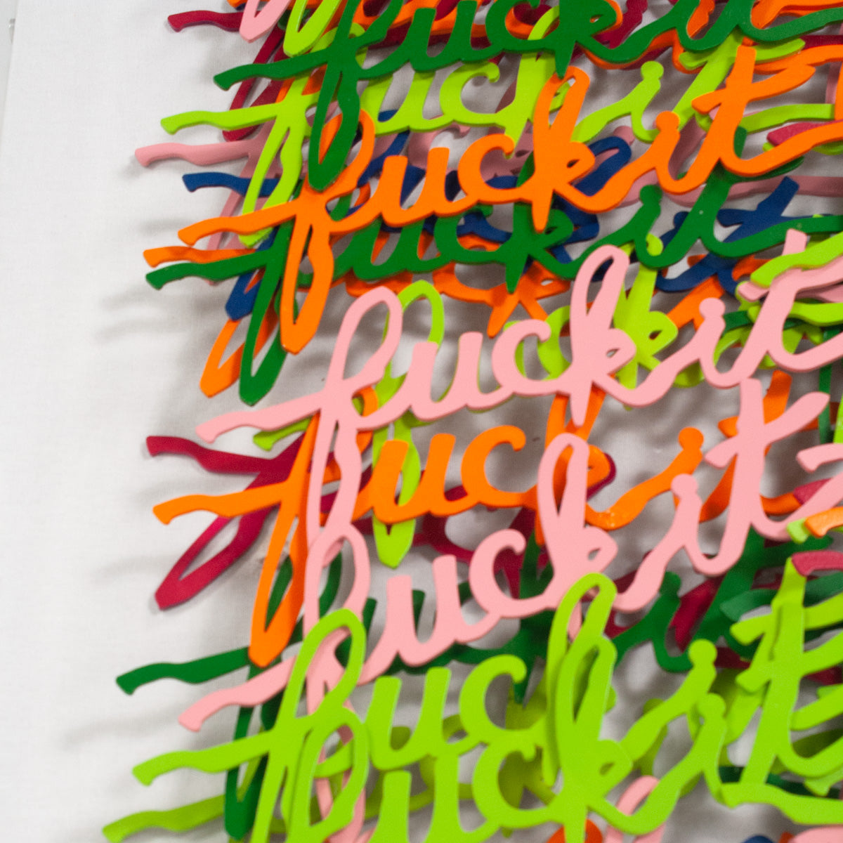 One of our favorites. A bigggg mood for sure. Laser cut words "fuck it" are individually placed on white canvas and framed in an acrylic shadowbox.