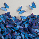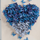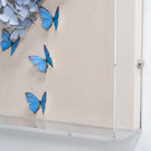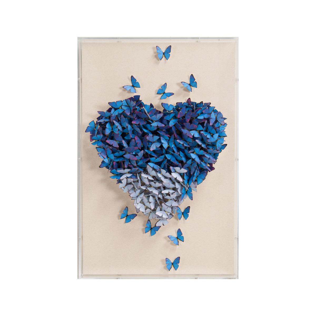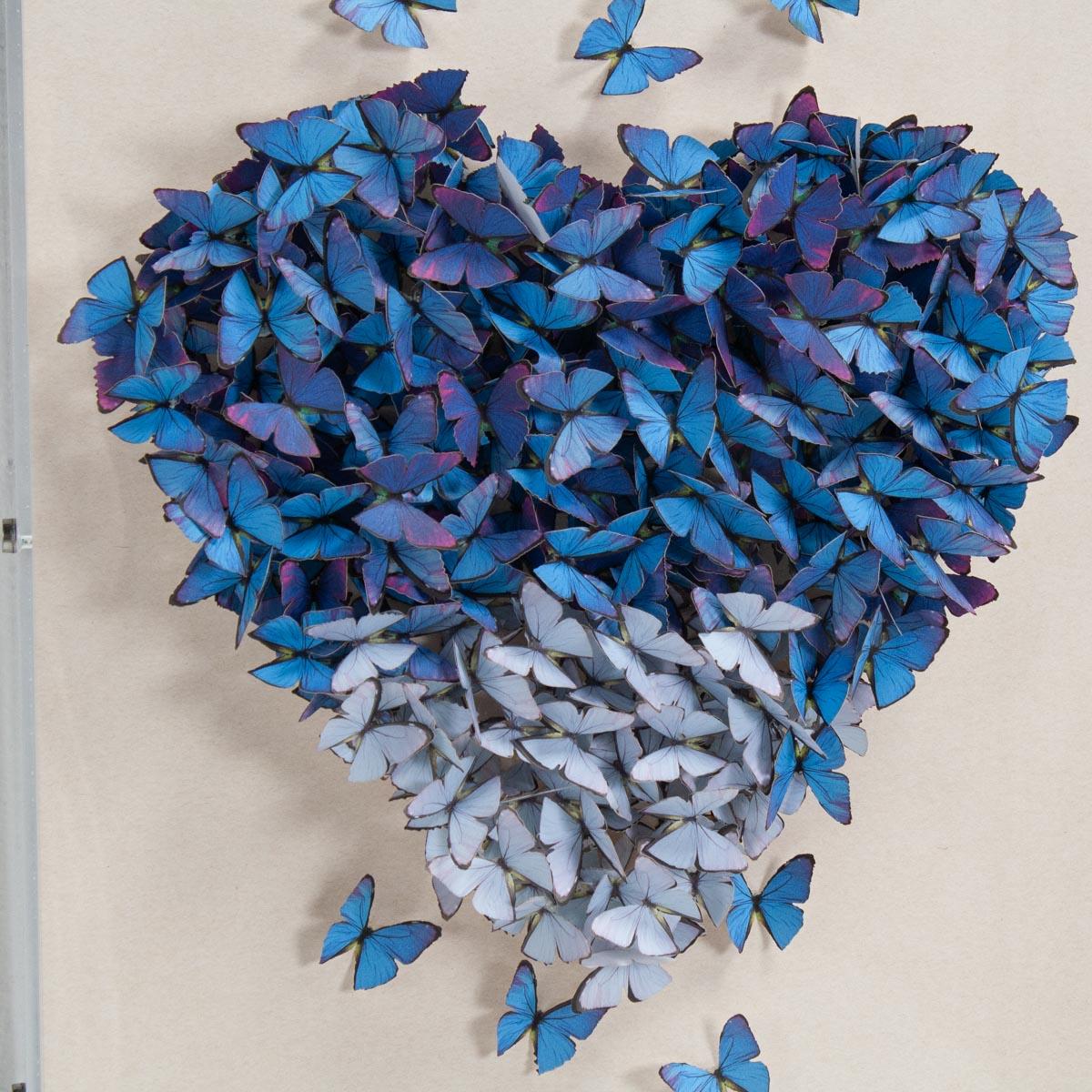 Hand-cut blue paper butterflies in the shape of a heart, framed in an acrylic shadowbox. Of the Jen Lin Series.