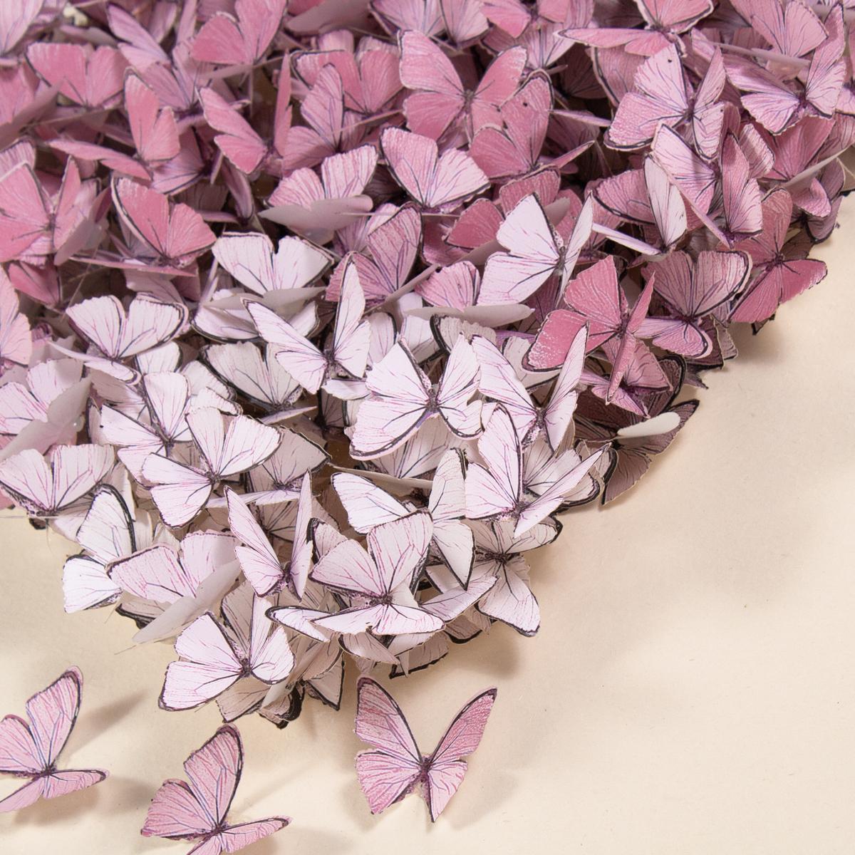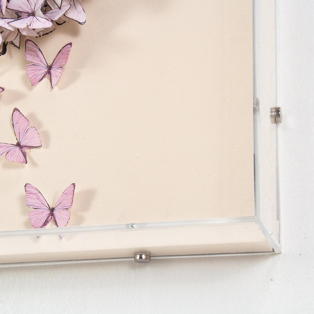 Hand-cut light pink paper butterflies in the shape of a heart, framed in an acrylic shadowbox. Of the Jen Lin Series.
