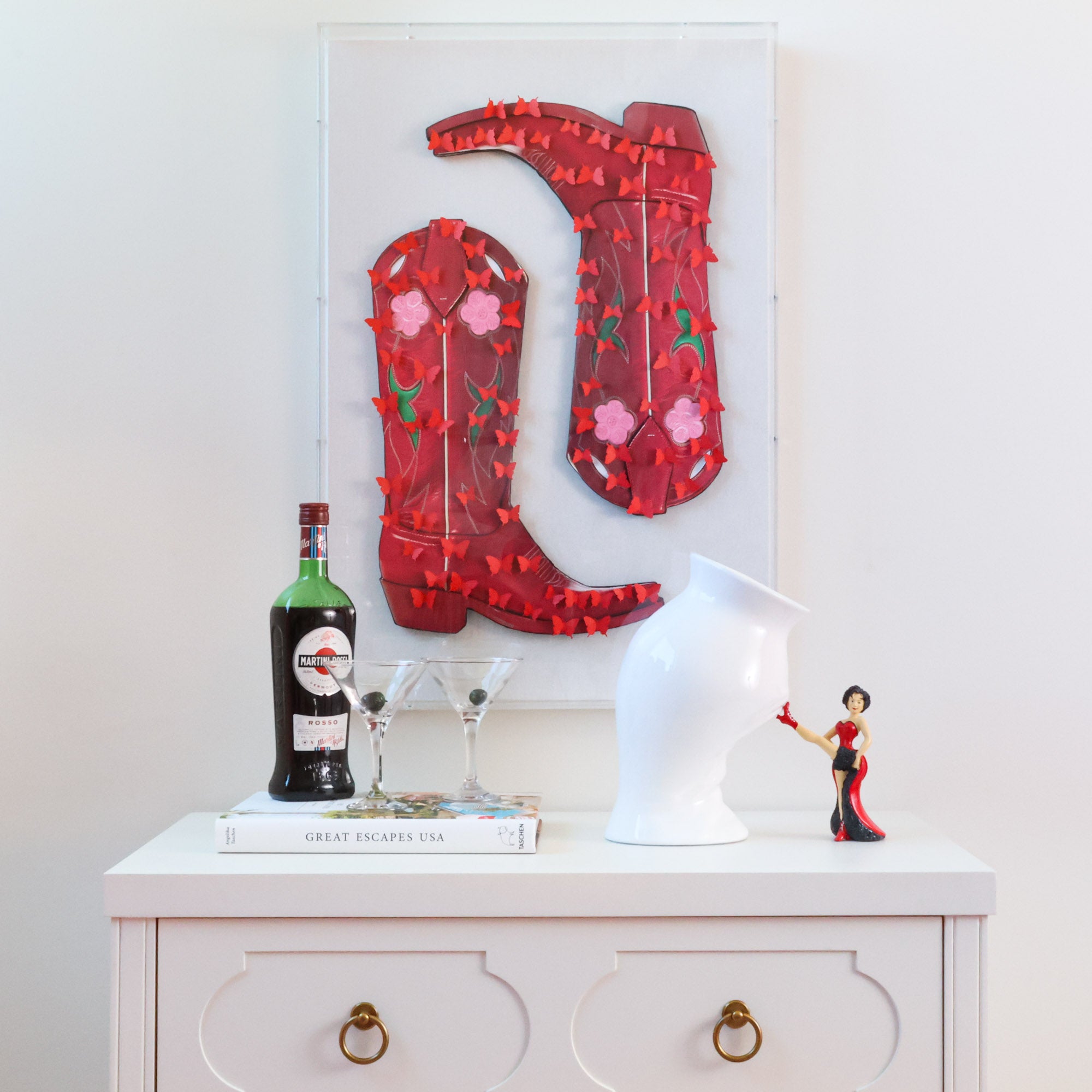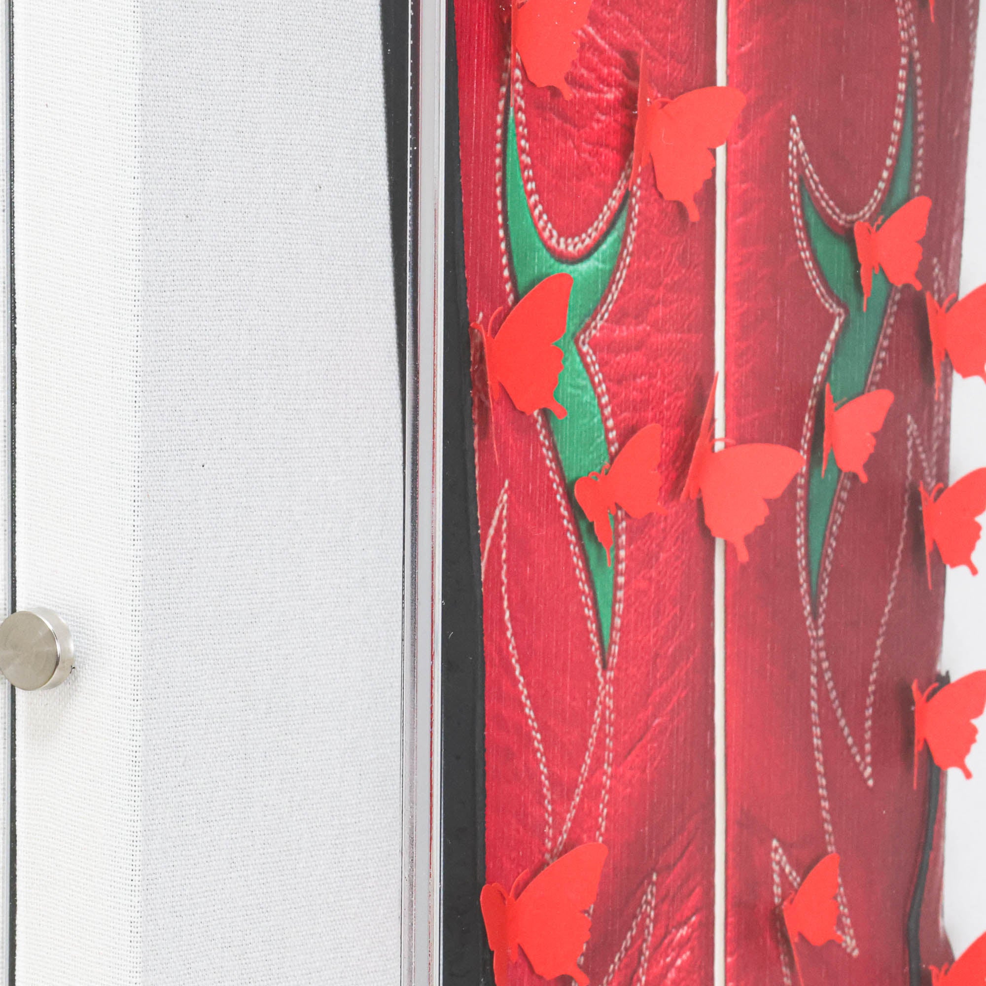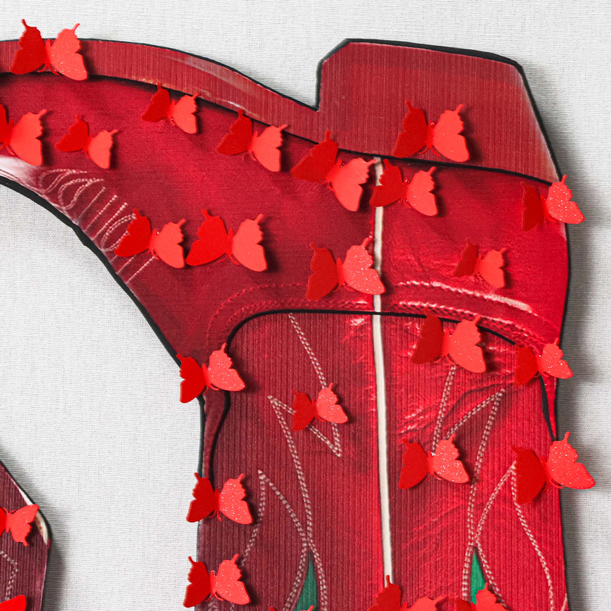From the Tat Frederick studio, 'Kissin' Kate - Red' features 3d laser cut cowboy boots with hand-painted details, fixed to canvas and framed in an acrylic shadowbox. Red butterflies are hand-cut from paper and applied atop for a fabulous finishing touch.