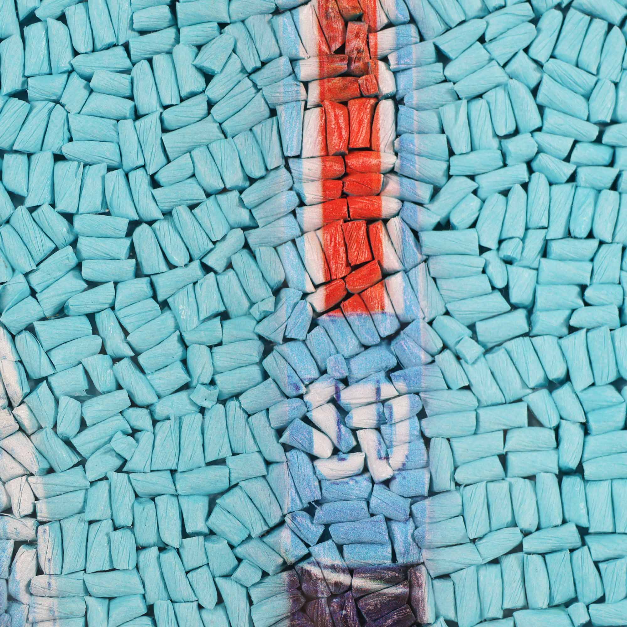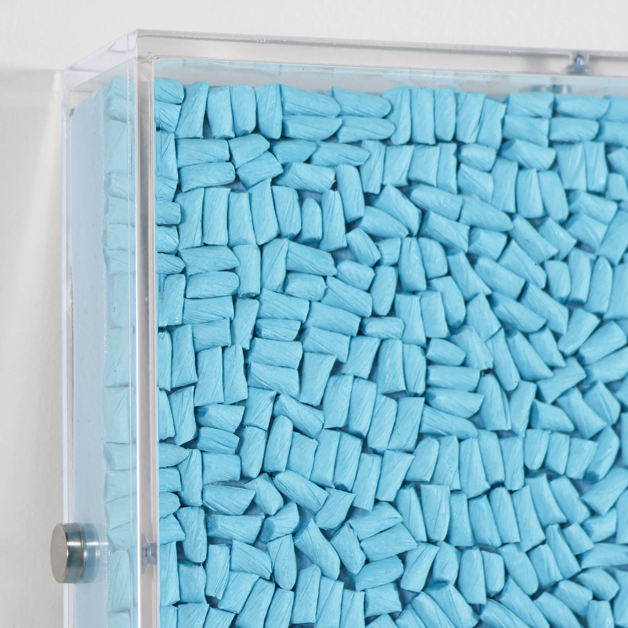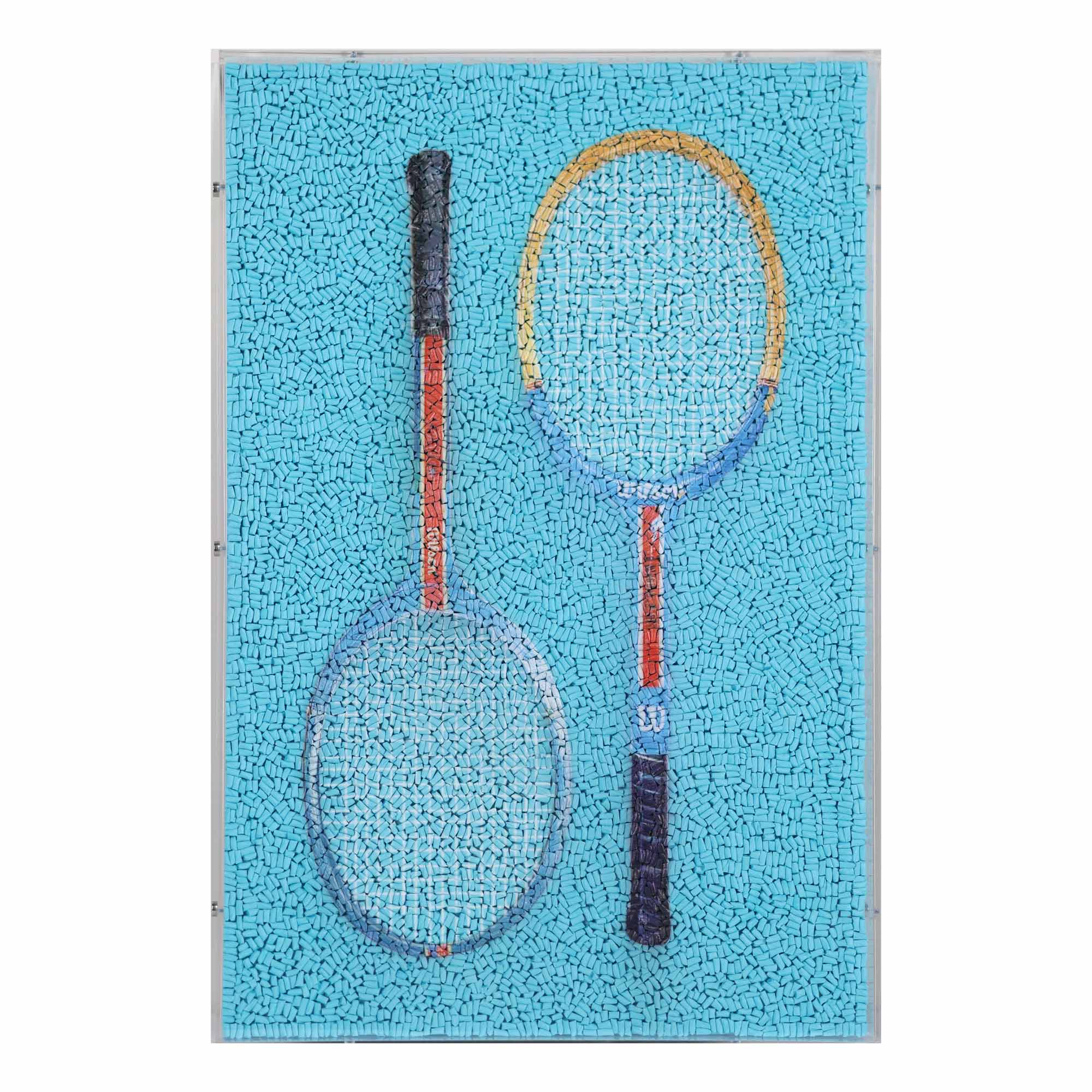 From the Tat Frederick studio, Racket Club is comprised of tiny pieces of painted rope that have been arranged by hand. Framed in an acrylic shadowbox.