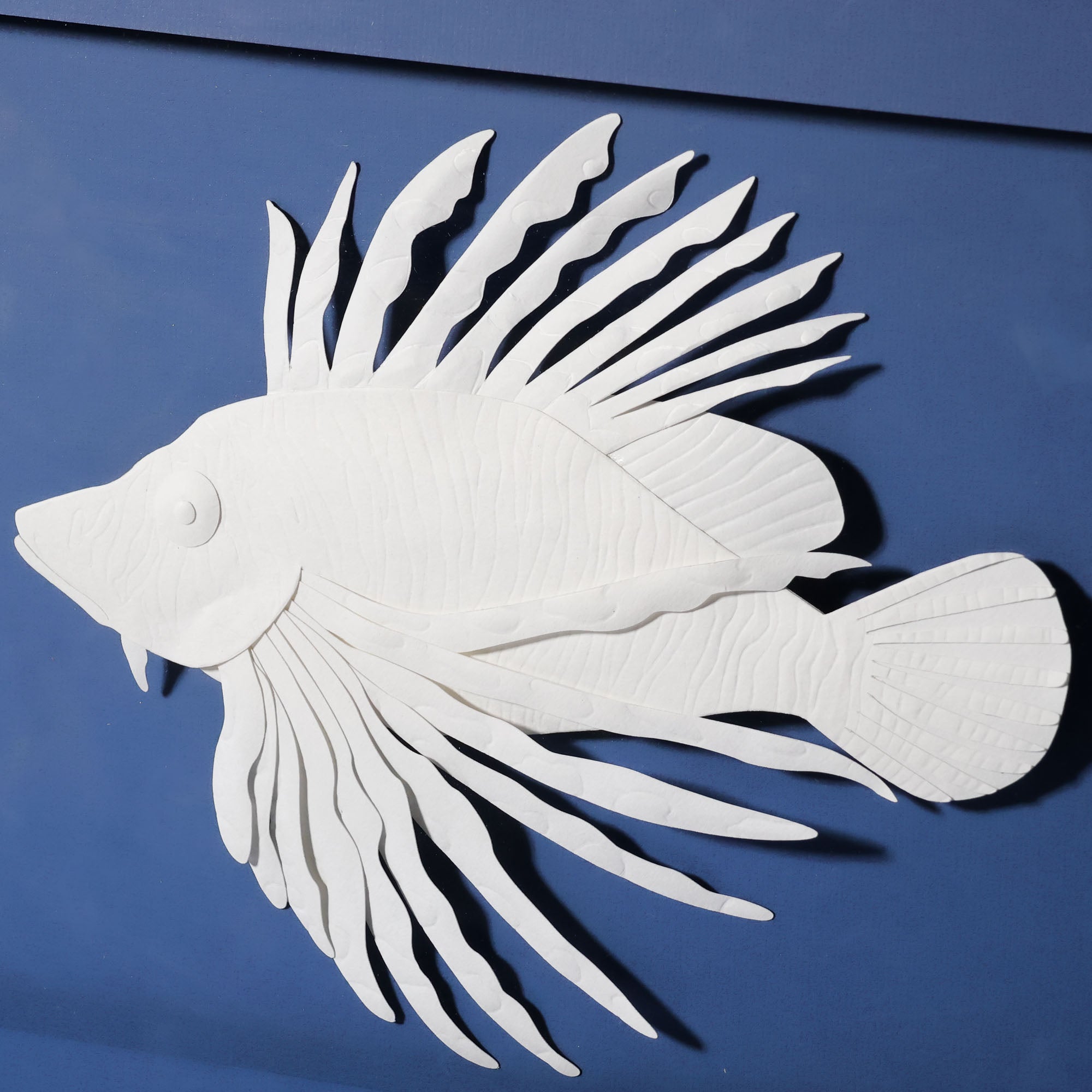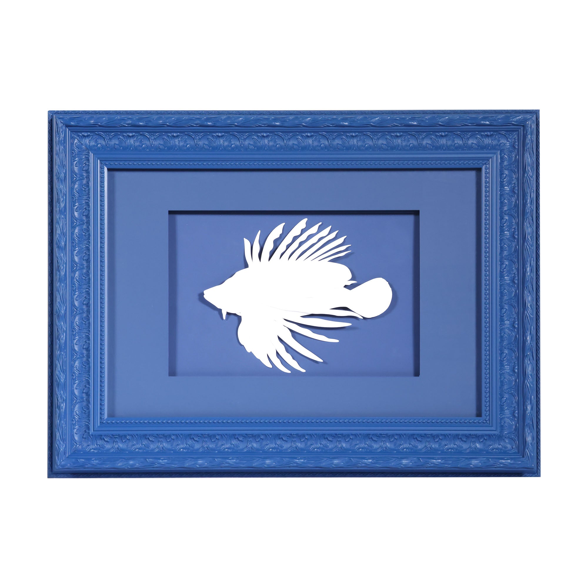 Hand crafted from paper, this fish is magnificent against a dramatic royal blue backdrop. The fish is fixed to blue matte paper with float mounting, enclosed behind plexiglass with an elaborate painted blue frame.