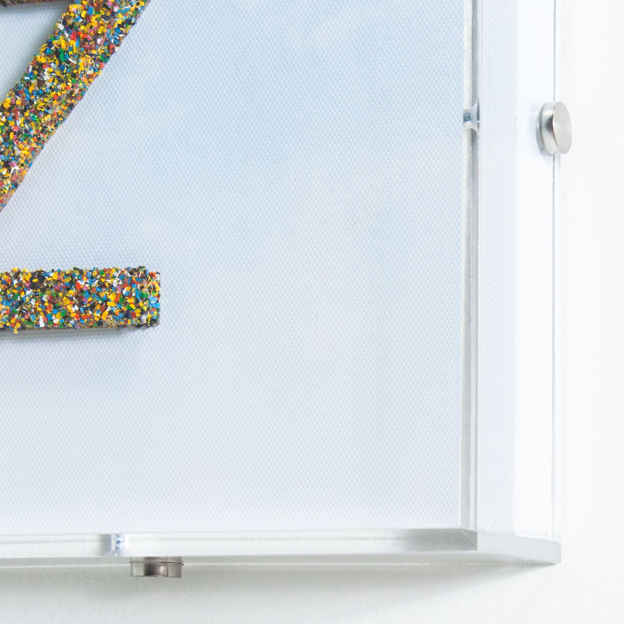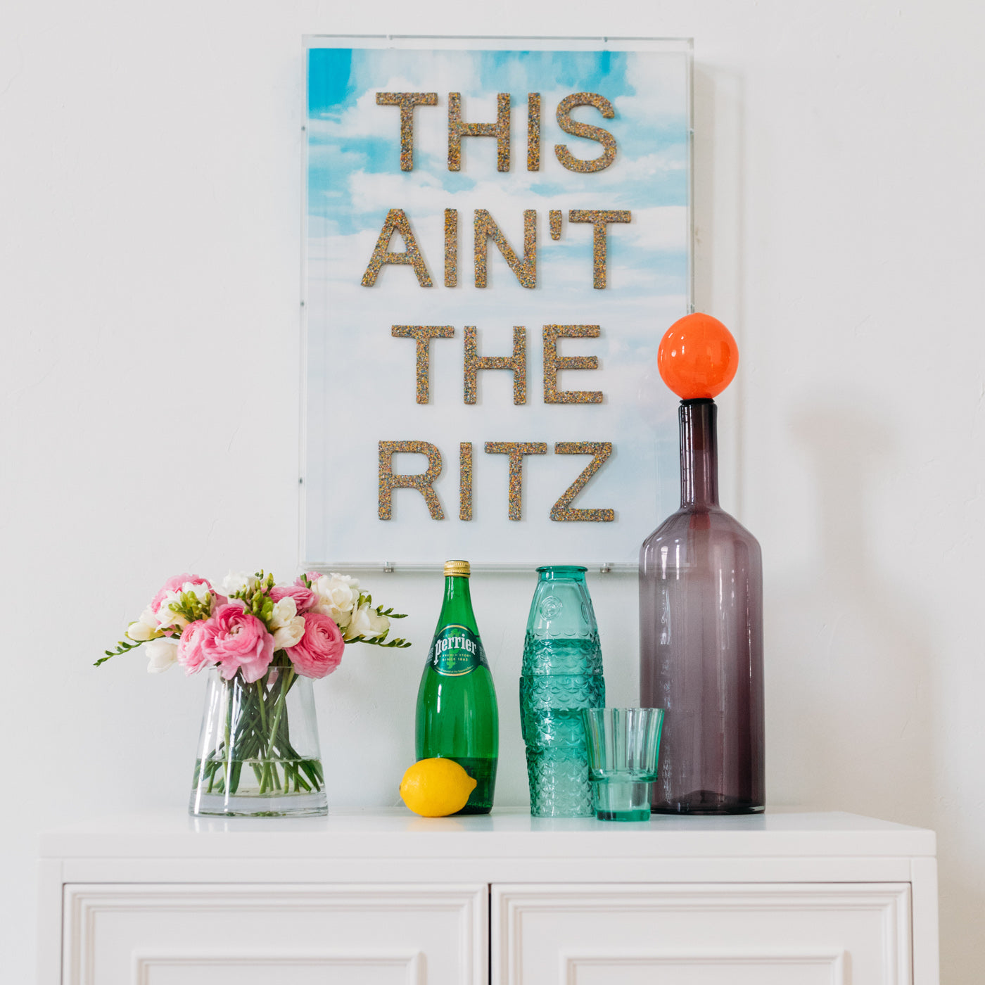 A new design by Tat Frederick! "This Ain't The Ritz" made out of shaved crayon and fixed to a painted cloud-like canvas and framed in an acrylic shadowbox.