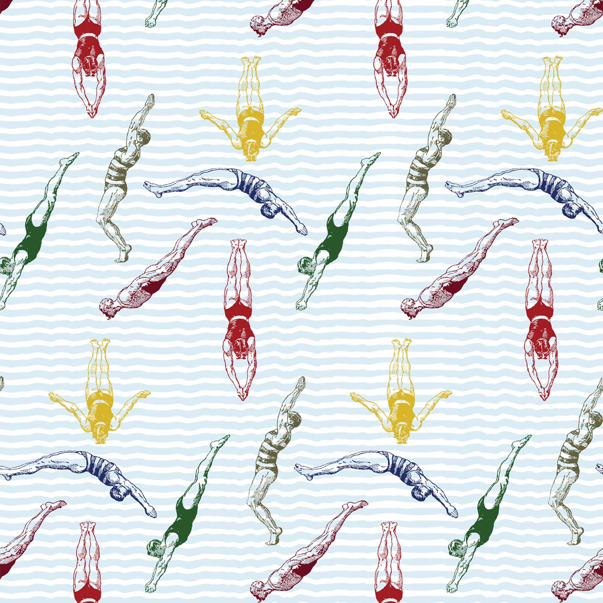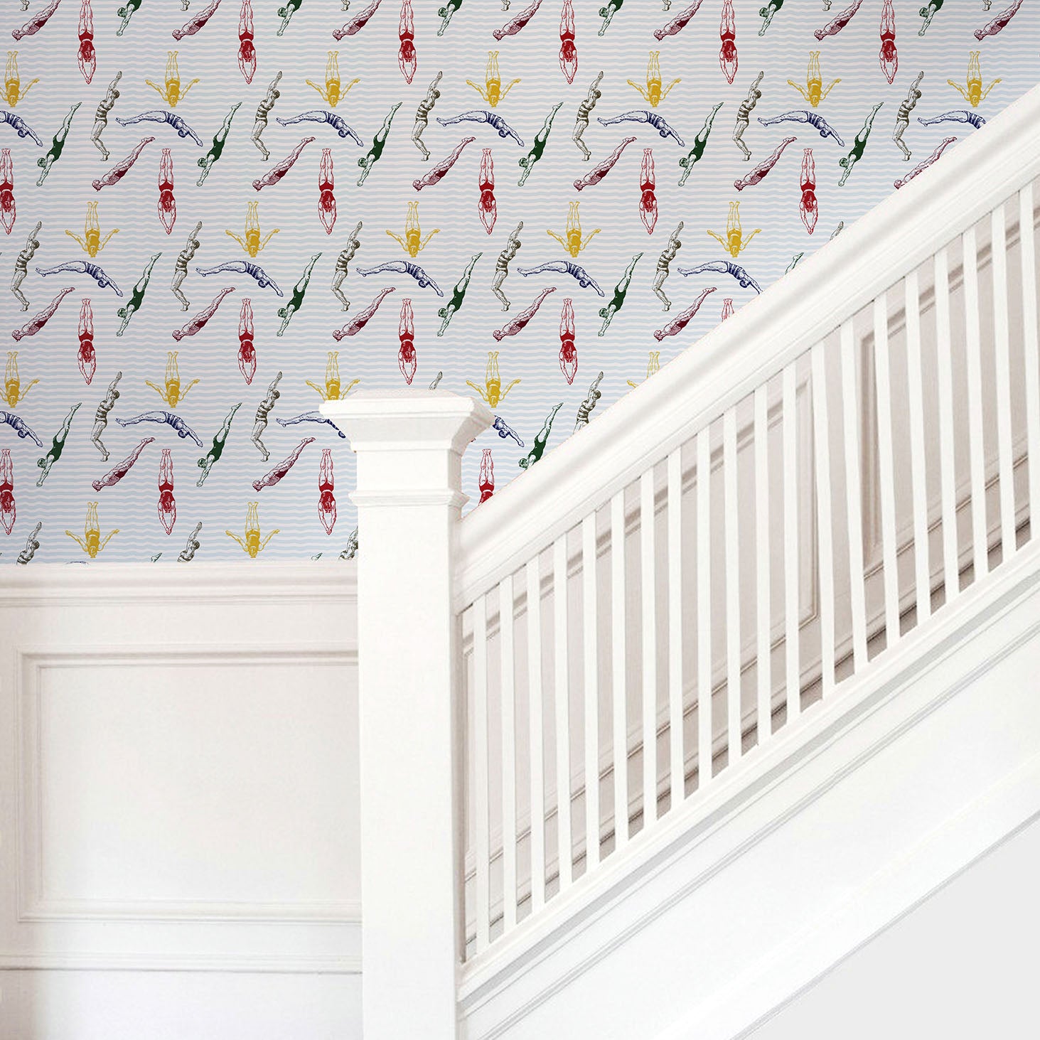 A refreshing twist on the classic striped design, 'Dive In' features original etchings of divers swimming through striped waves. This playful pattern is ideal for bold and fun spaces, such as a pool house, or any area that requires a touch of whimsy.