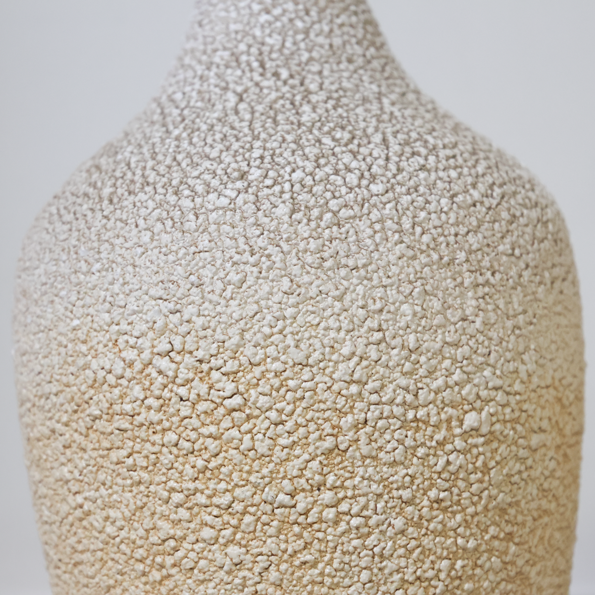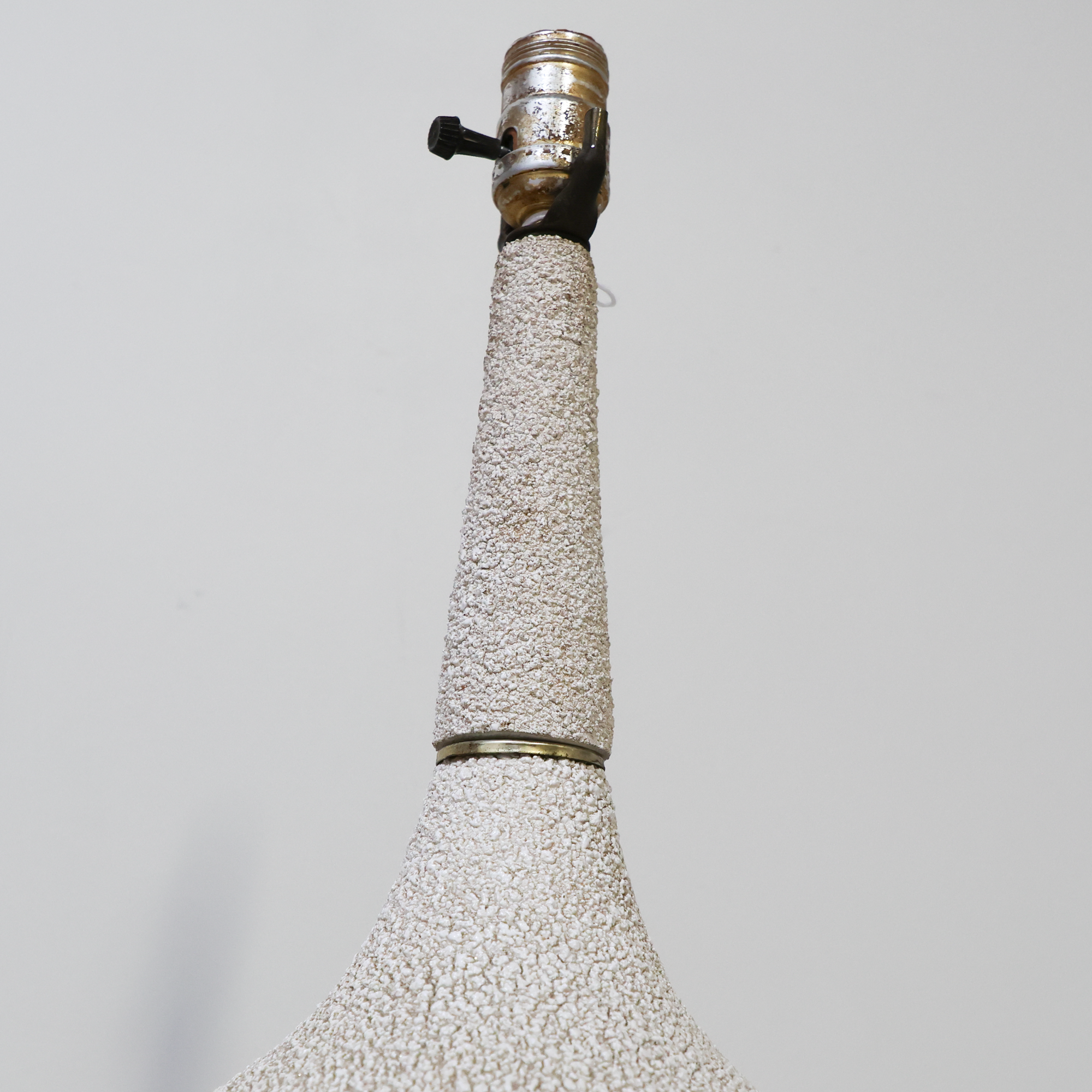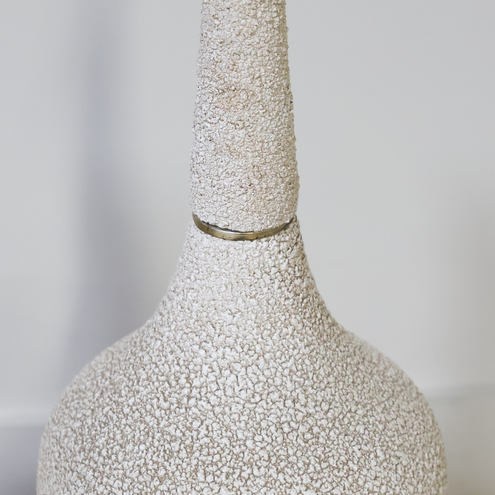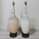A perfect pair with that just-right mid-century presence. These vintage table lamps feature a beautifully speckled, textured glaze that fades softly from warm sand to creamy ivory, giving them depth and movement. The elongated, bottle-shaped silhouettes with brass accents add an elegant flair