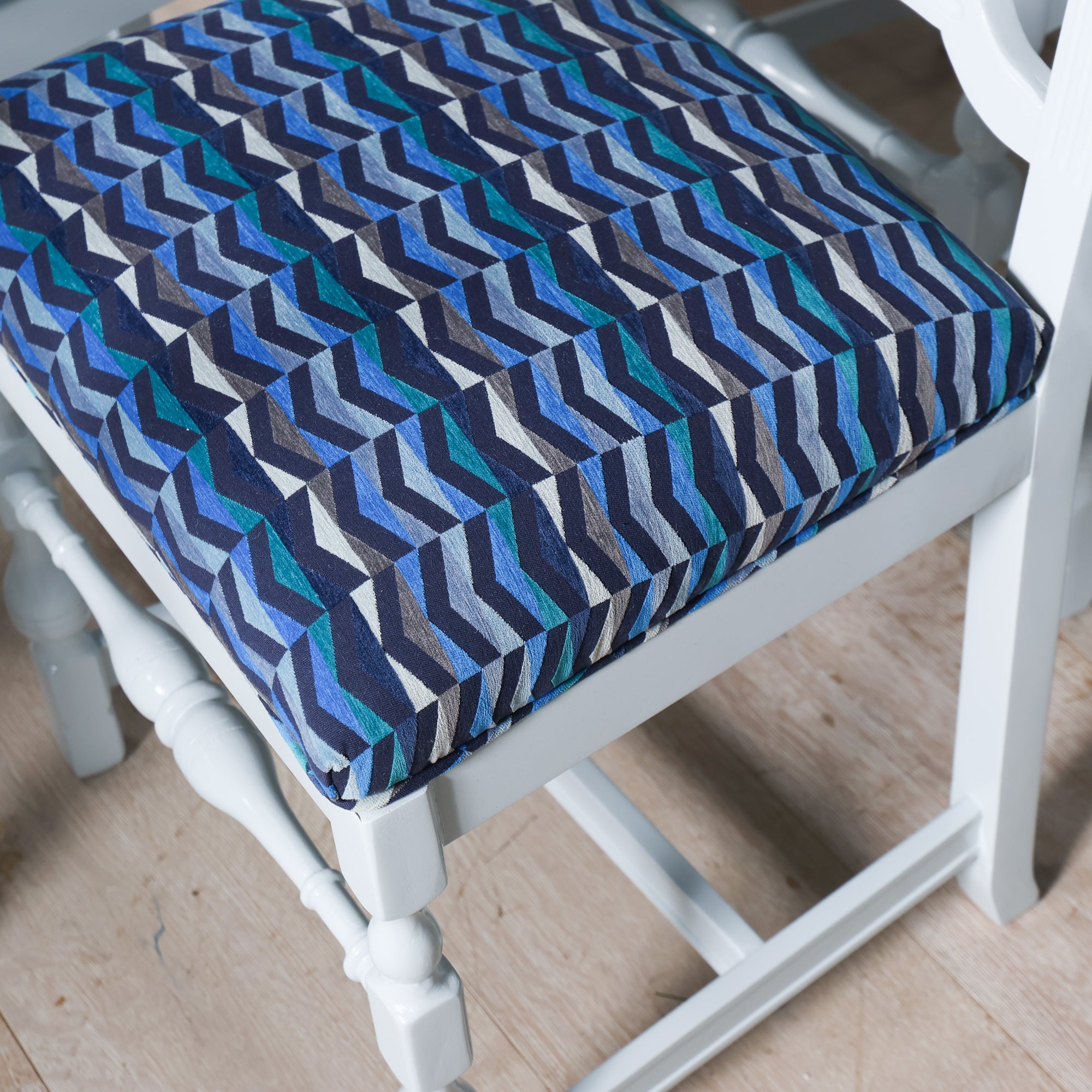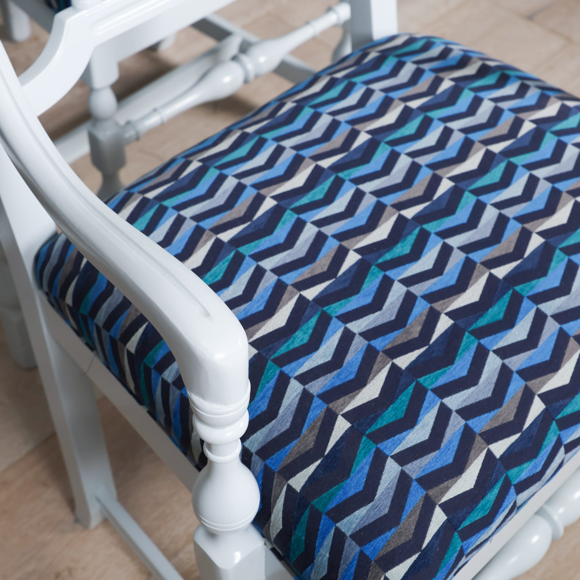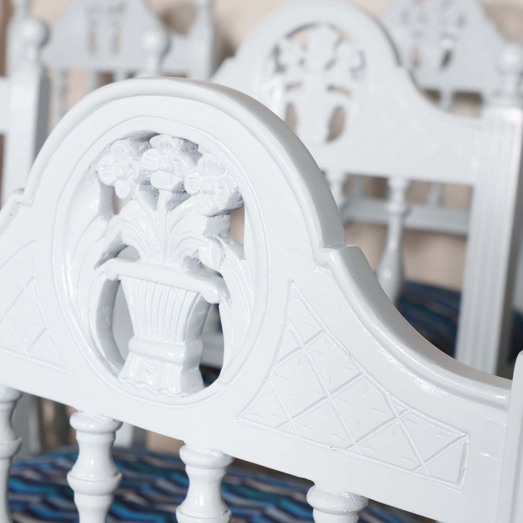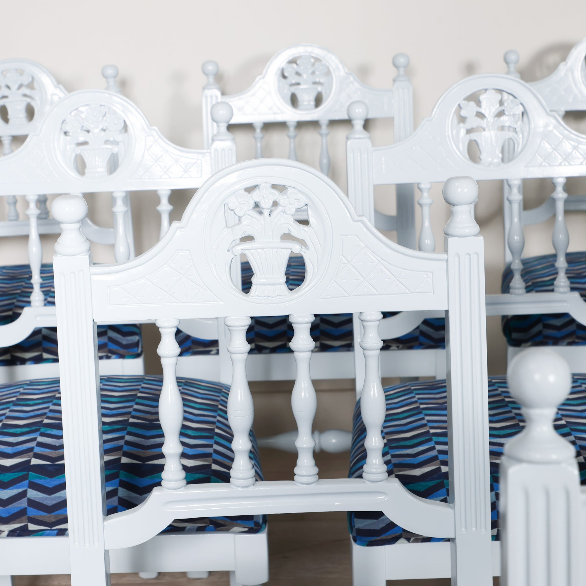 Our team gave this set of 10 French Provincial–style dining chairs a new lease on life. A fresh coat of Gulfstream Blue lacquer makes the carved details shine, while a fun geometric blue fabric makes a statement seat.