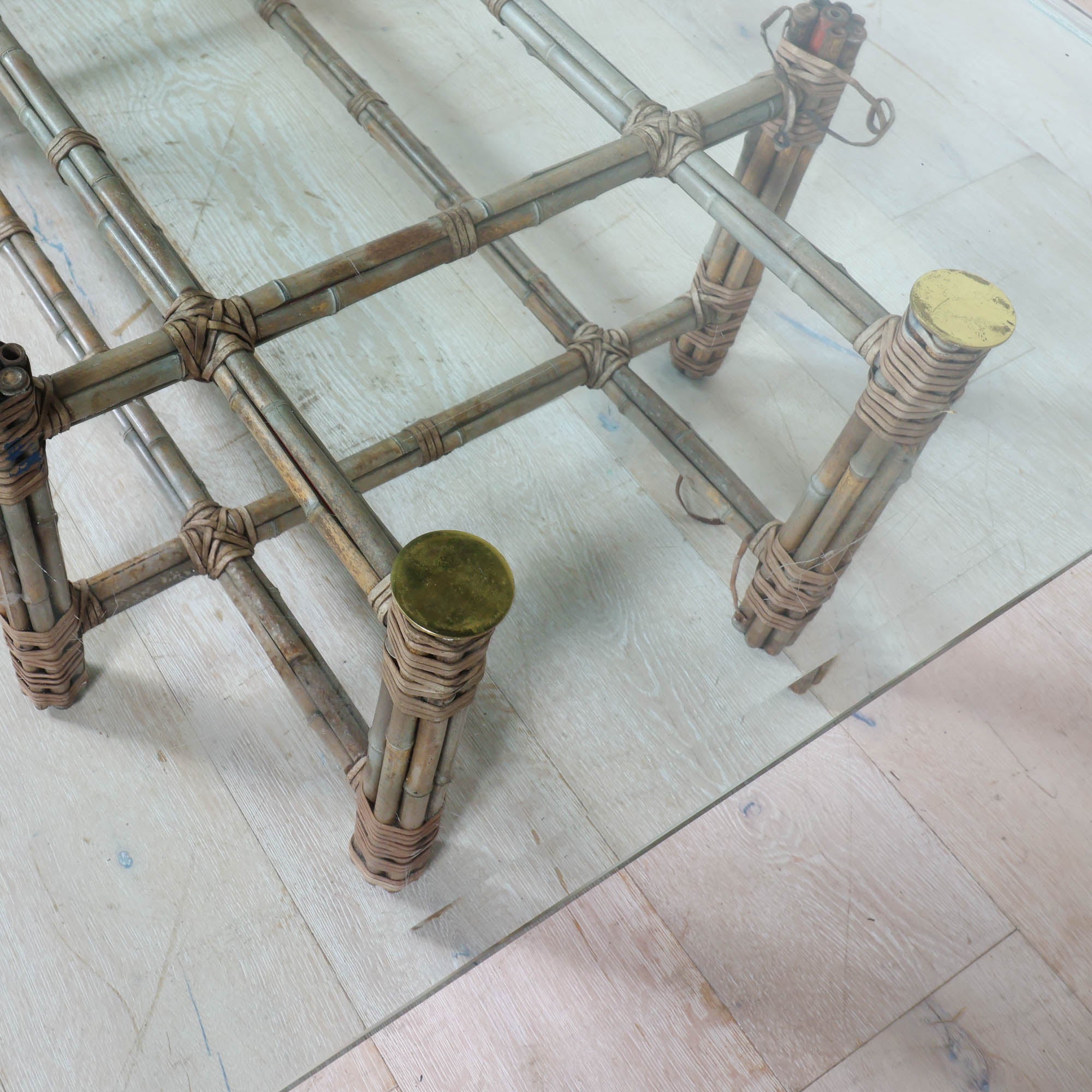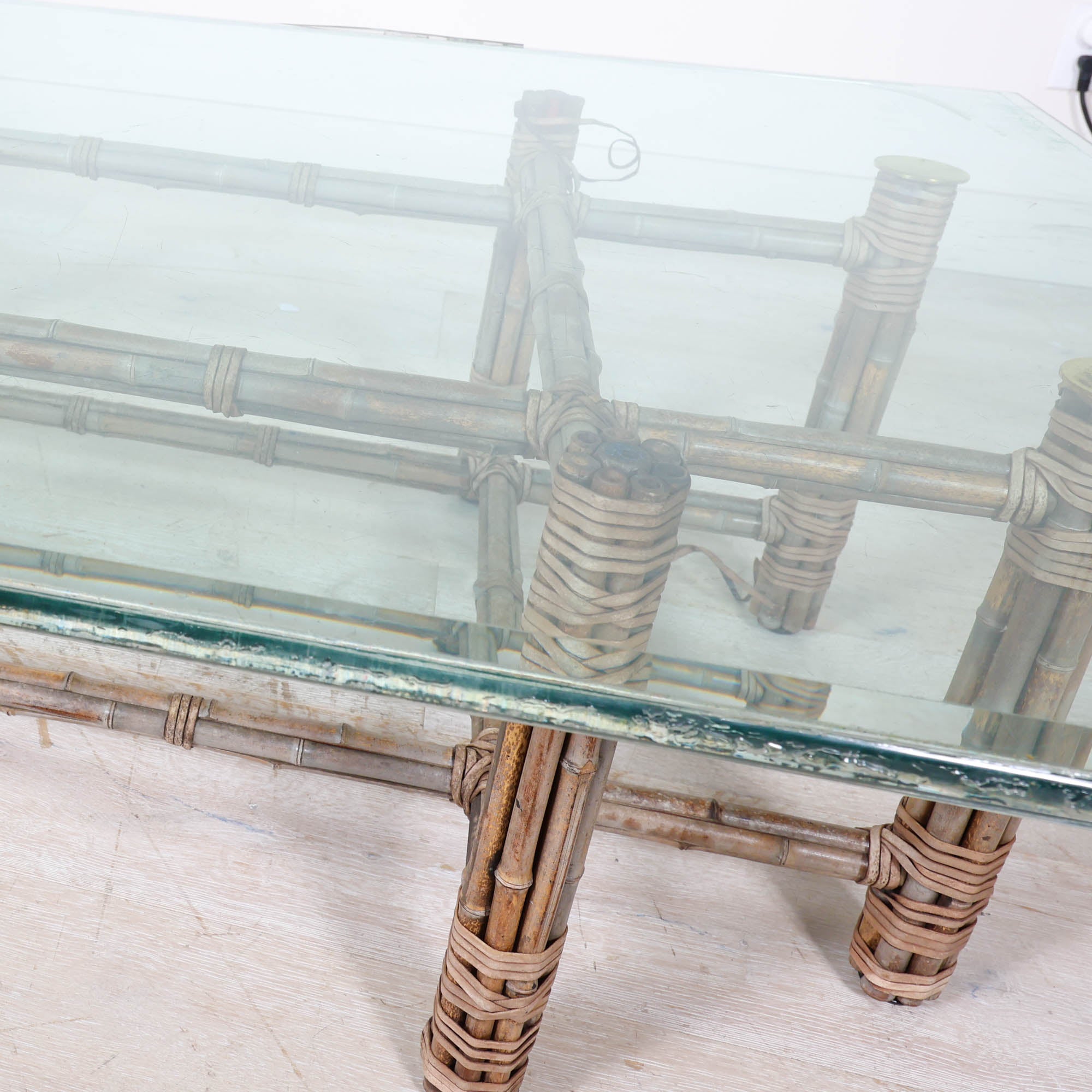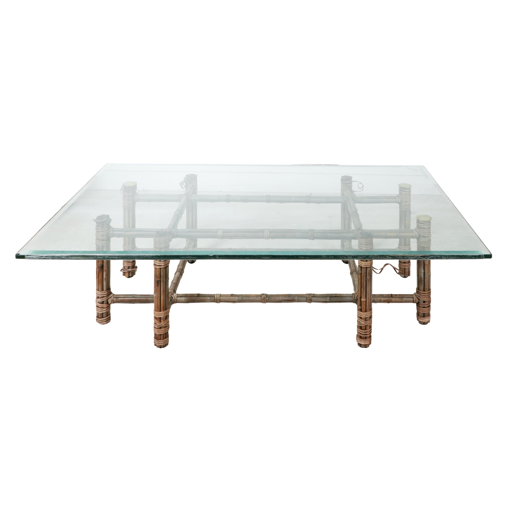 An effortlessly elegant piece from McGuire, known for its masterful use of natural materials. This rectangular coffee table features a beautifully constructed bamboo frame with signature rawhide lashings, topped with a thick clear glass surface that lets the sculptural base remain the focal point.