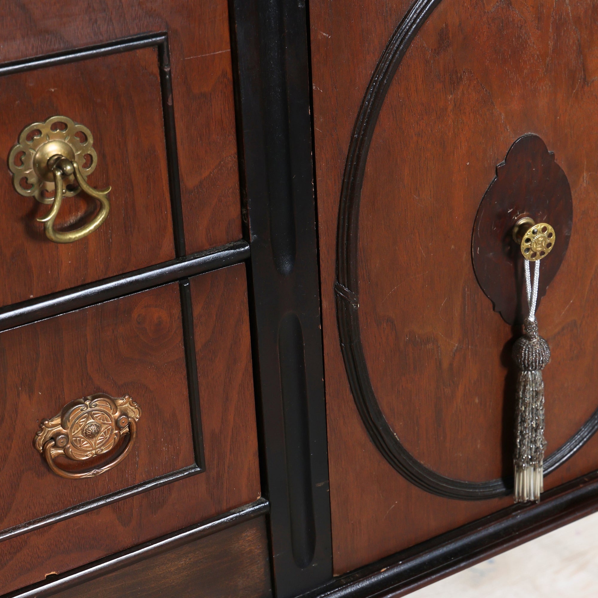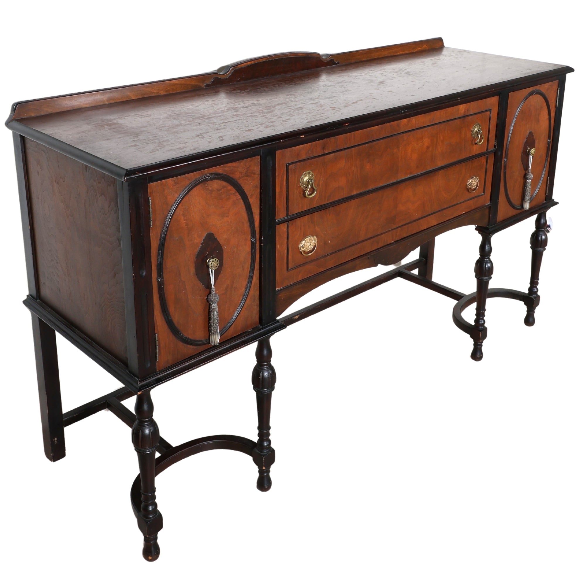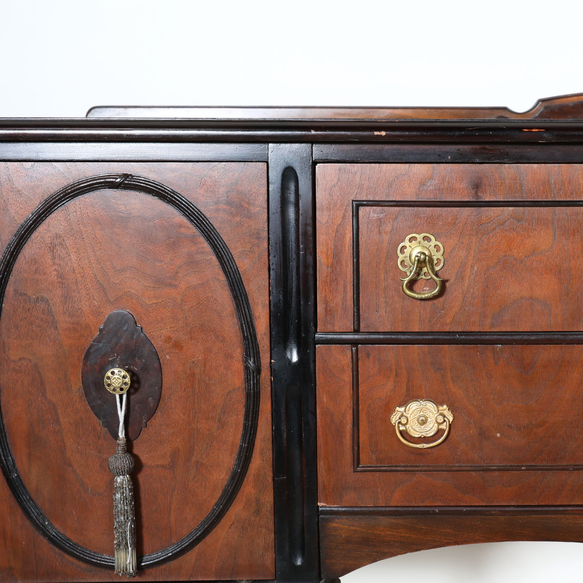 Antique George III style mahogany bowfront sideboard, featuring a shaped top, central drawer, flanking cabinets, and decorative brass hardware. Beaded tassels adorn the outer doors.