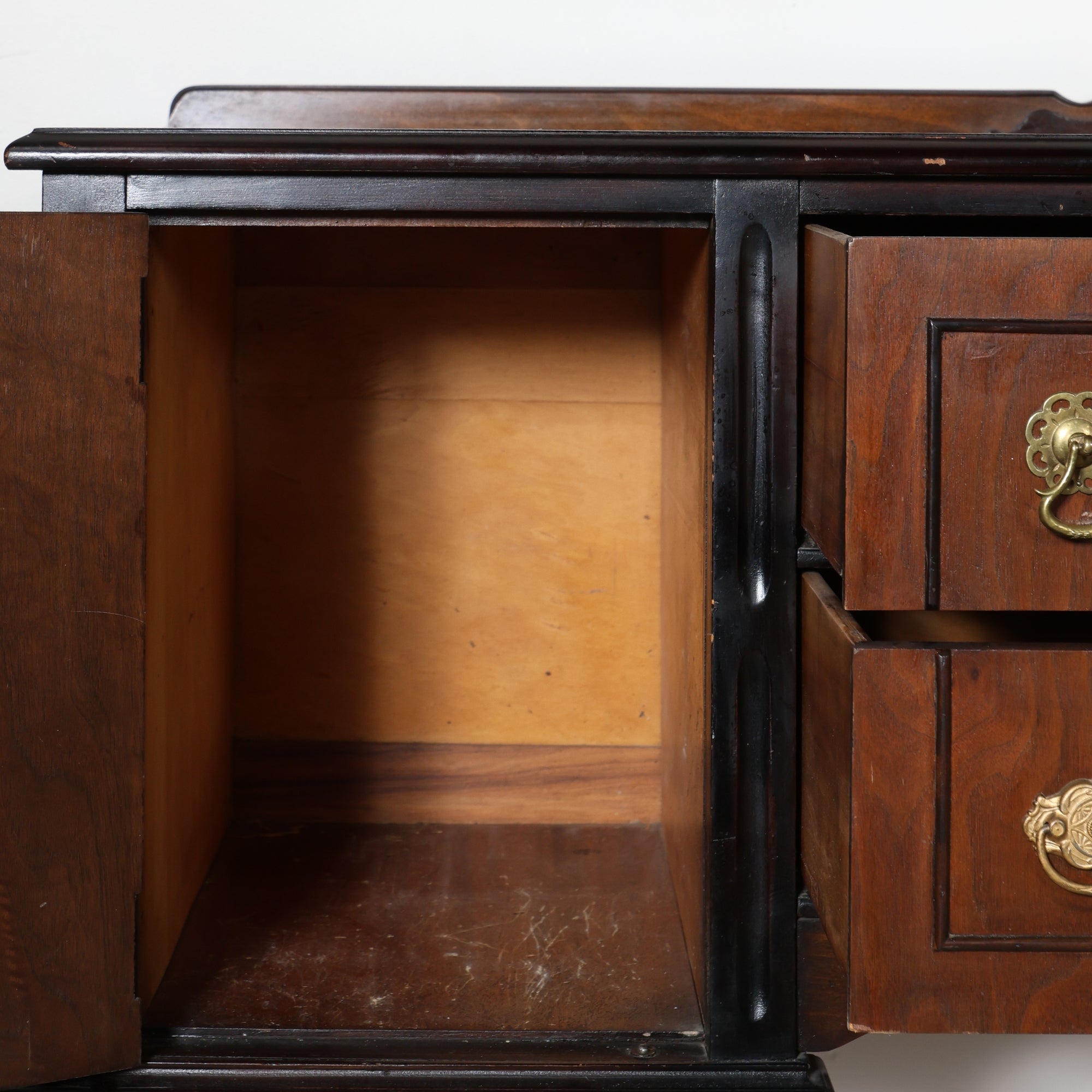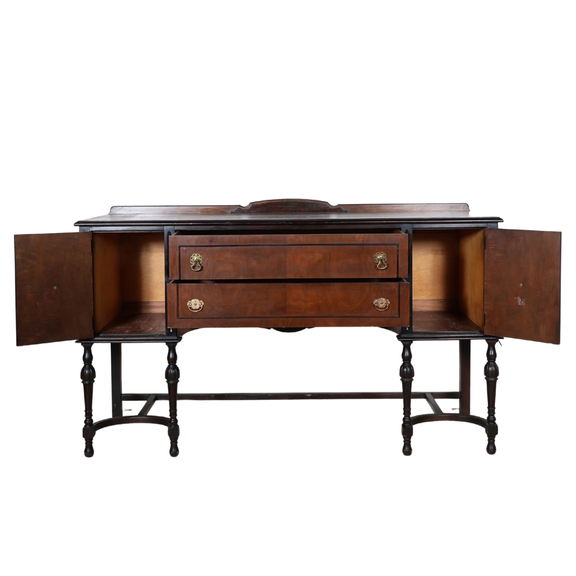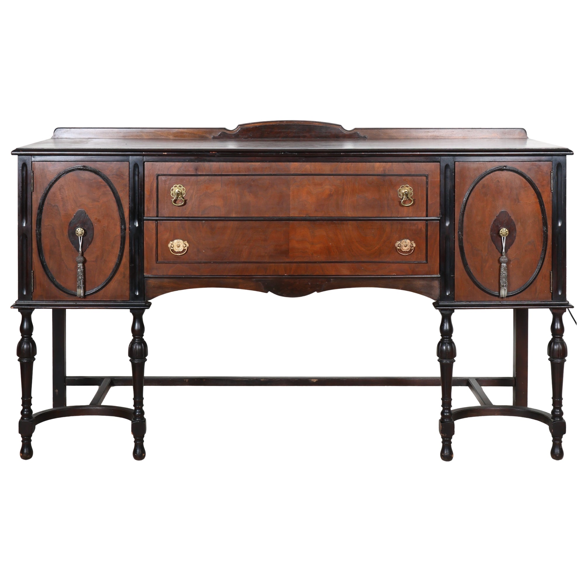 Antique George III style mahogany bowfront sideboard, featuring a shaped top, central drawer, flanking cabinets, and decorative brass hardware. Beaded tassels adorn the outer doors.