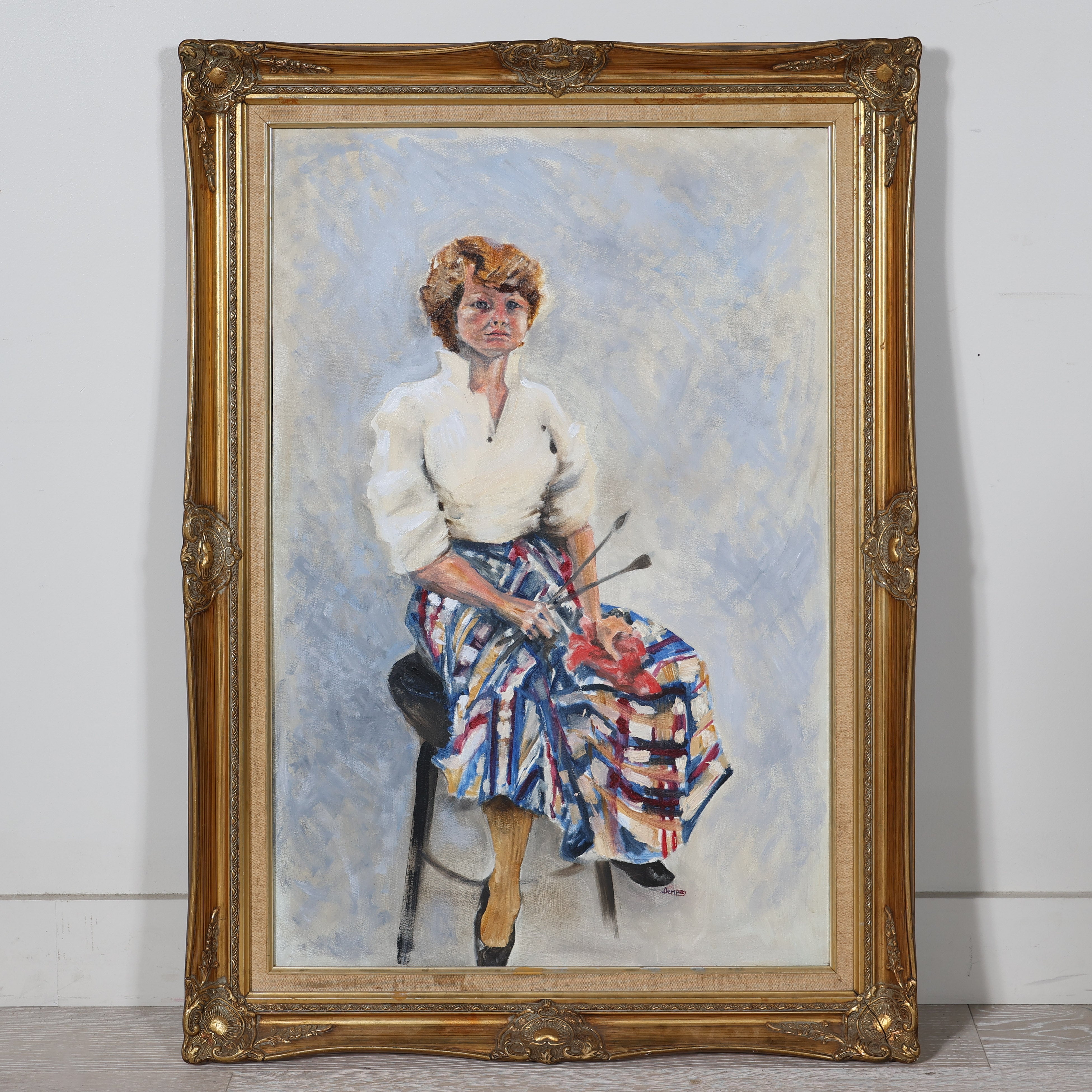Both elegant and slightly playful, this portrait brings color, personality, and a strong artistic presence to any space. Signed by the artist "Dempsey."