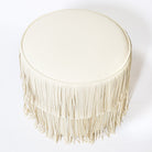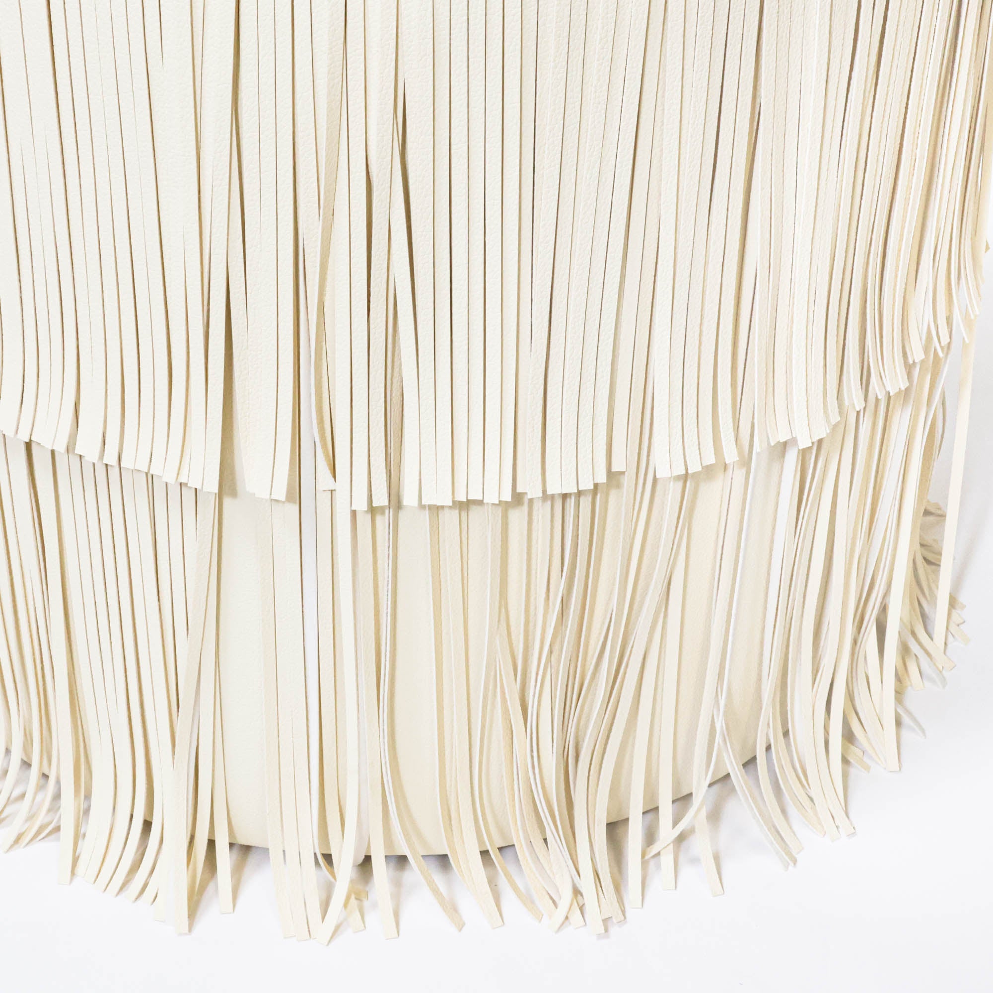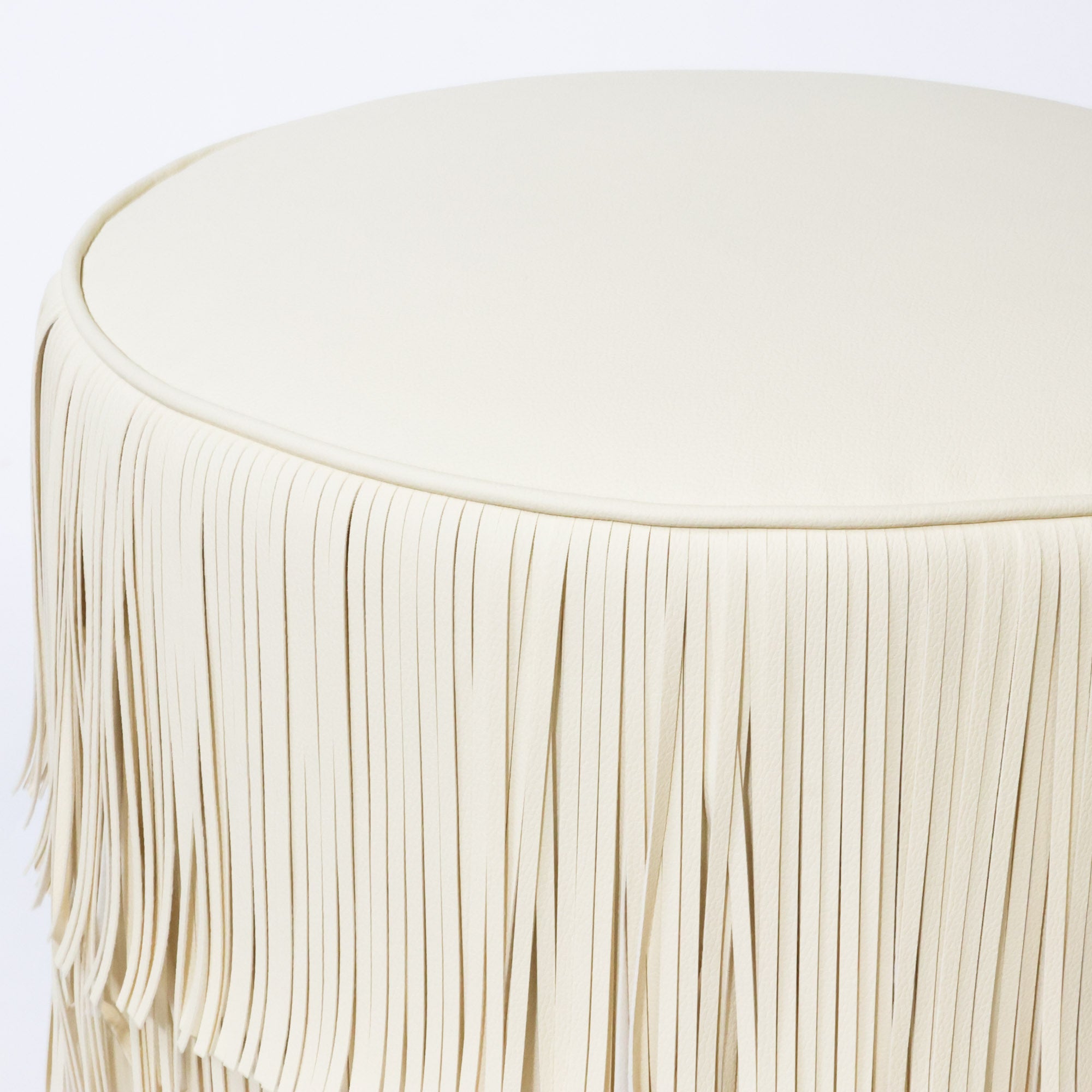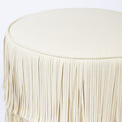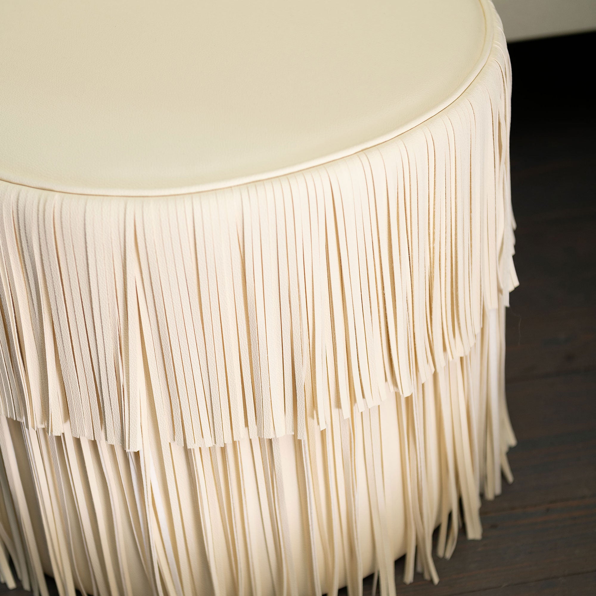 This ivory leather ottoman takes charge with a sassy fringe facade. Perfect for extra living room seating, under artwork, or paired with a console. The options are endless!