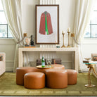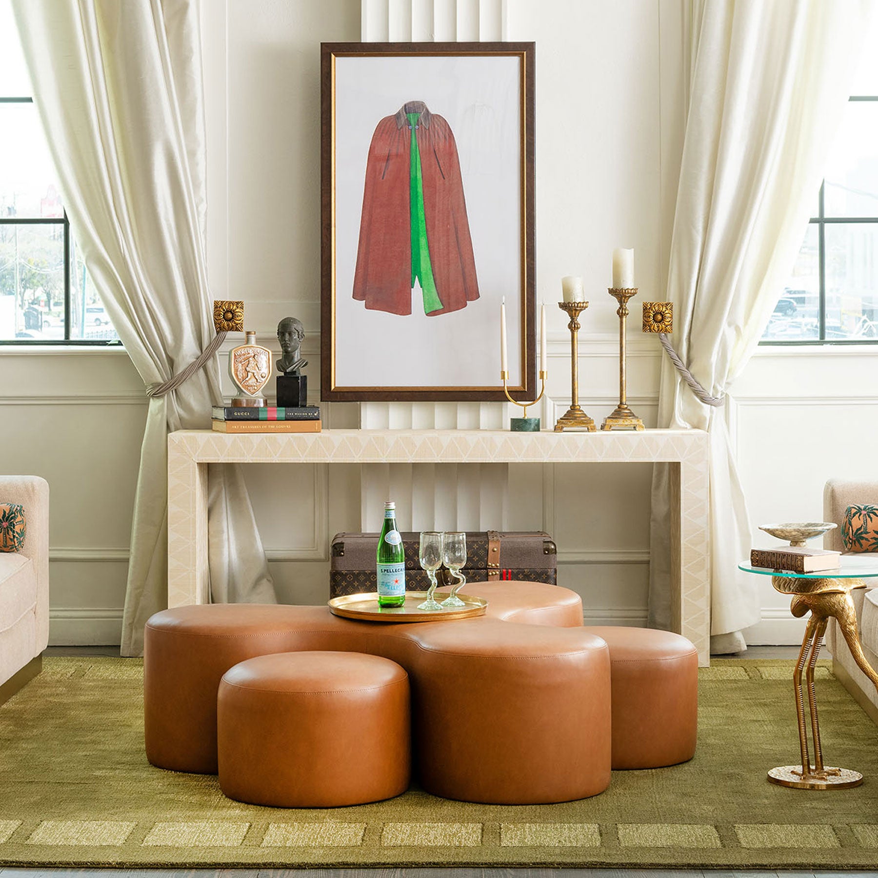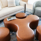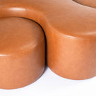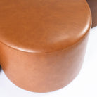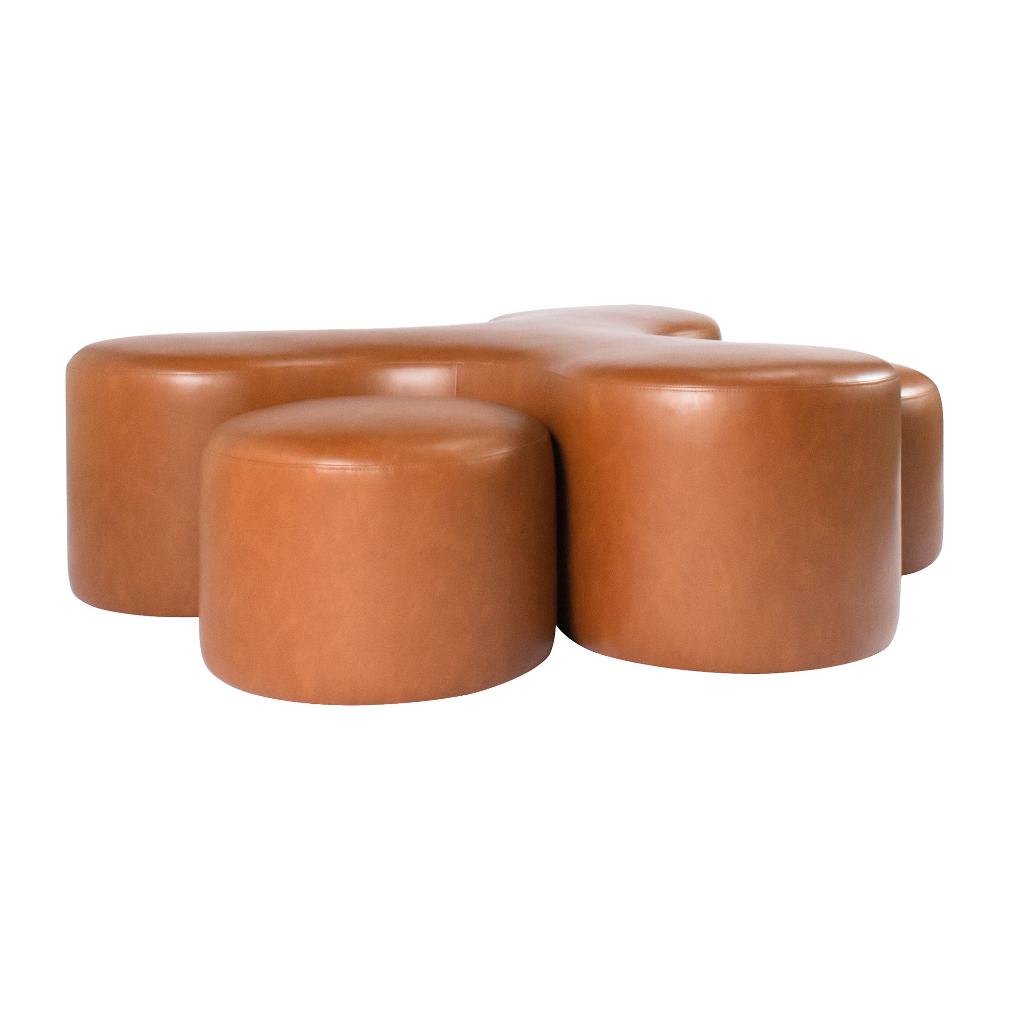 Flexible and modern, the Elvie Ottoman features a circular design and smaller, connecting ottomans for extra seating. The unique shape is upholstered in our brown vegan leather.