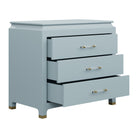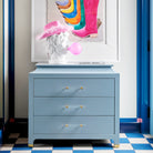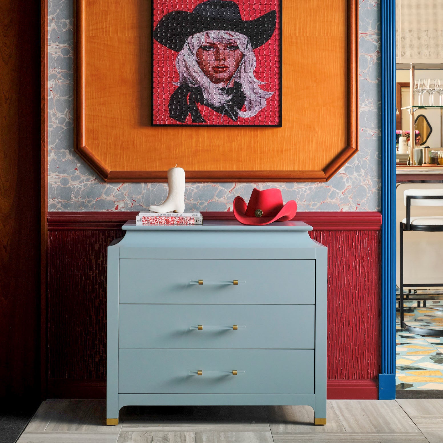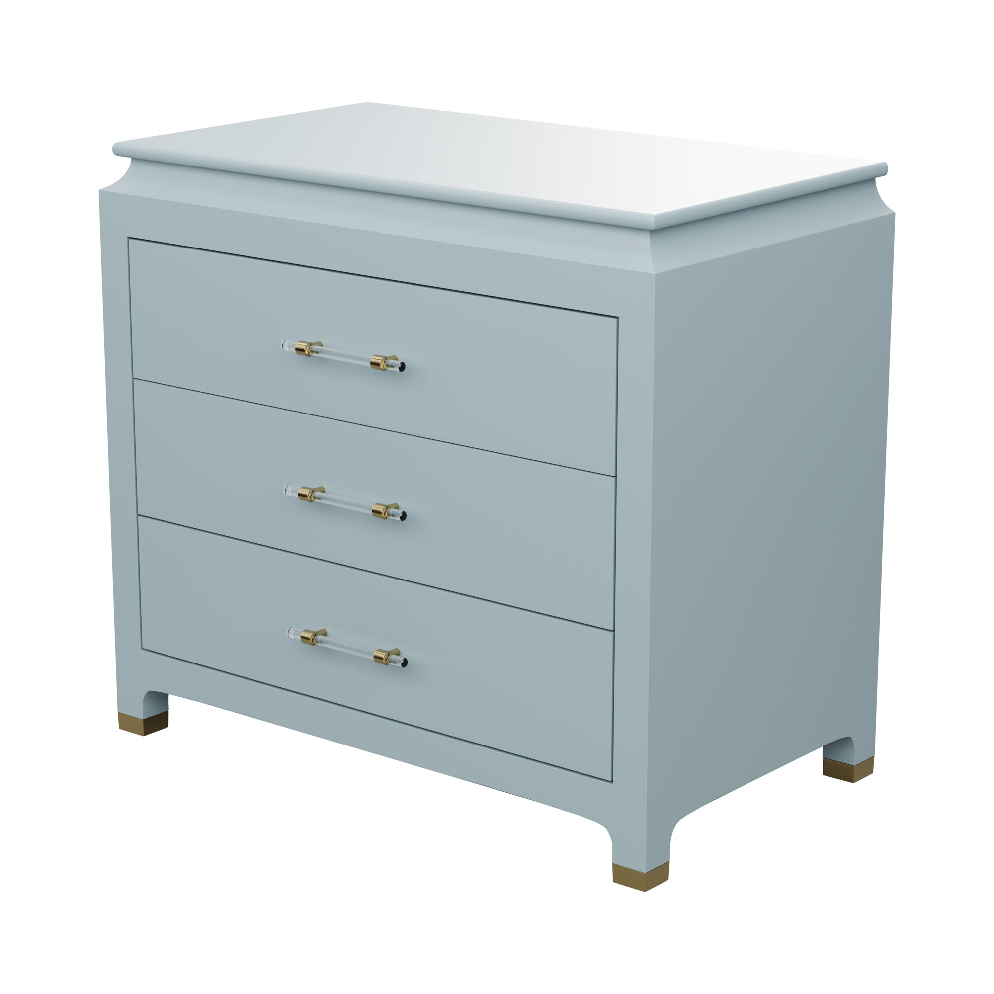 Sly and masterful, our Espionage Chest steals the show with its unique design. Smoke blue lacquer is accented with acrylic/brushed brass handles with brass sabots for a refined look.