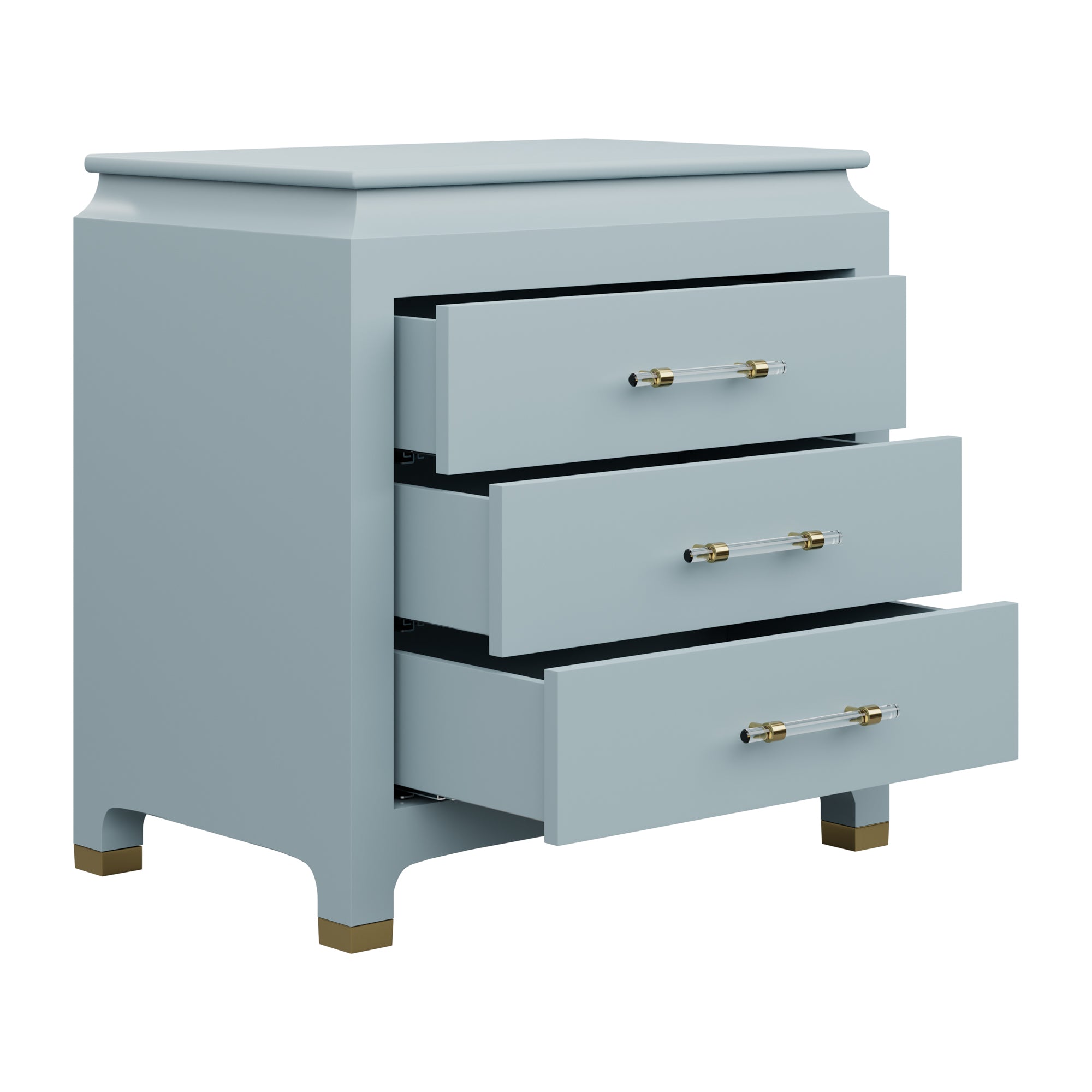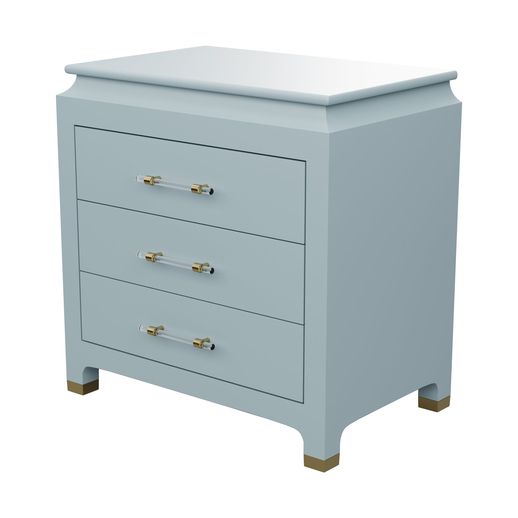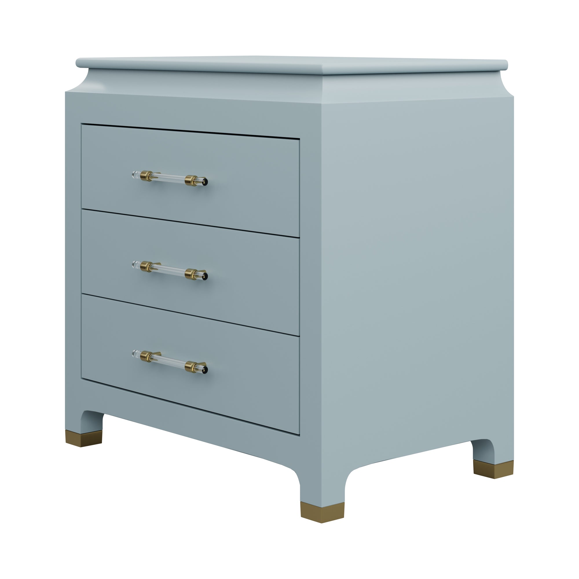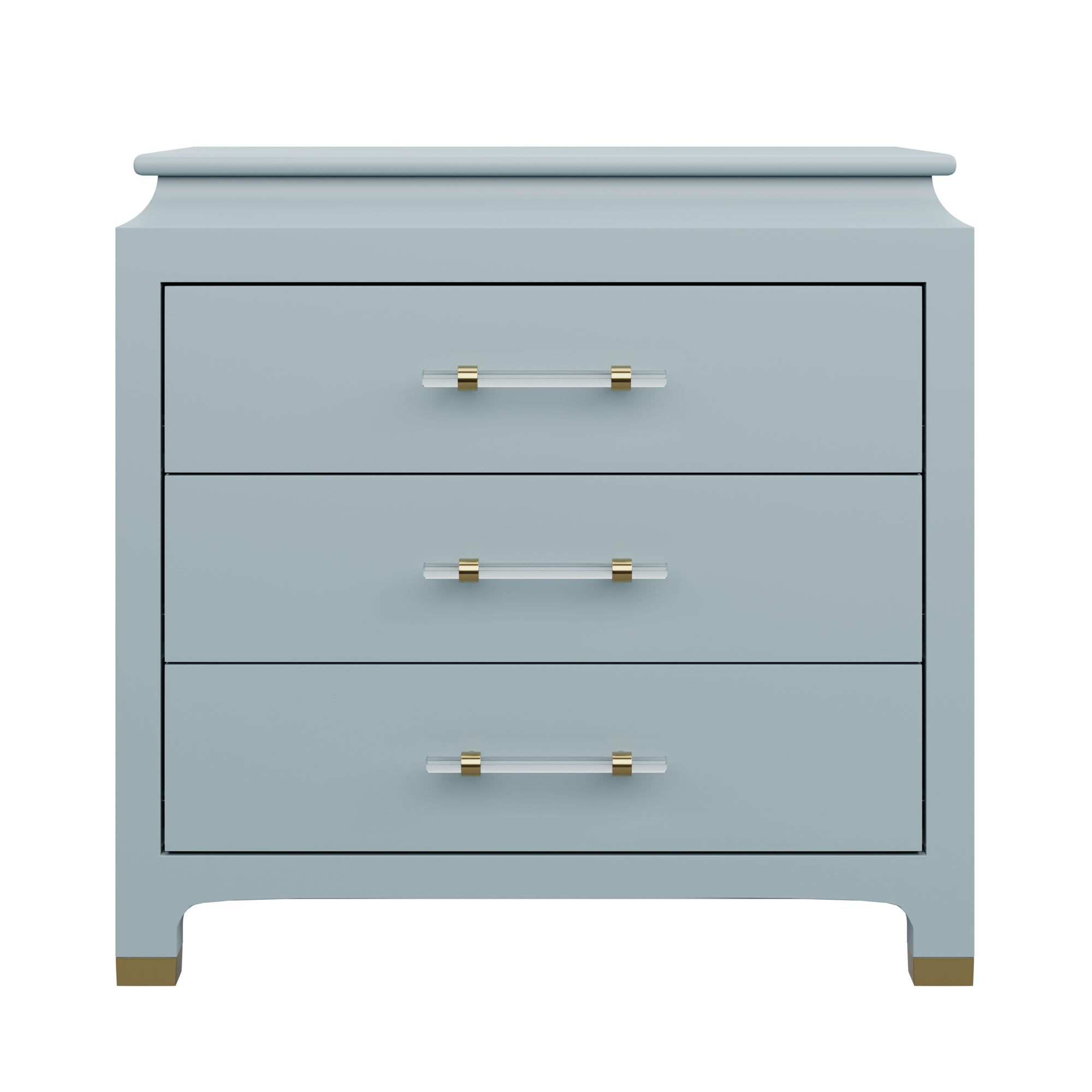 Sly and masterful, our Espionage Chest steals the show with its unique design. Smoke blue lacquer is accented with acrylic/brushed brass handles with brass sabots for a refined look.