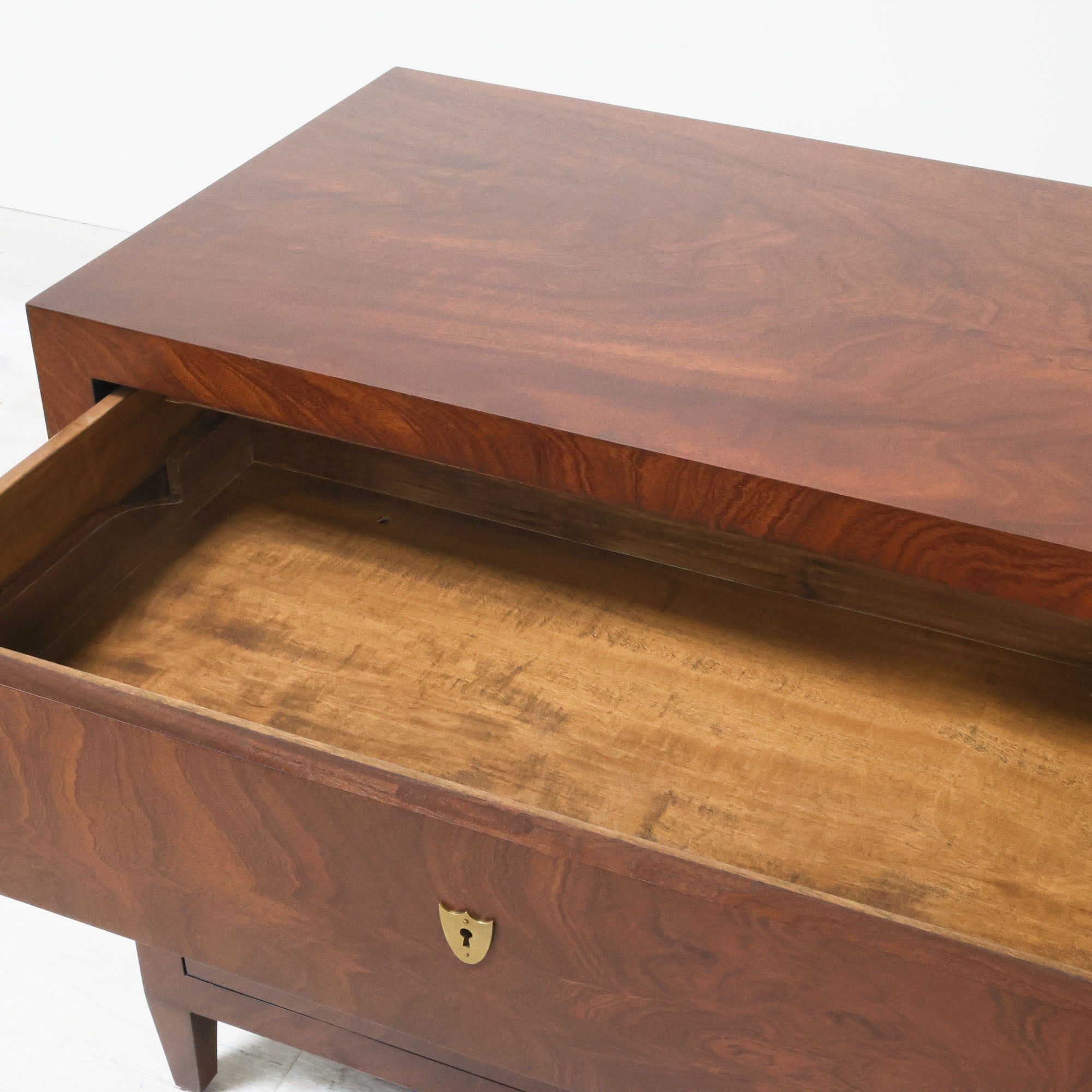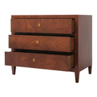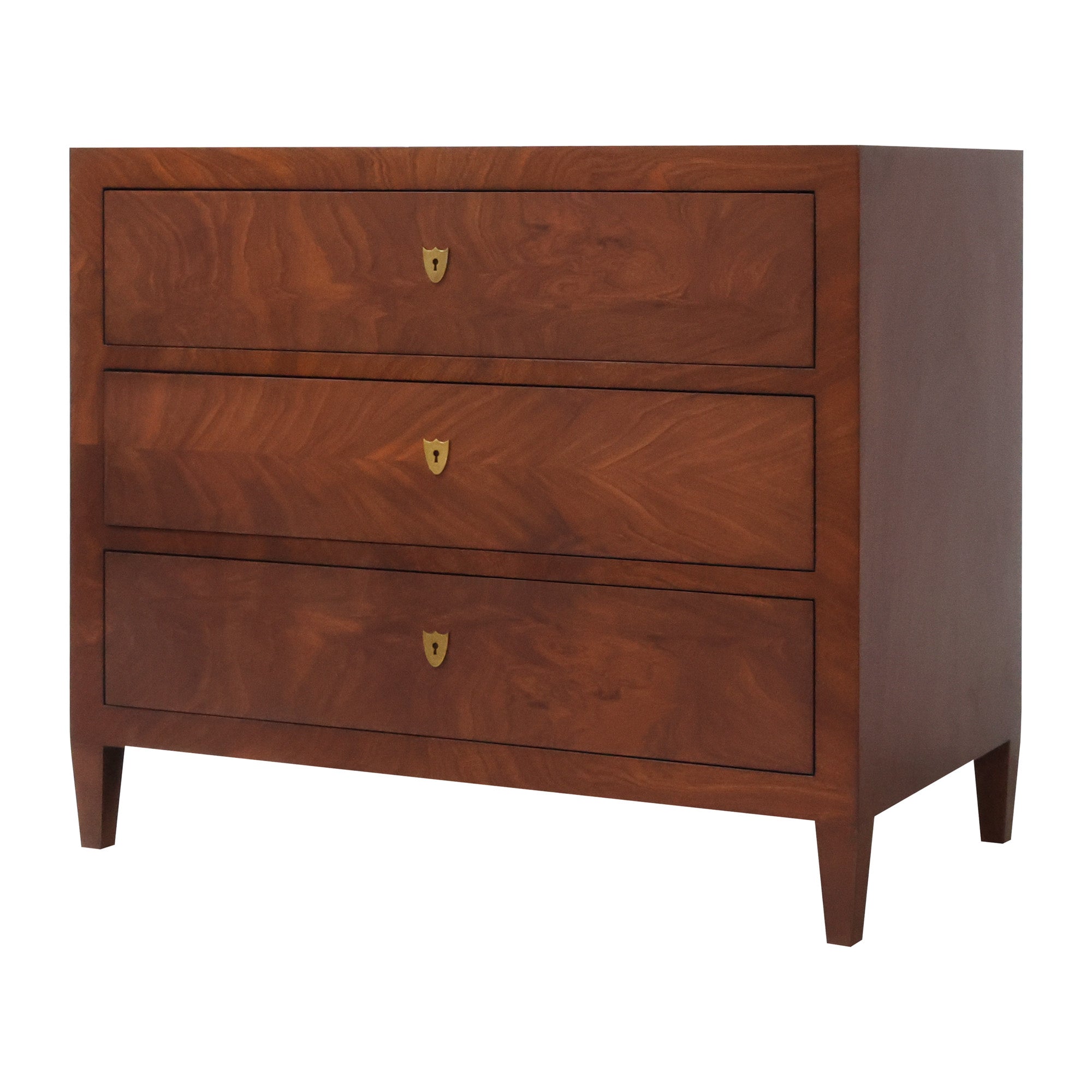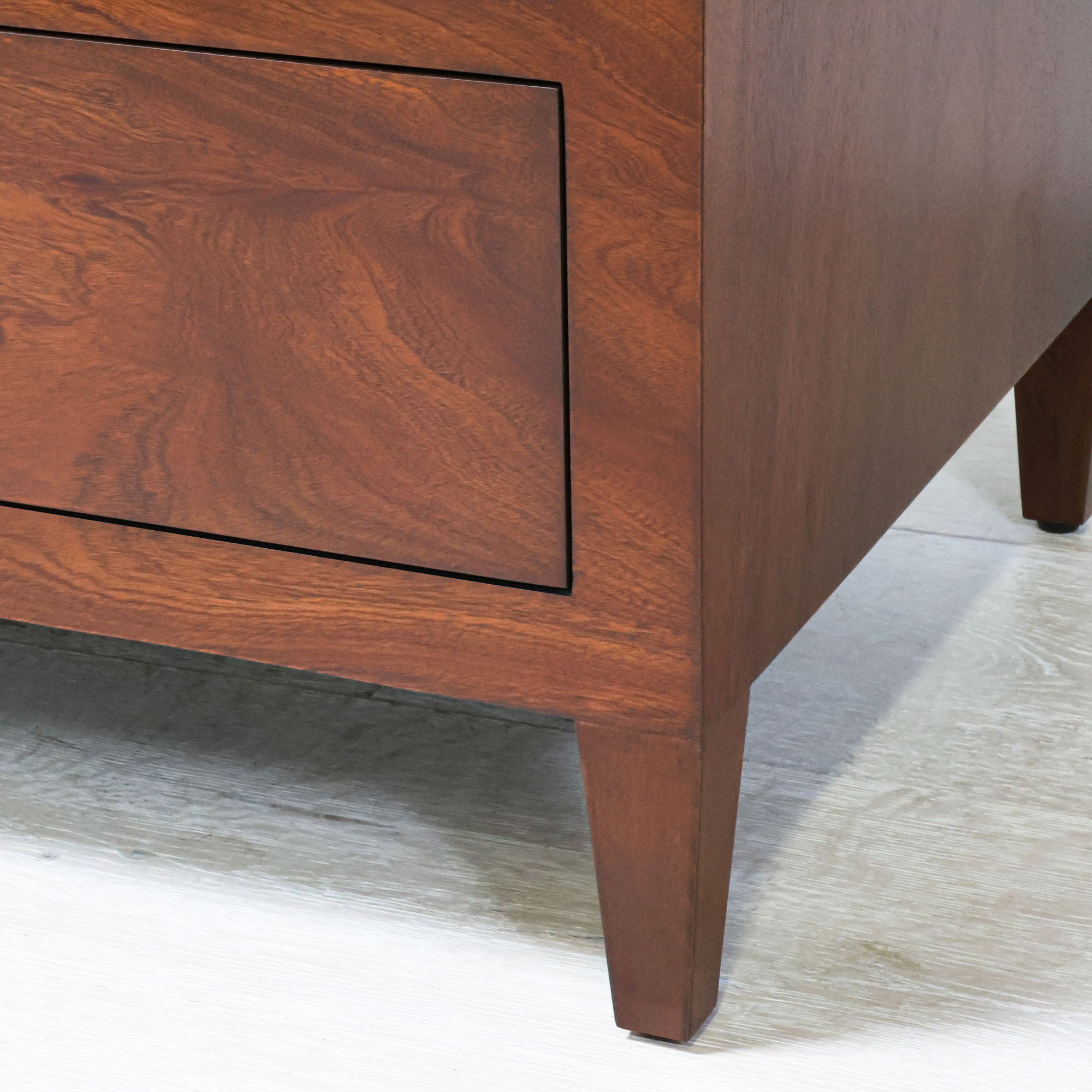 Fashionable and functional, the design of our Esquire Chest features clean, straight lines and legs that subtly taper. An uncommon Mahogany Swirl Veneer adds an organic touch of visual intrigue, while brass escutcheon hardware further elevates this stately chest.