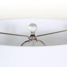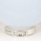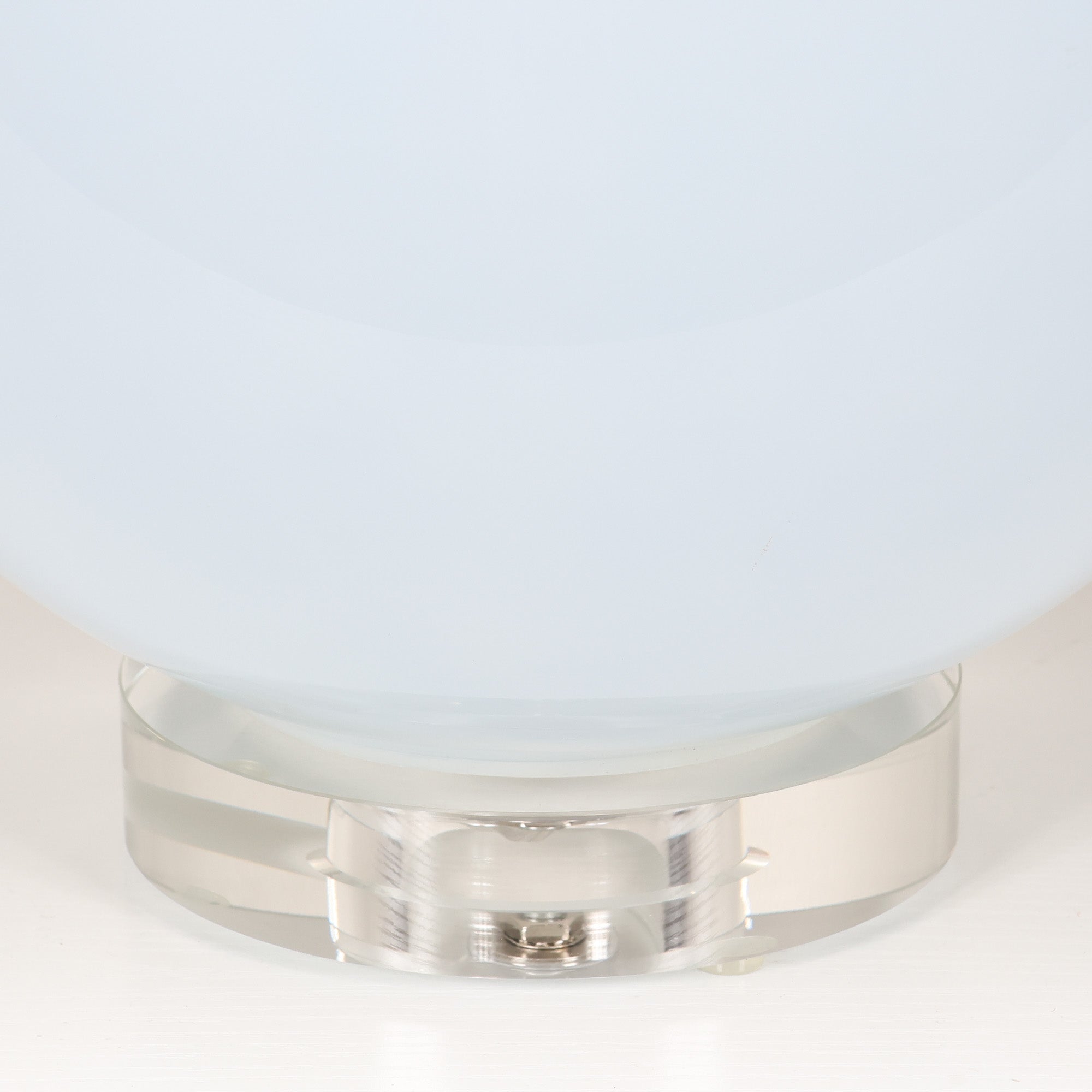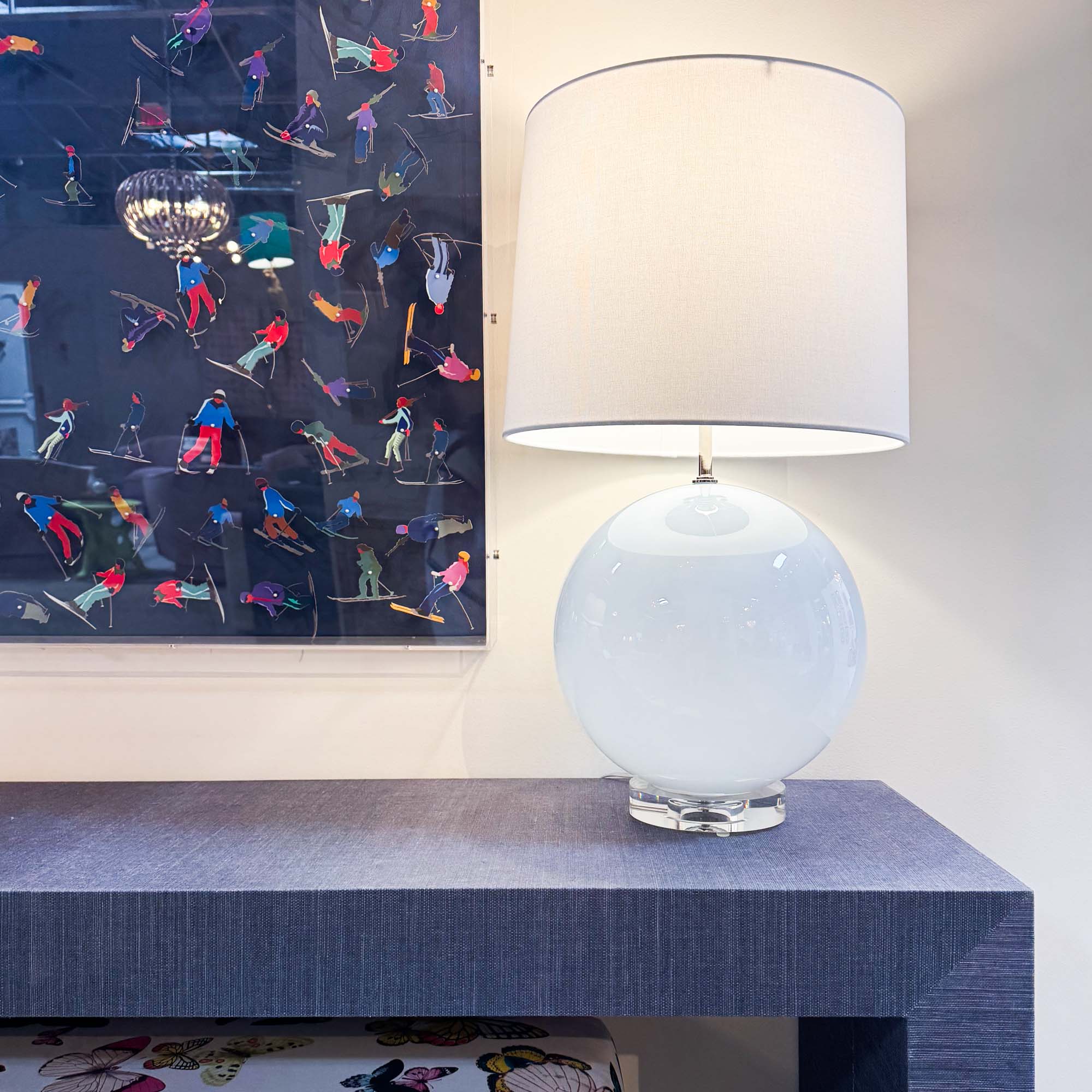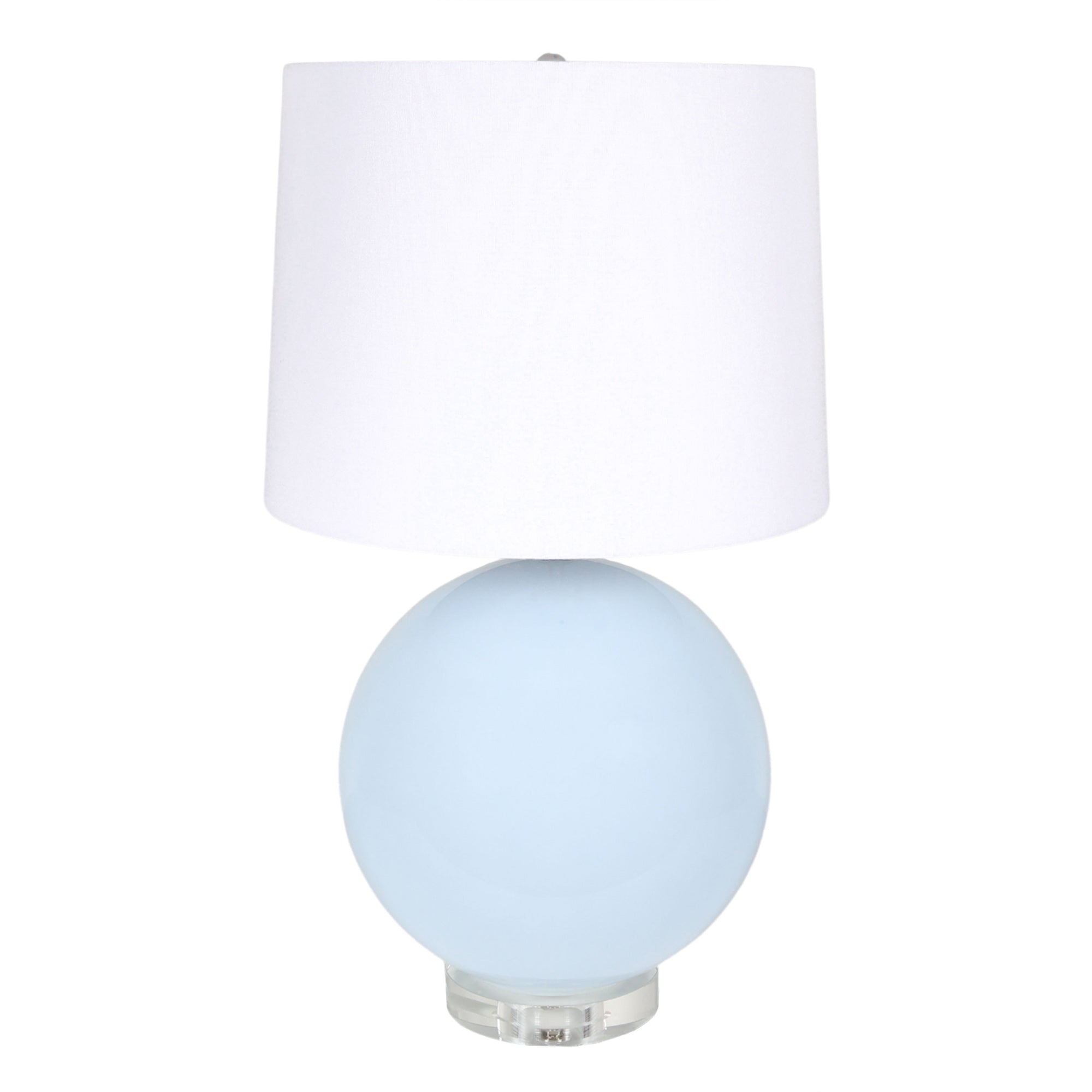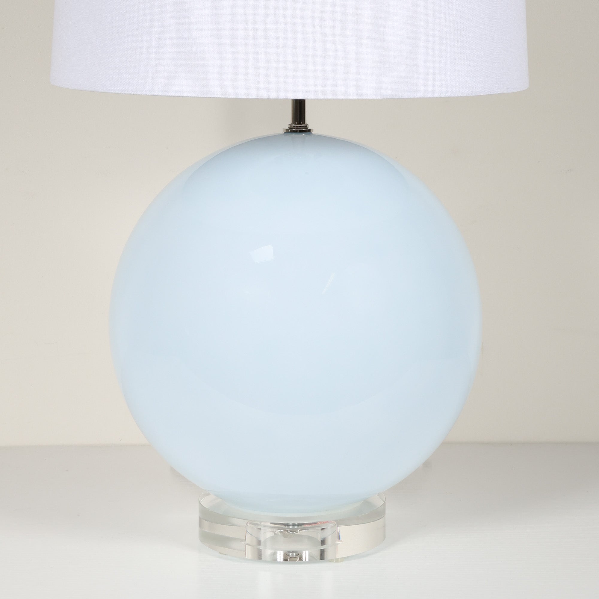 This gorgeous Italianate hand blown glass lamp features an acrylic base and a white linen shade with a round acrylic finial. We love the crisp light blue hue on this graceful design.