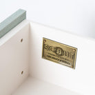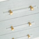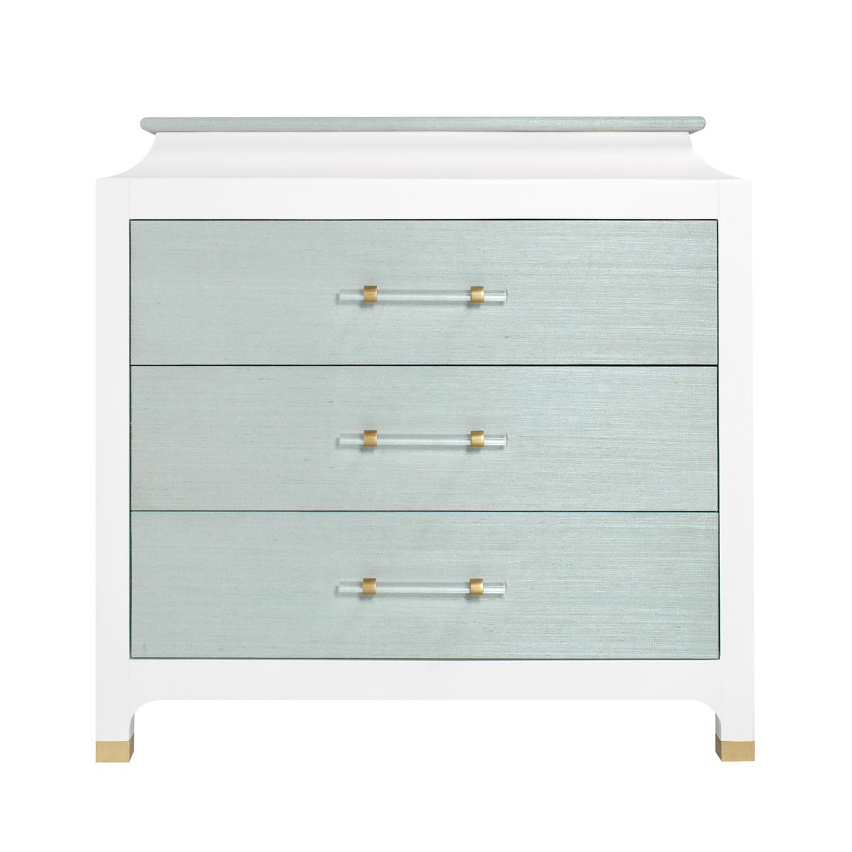 The Recon features a white lacquer finish with the drawers and top in our Caroline Grasscloth. Finished with acrylic and brushed brass handles with brass sabots for a glamorous look.