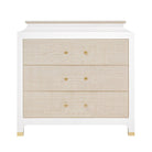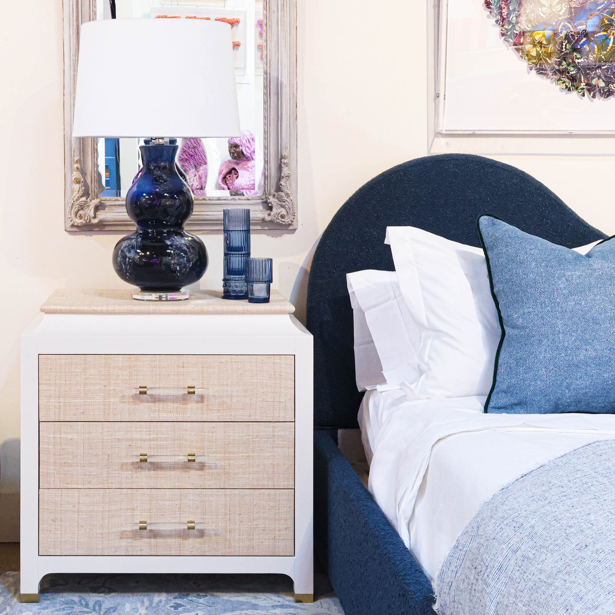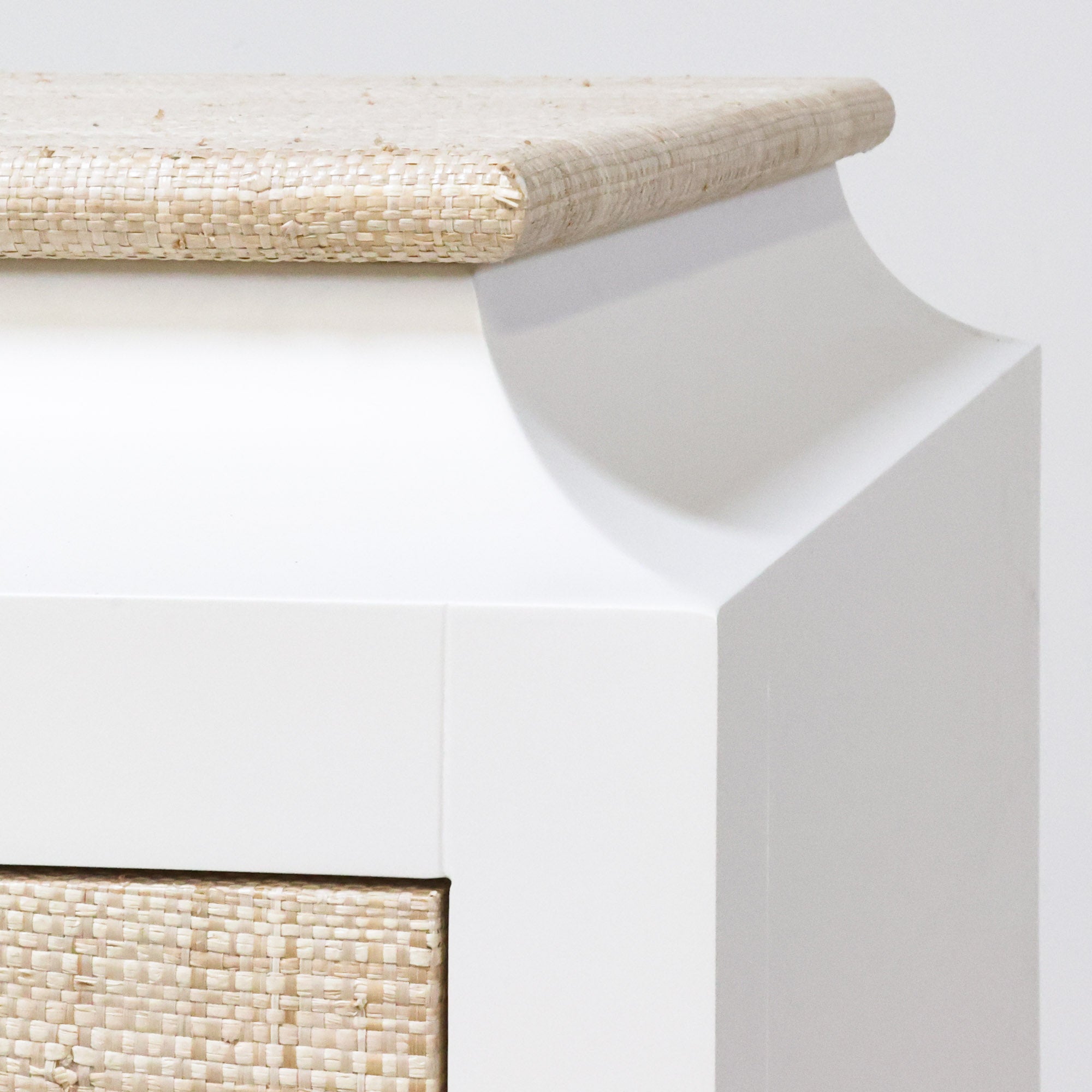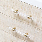 The Recon features a white lacquer finish with the drawers and top in our Noah Raffia Grasscloth. Finished with acrylic and brushed brass handles with brass sabots for a glamorous look.