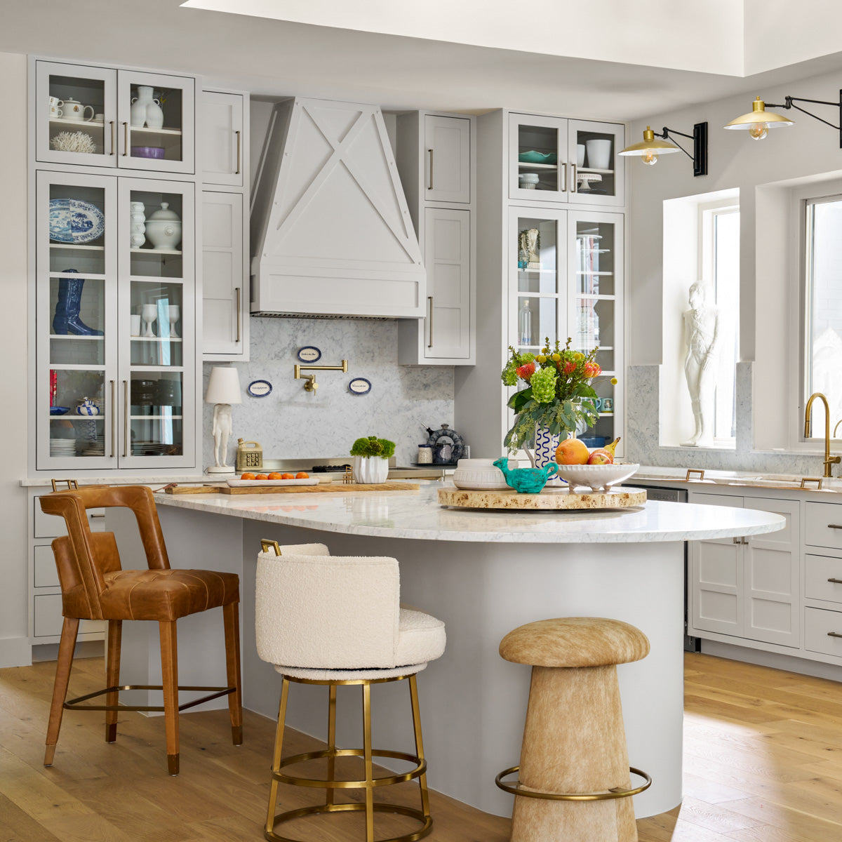 Featuring a brushed antique brass frame and soft ivory boucle fabric. A 360º swivel lets you take in every perspective.