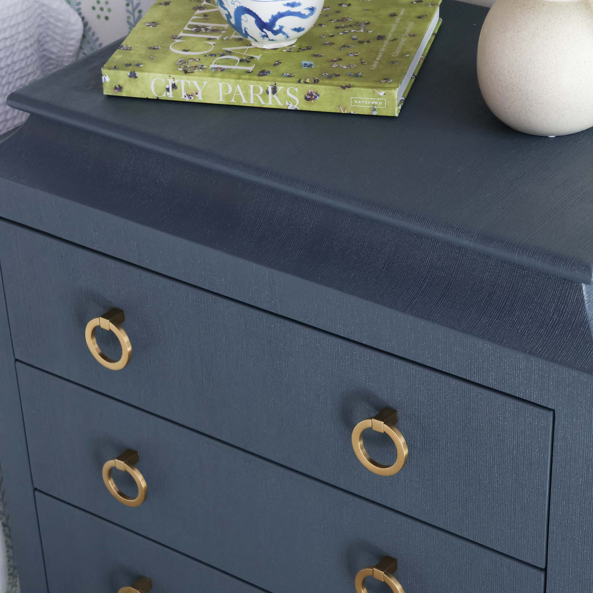 - Engineered wood with a faux linen finish in navy