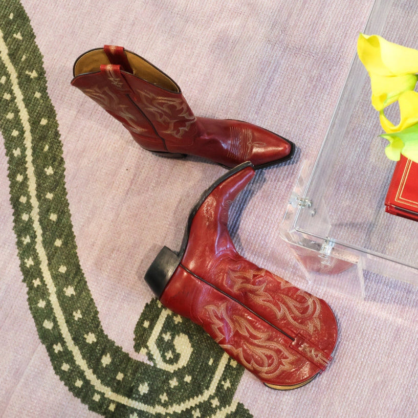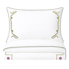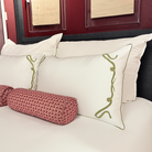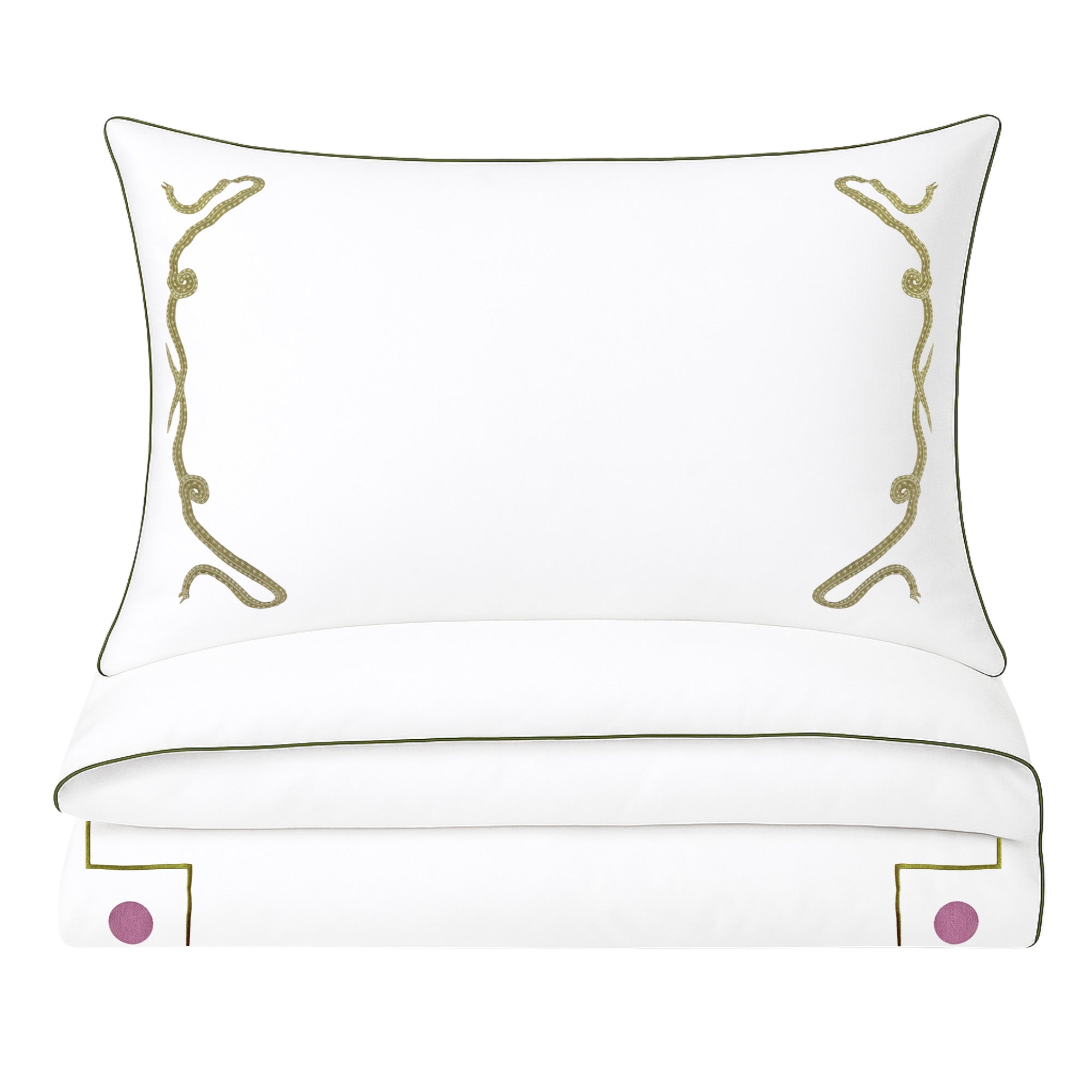 Featuring custom-embroidered vipers and piping on crisp white cotton, this bedding brings a playful twist to classic Western charm.