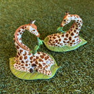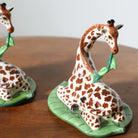 Each sculptural giraffe rests gracefully atop a lush green leaf, delicately holding a vine in its mouth. The hand-painted detailing showcases the collection’s signature rich earth tones and playful sophistication.
