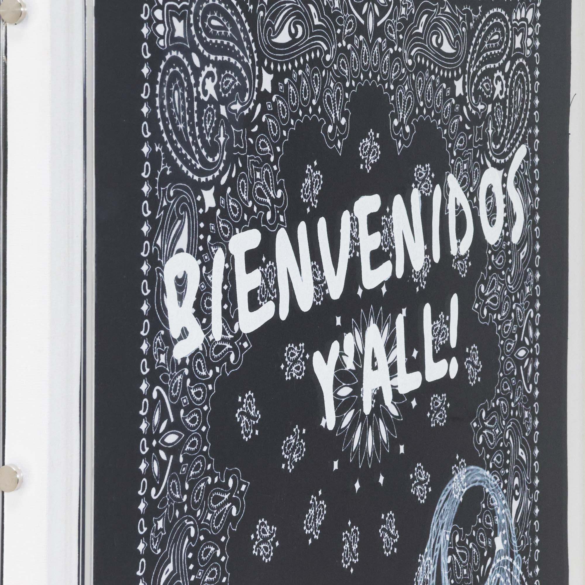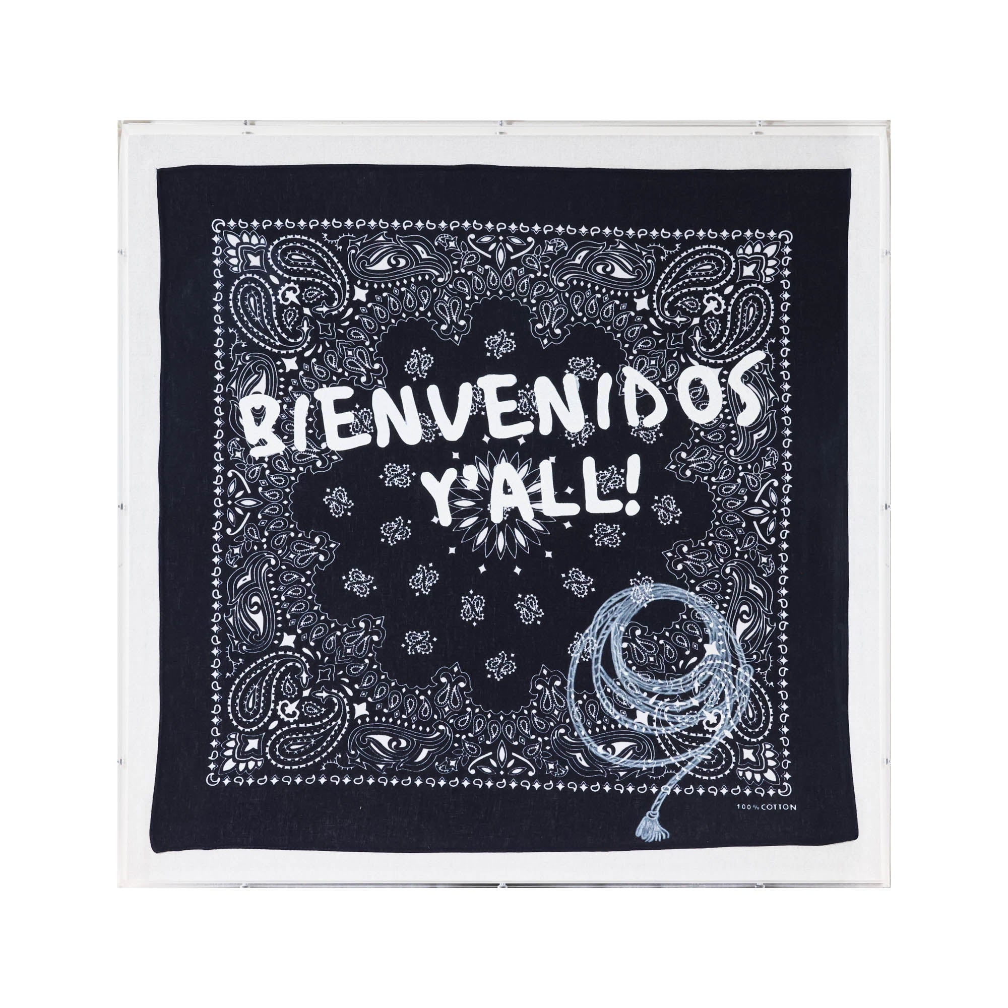 From the Tat Frederick studio, the Bandana Series features bandanas with white printed phrases on each. Framed in an acrylic shadowbox, this piece depicts the saying 'Bienvenidos y'all!' and a lasso rope on a black bandana.