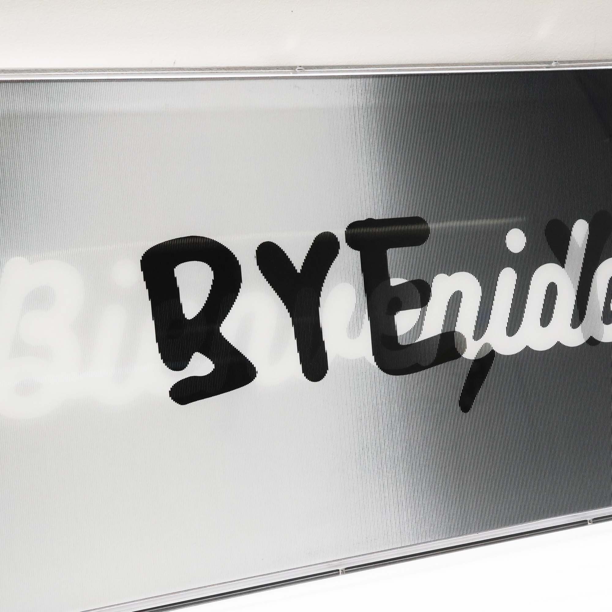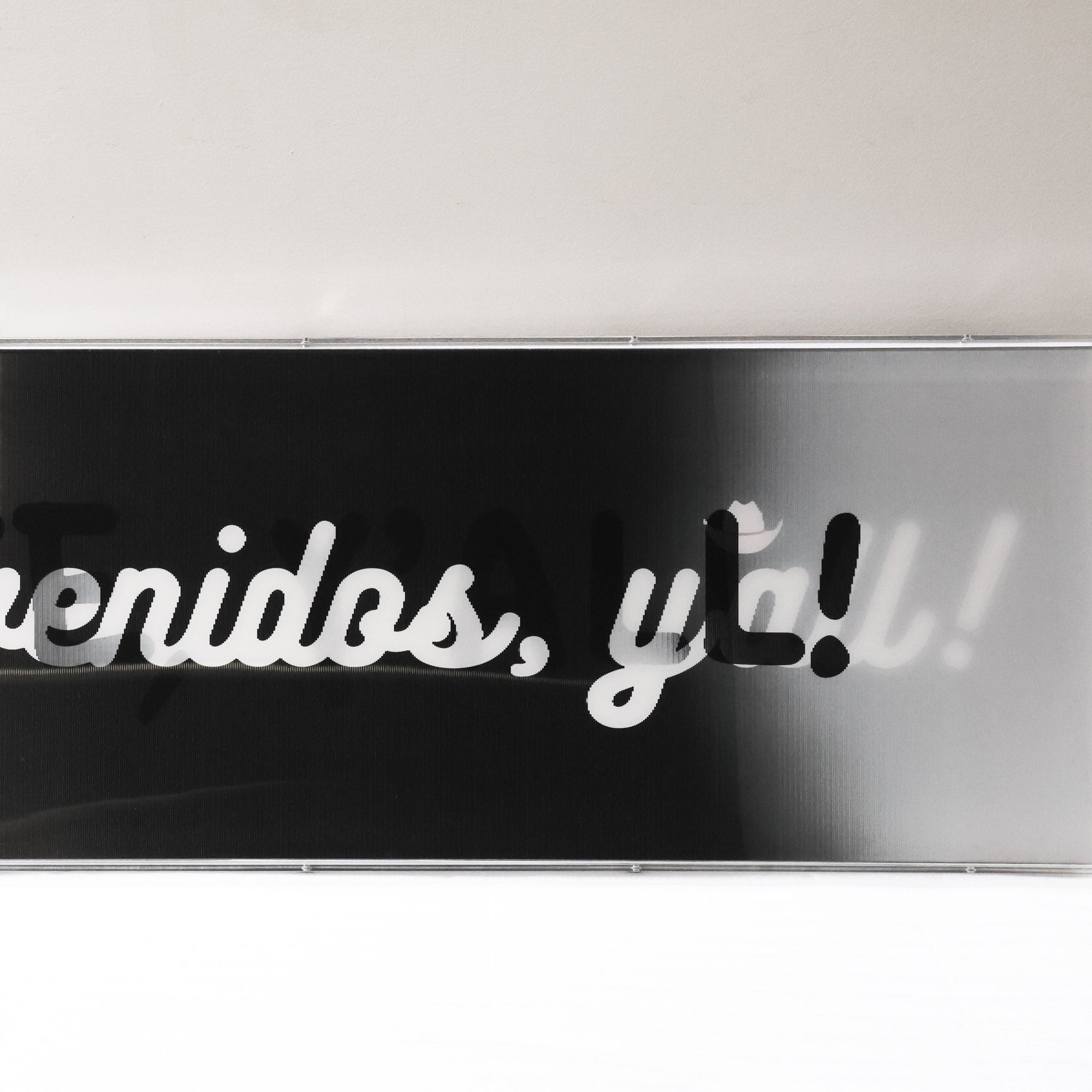 Through lenticular printing technology, this piece alternates between two phrases - "Bienvenidos y'all!" with a cowboy hat and "BYE, Y'ALL!". The message changes as the viewer looks from different vantage points.