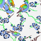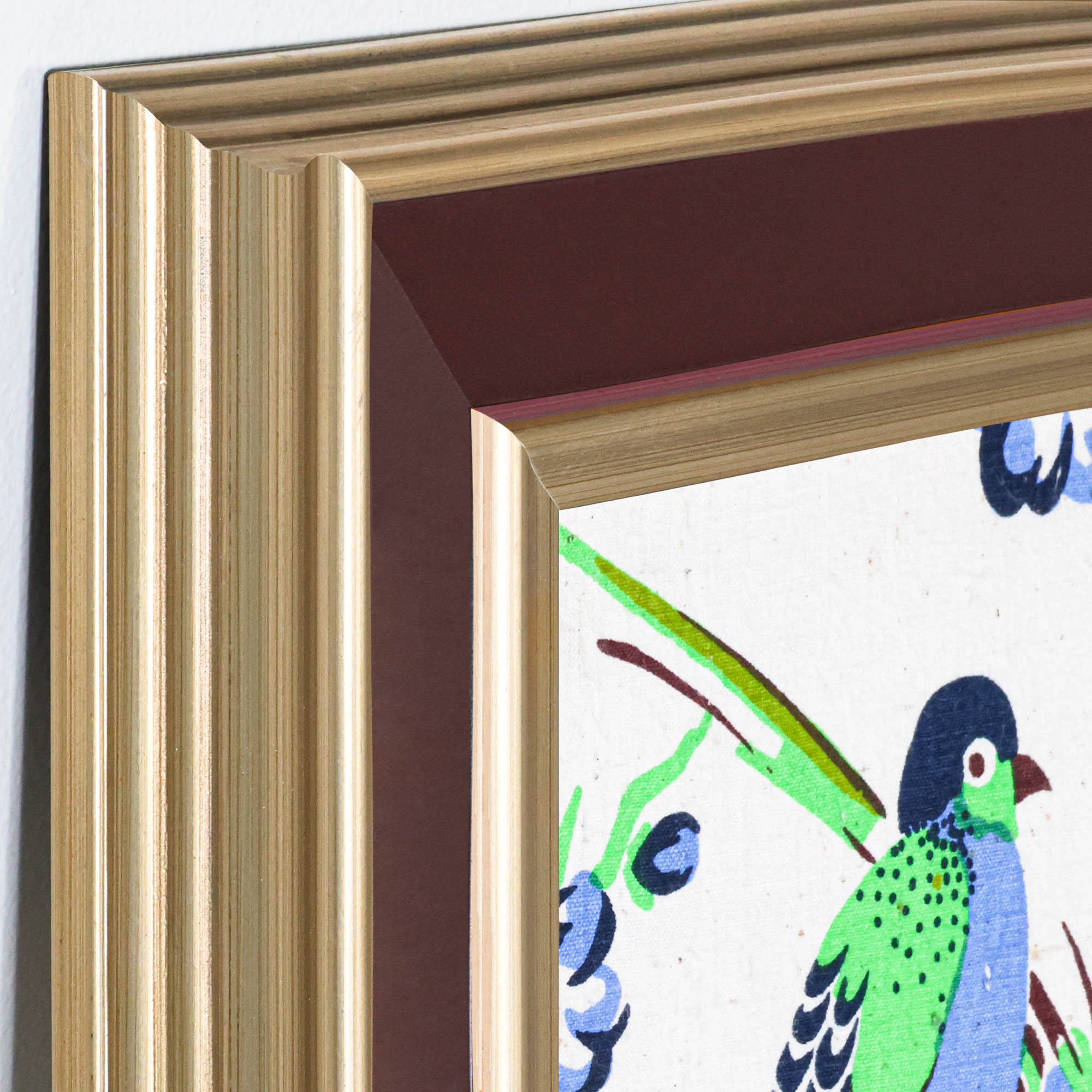 From the Tat Frederick Studio, Birdie Bunch in Plum depicts illustrated feathered friends printed on linen and framed in a gold frame with hand painted plum details.