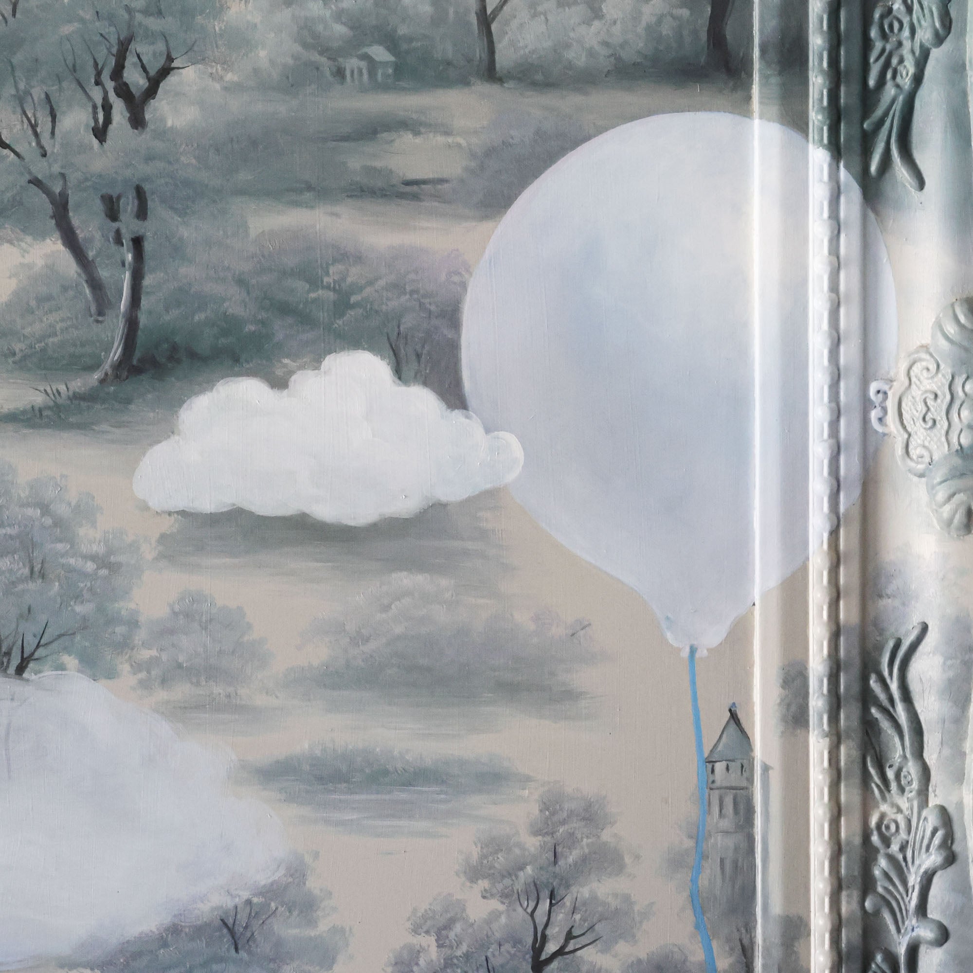 Created by the Tat Frederick studio, Catch My Drift features a hand-painted white balloon floating in the sky against a moody toile background.