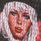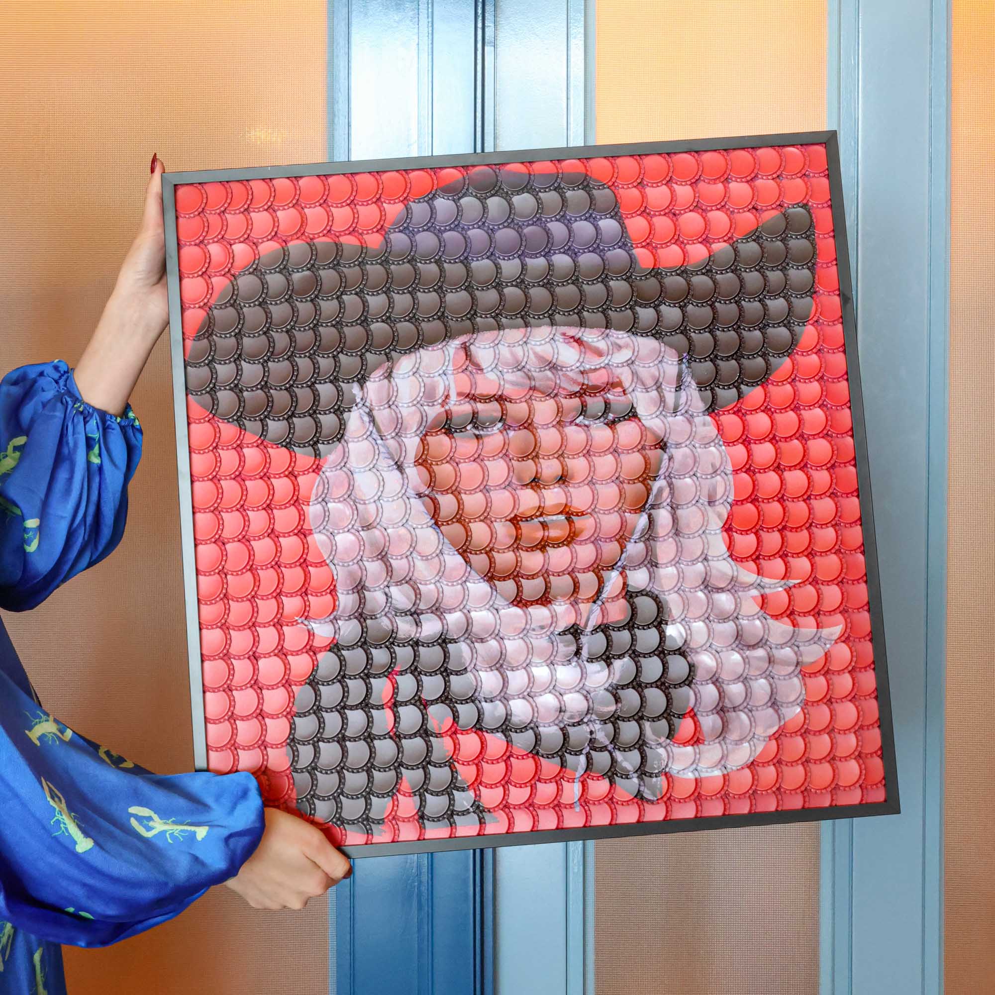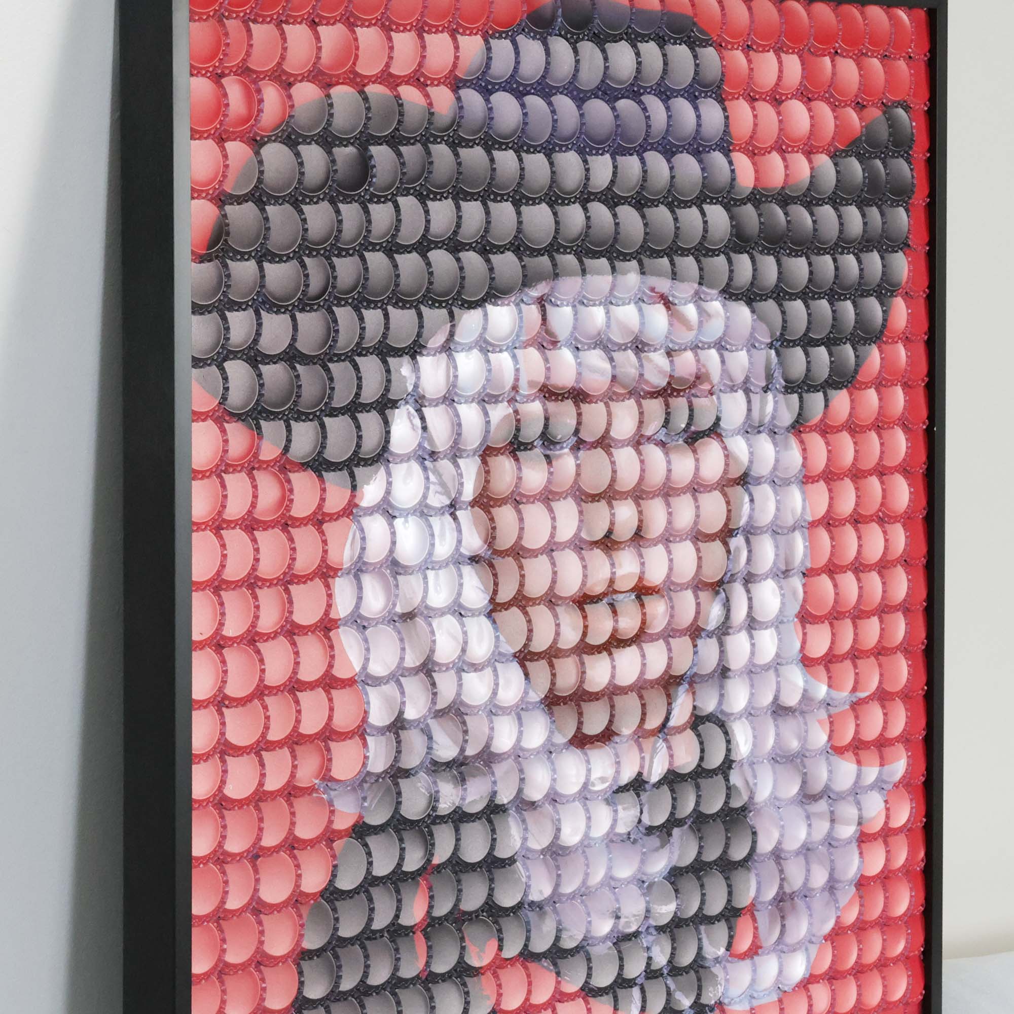 Modern cowgirl artwork made from painted bottle caps by artist Tat Frederick.