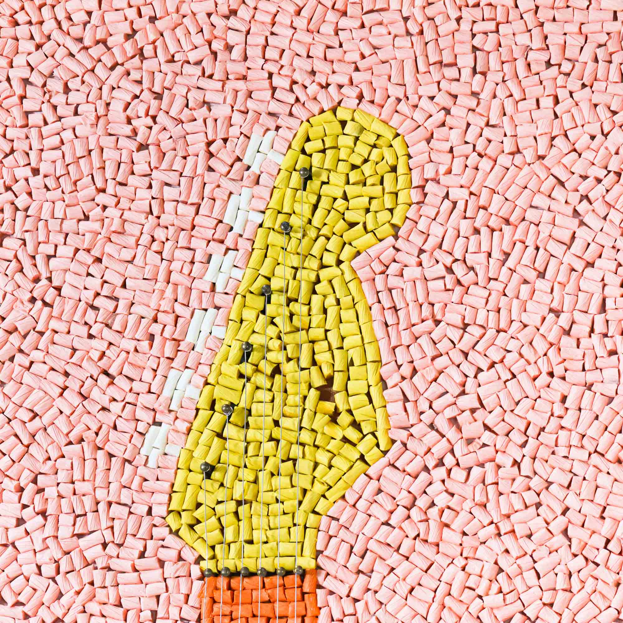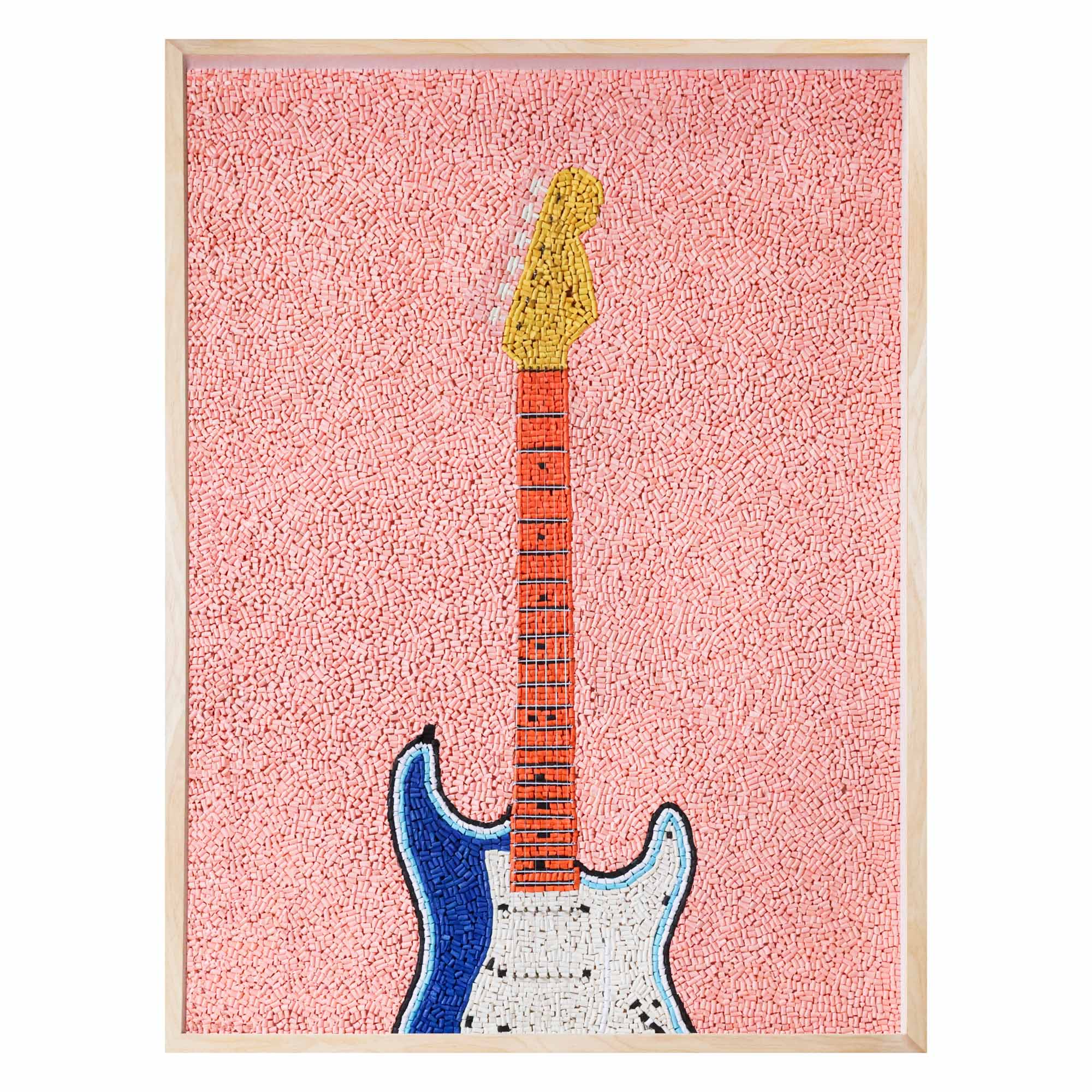 From the Tat Frederick studio, the Guitar Series features tiny pieces of painted rope that have been arranged by hand and mounted in an iconic guitar design. Hand placed wire, string and pins make up the other guitar details. Framed in wood with a plexiglass frame.